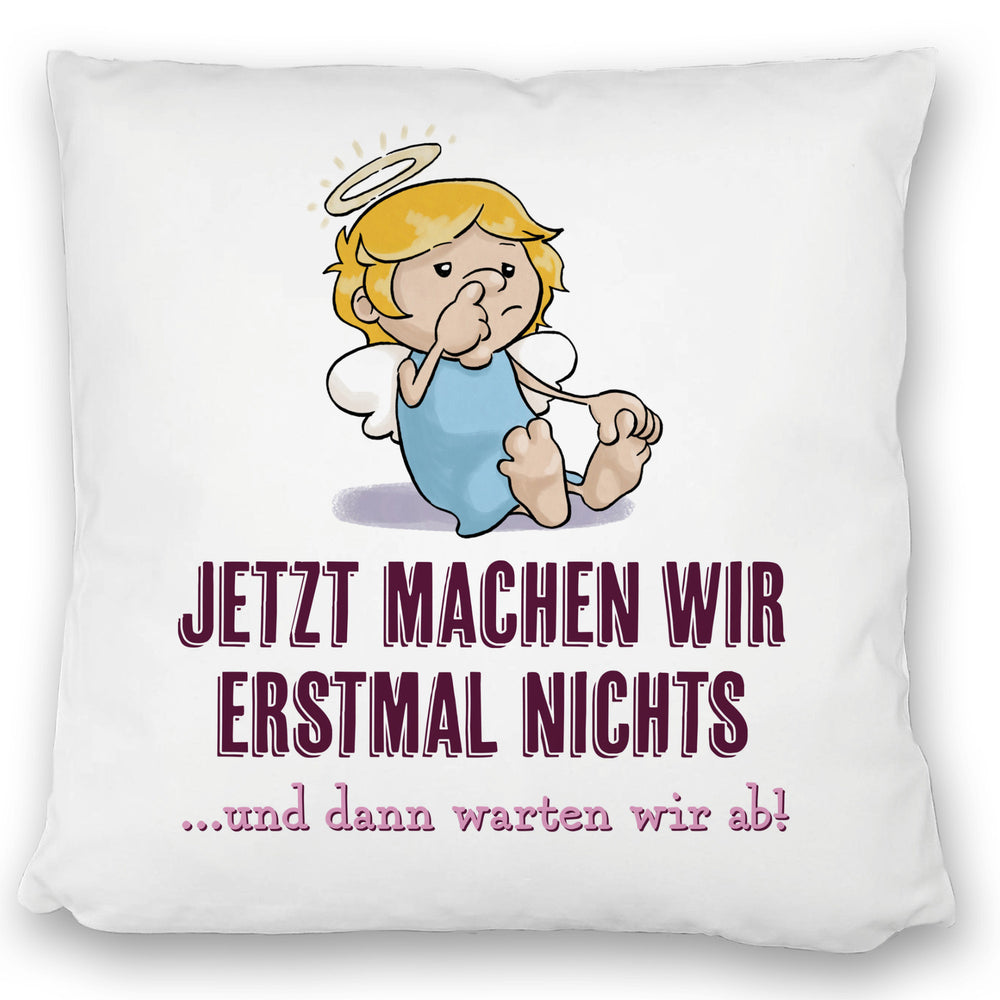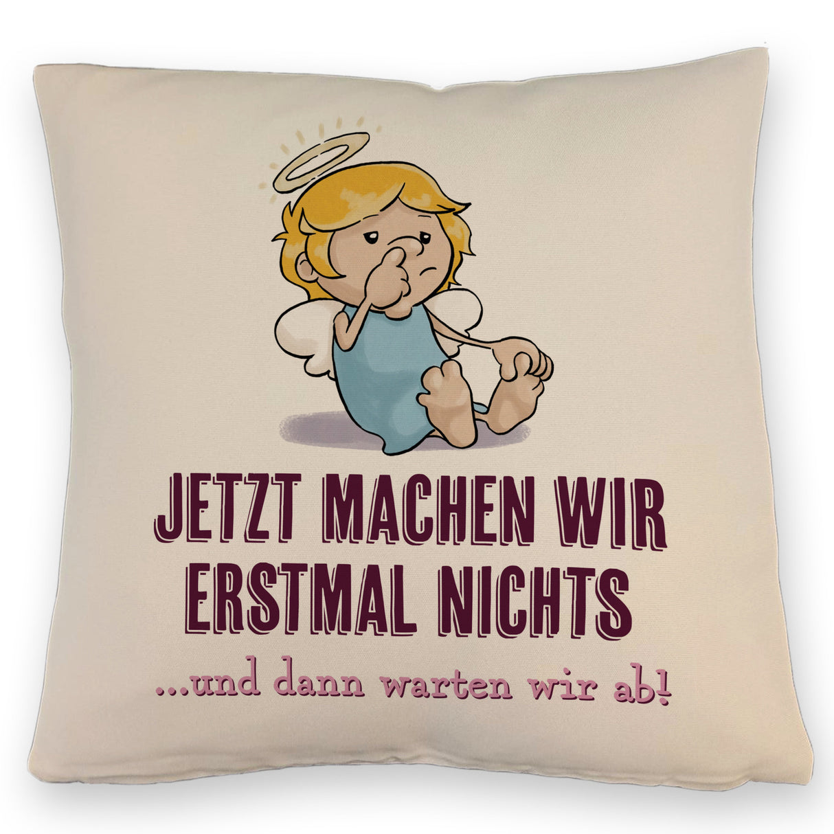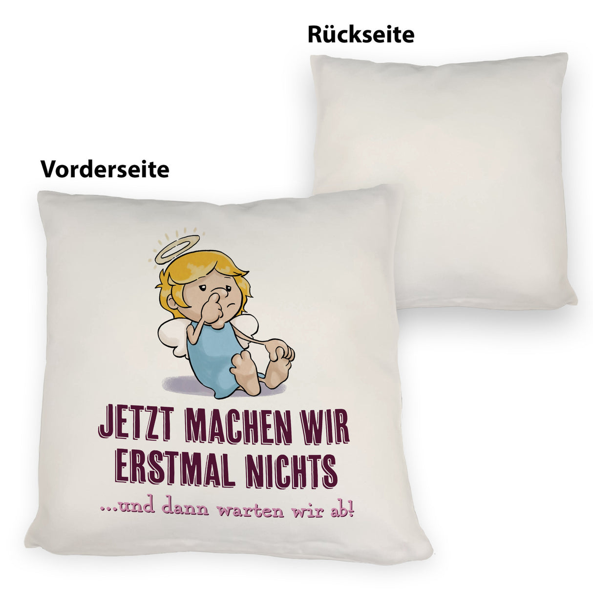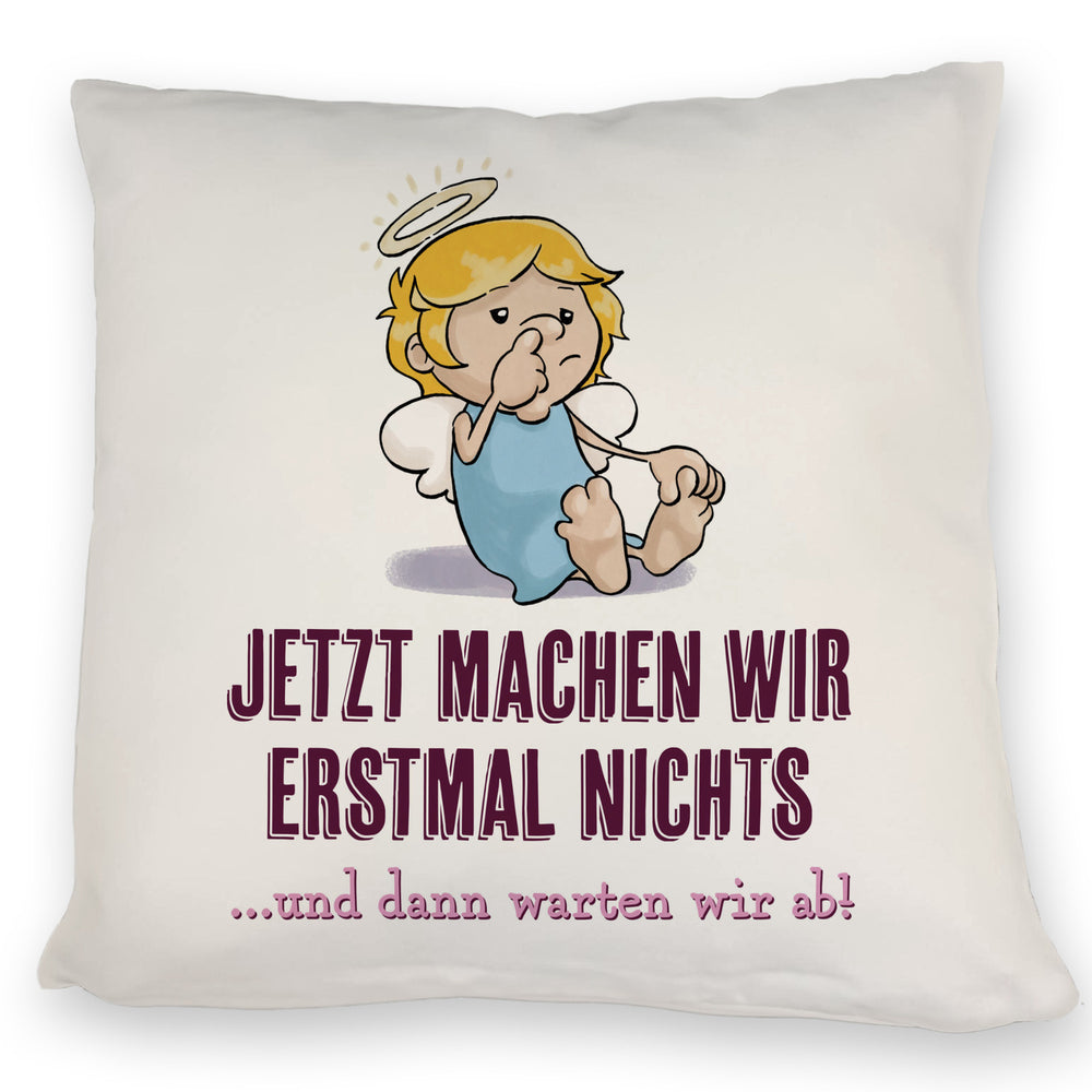 - Dieses neckische Kissen mit Engel Motiv ist eine fantastische Geschenkidee für jeden Scherzkeks zum Geburtstag. Auf dem Artikel steht der witzige und ironische Spruch: Jetzt machen wir erstmal nichts und dann warten wir ab. Darüber hinaus haben Sie ein schönes Dekokissen.
