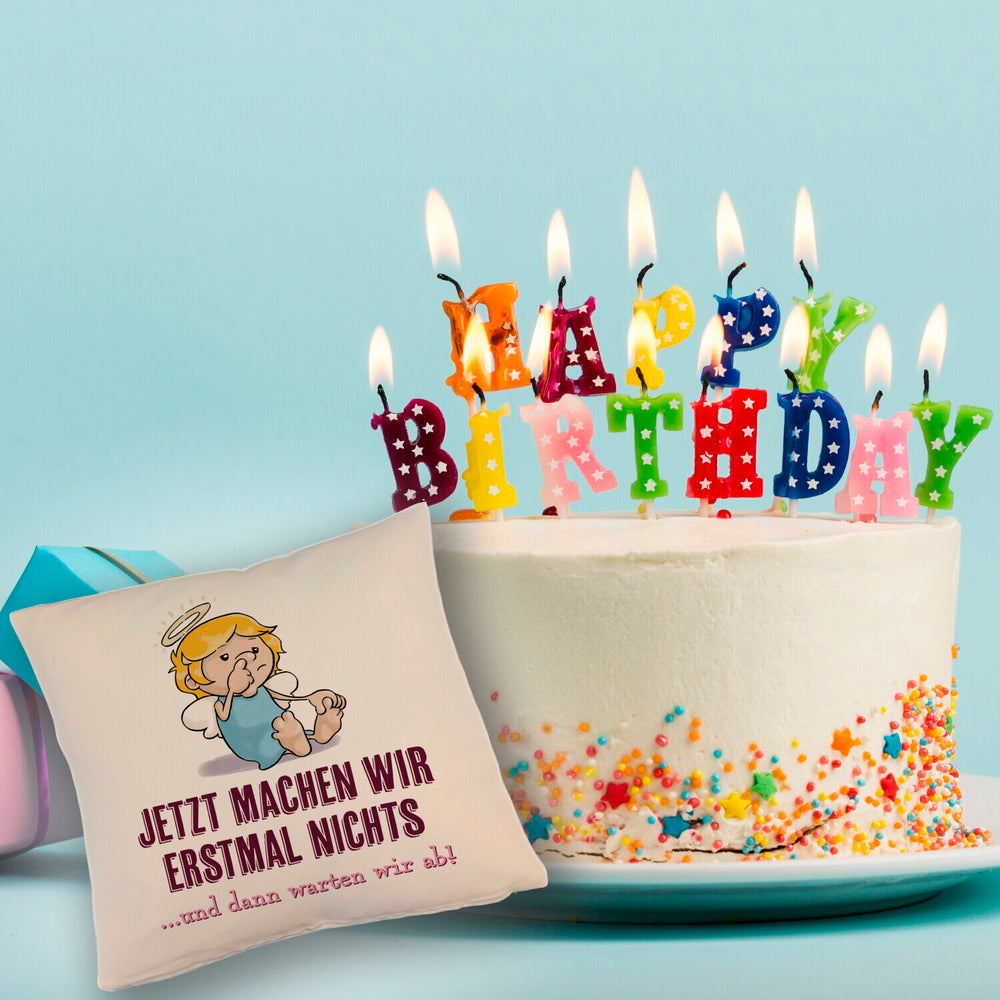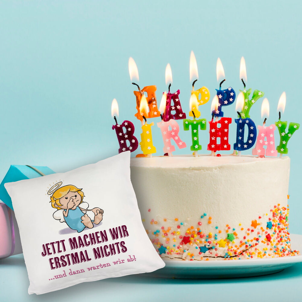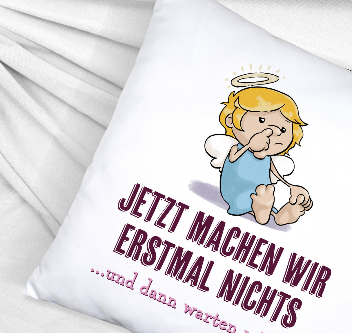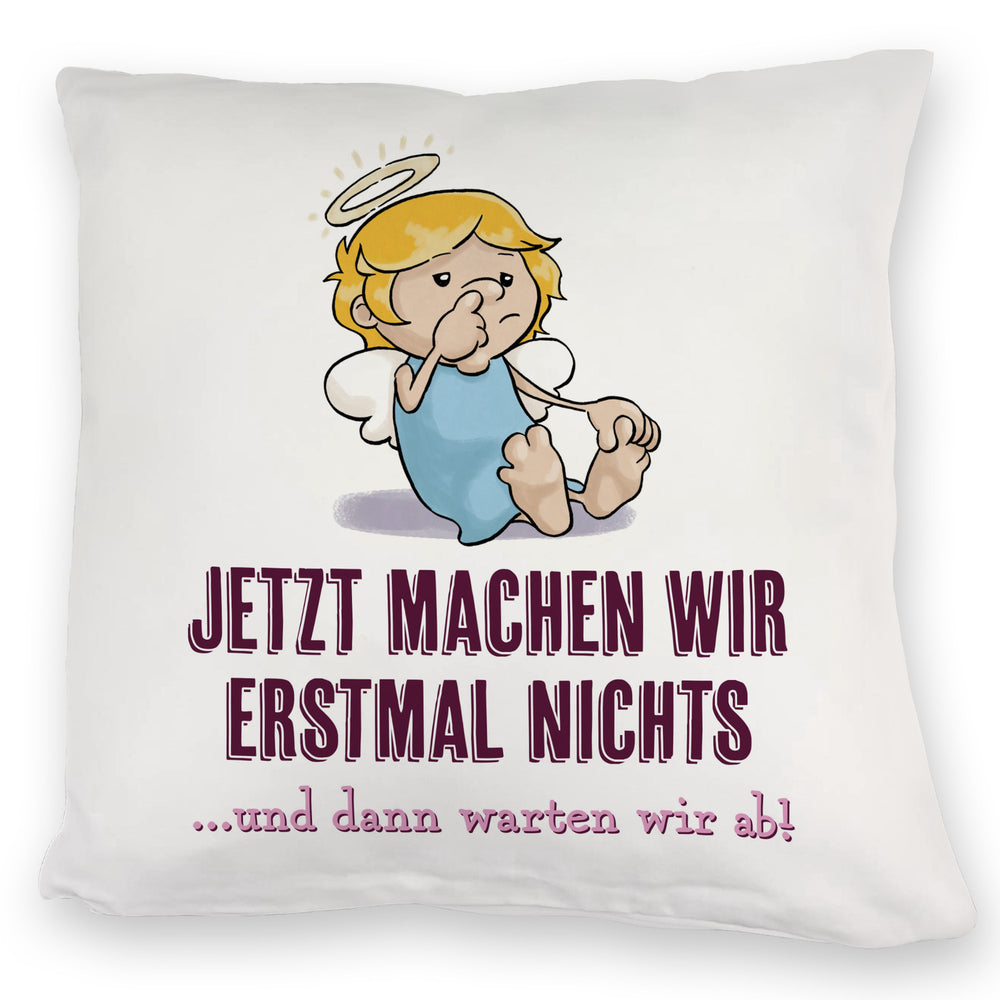 - Dieses neckische Kissen mit Engel Motiv ist eine fantastische Geschenkidee für jeden Scherzkeks zum Geburtstag. Auf dem Artikel steht der witzige und ironische Spruch: Jetzt machen wir erstmal nichts und dann warten wir ab. Darüber hinaus haben Sie ein schönes Dekokissen.