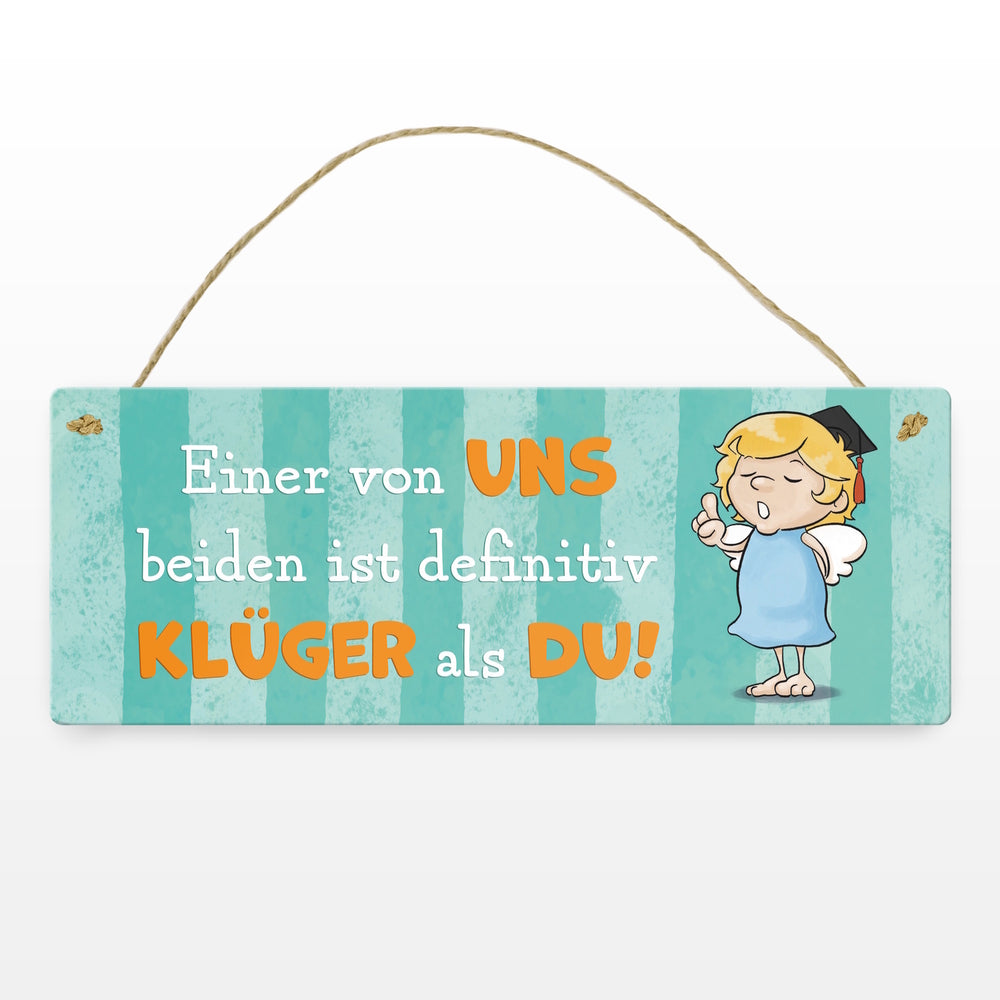 - Wenn Sie auf der Suche nach einem amüsanten und originellen Geschenk für Ihren Lieblingsscherzkeks sind, dann könnte dieses neckische Metallschild mit Engelmotiv die Lösung sein. Auf dem Artikel steht der witzige Spruch: Einer von uns beiden ist definitiv klüger als du!.