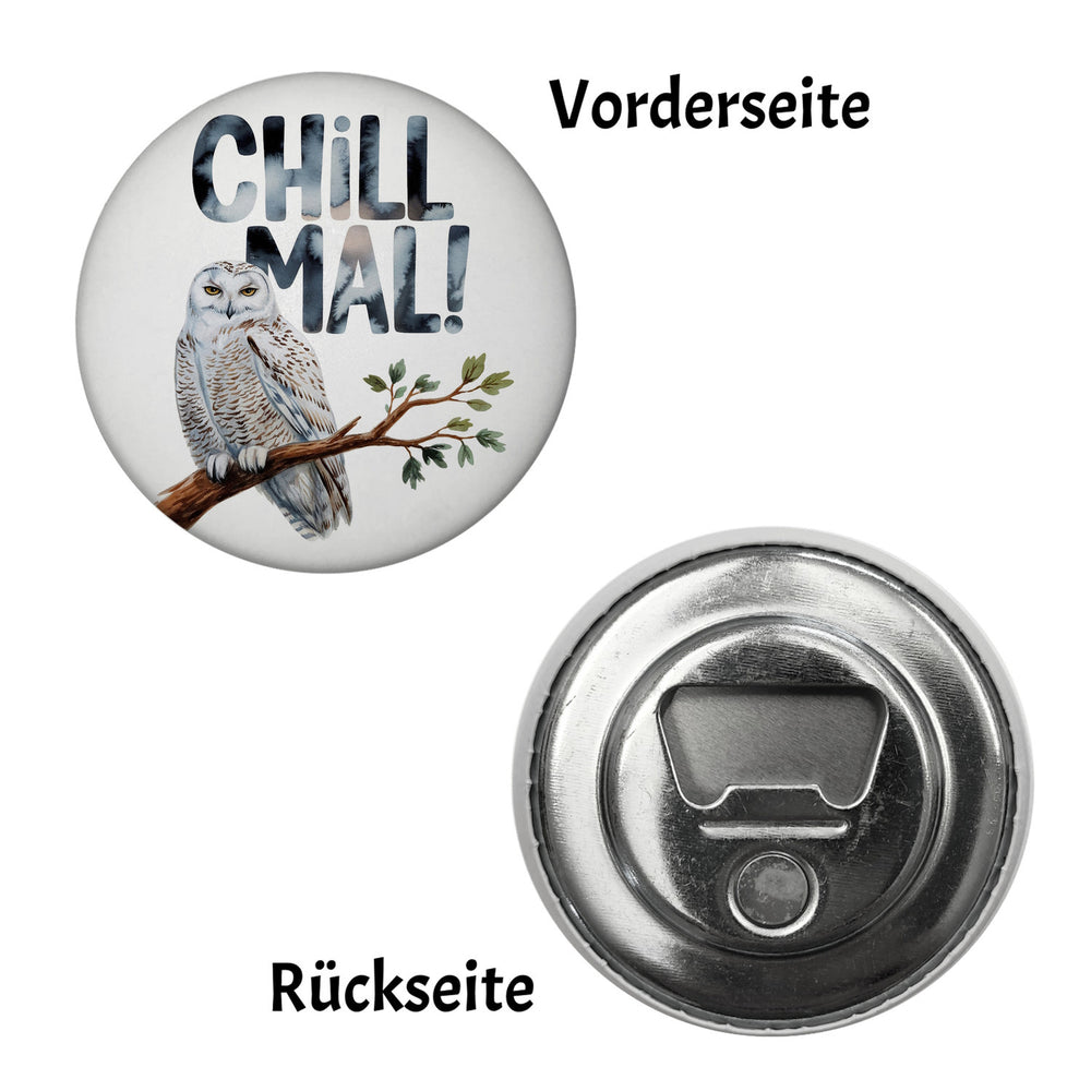 - Der runde Magnet zeigt eine entspannte Schneeeule auf einem Ast. In pastellfarbenen Aquarelltönen steht "CHILL MAL!" auf dem weißen Hintergrund. Die Eule mit ihrem weißen Gefieder und den scharfen gelben Augen verleiht dem Design eine fantasievolle und beruhigende Note.