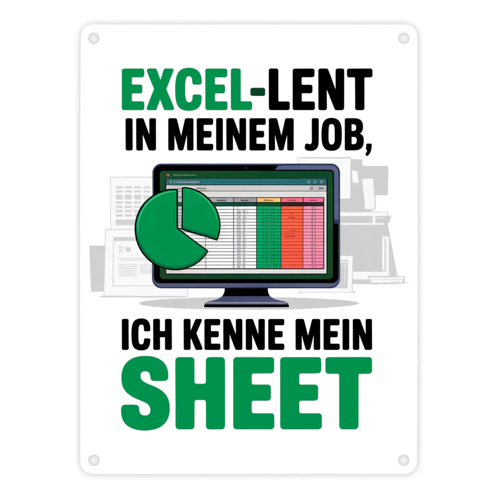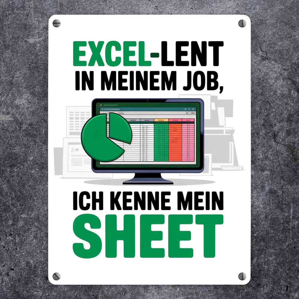 - Dieses Metallschild besticht durch ein humorvolles Büromotiv, das Excel-Profis ein Lächeln ins Gesicht zaubert. Es zeigt einen schicken schwarzen Computermonitor auf weißem Hintergrund, der eine lebendige Tabellenkalkulation mit einem grünen Tortendiagramm darstellt. Verspielte Schriftzüge in Grün und Schwarz runden das Design ab.