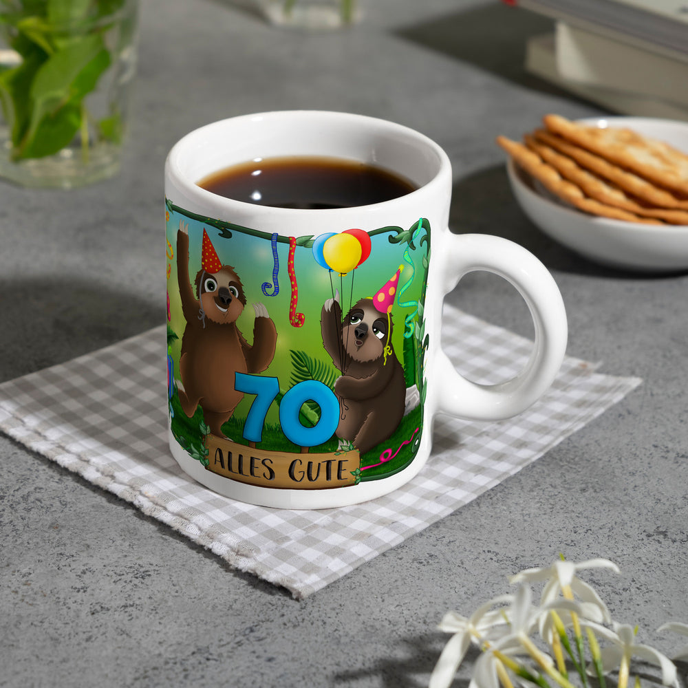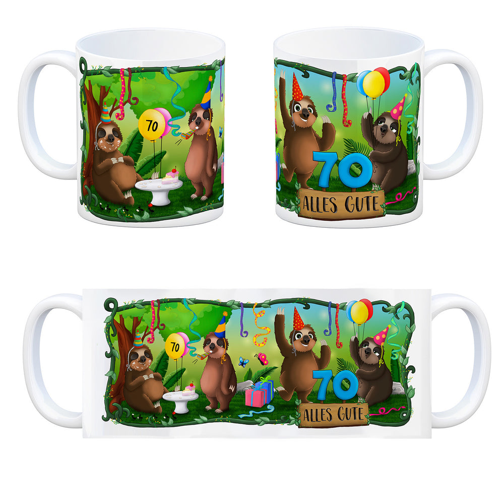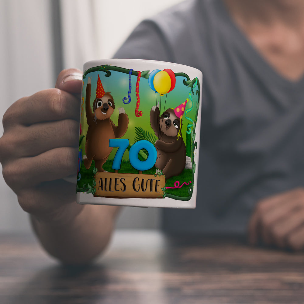 - Die Tasse zeigt eine lustige Faultier Geburtstagsparty und enthält den Schriftzug Happy Birthday und alles Gute zum 70. Geburtstag
