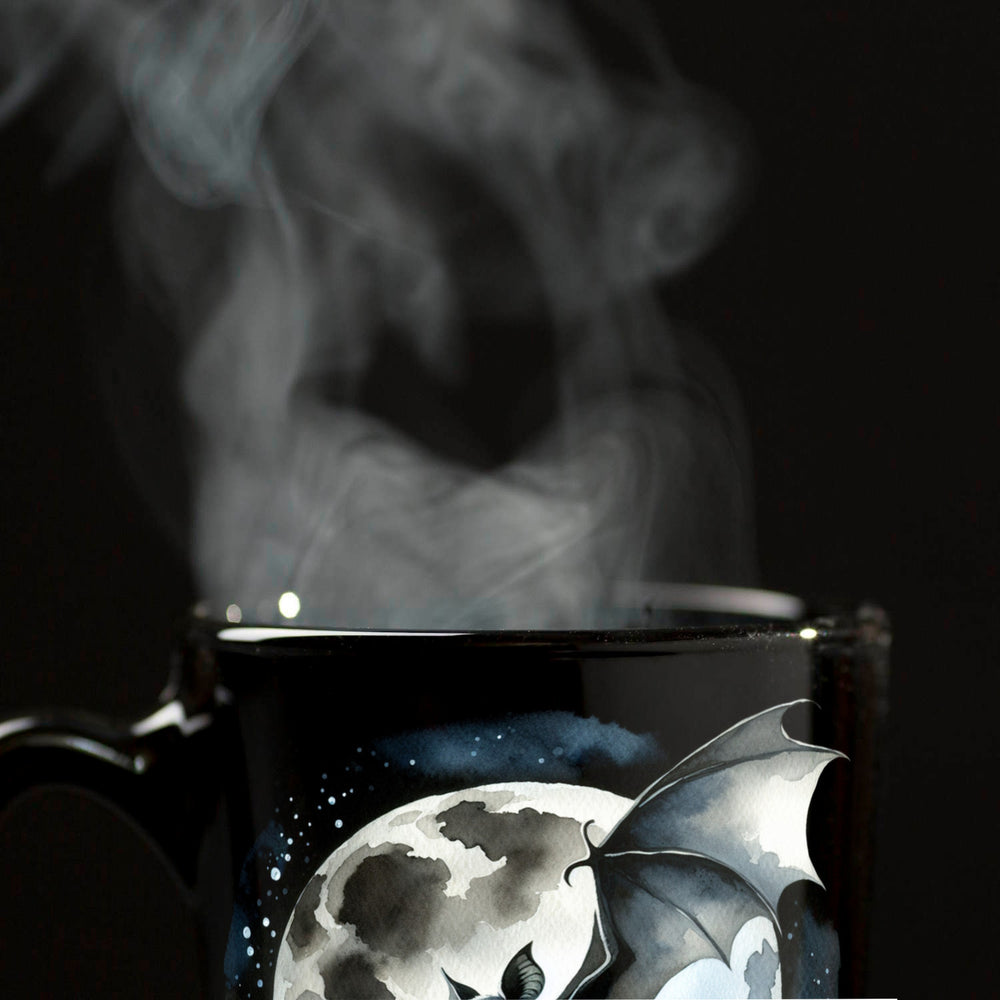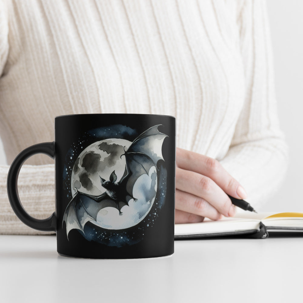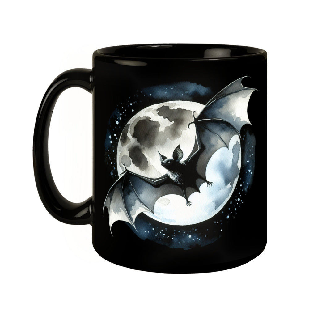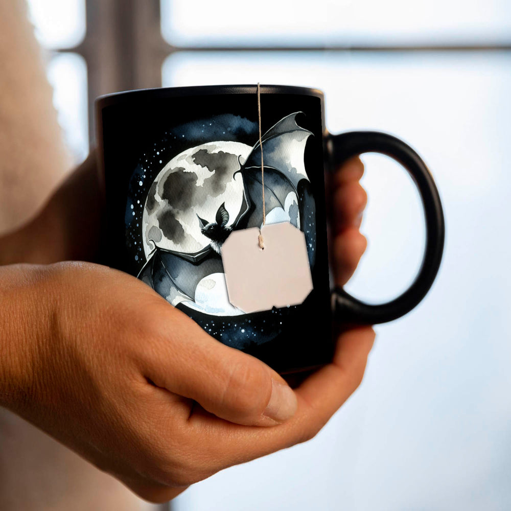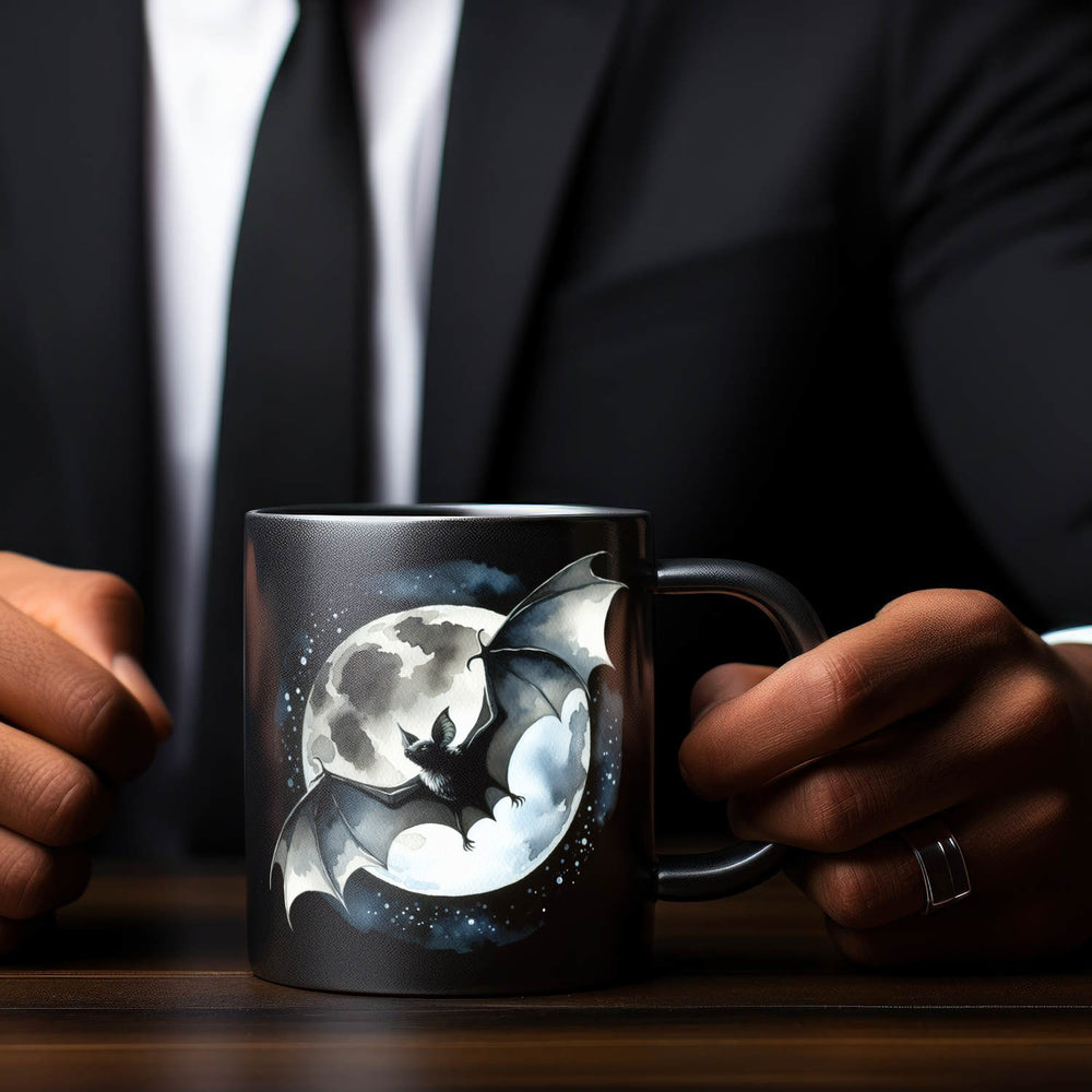 • Genieße deinen nächtlichen Tee oder Kaffee mit dieser Tasse, die mit einer eleganten Silhouette einer Fledermaus unter dem Mondlicht verziert ist. Ein echter Hingucker für alle Nachtschwärmer und Fledermaus-Fans!