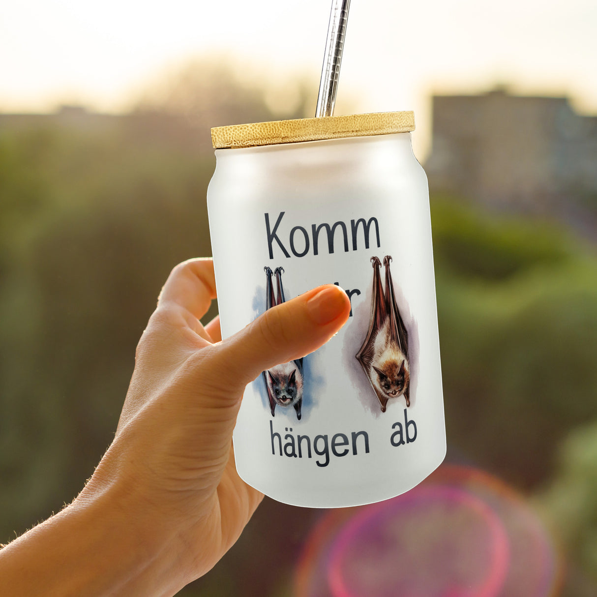 - Das Trinkglas zeigt zwei originelle Fledermäuse, die kopfüber baumelnd und zwinkernd auf einem hellblau-rosafarbenen Hintergrund hängen. Der Spruch „Komm, wir hängen ab“ in typografischer Aquarell-Pastelloptik lädt zu heiteren Stunden ein. Die detaillierte Darstellung der Fledermäuse bringt Humor und Fantasie in jedes Getränk.