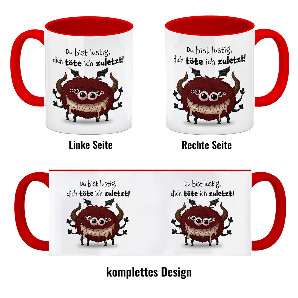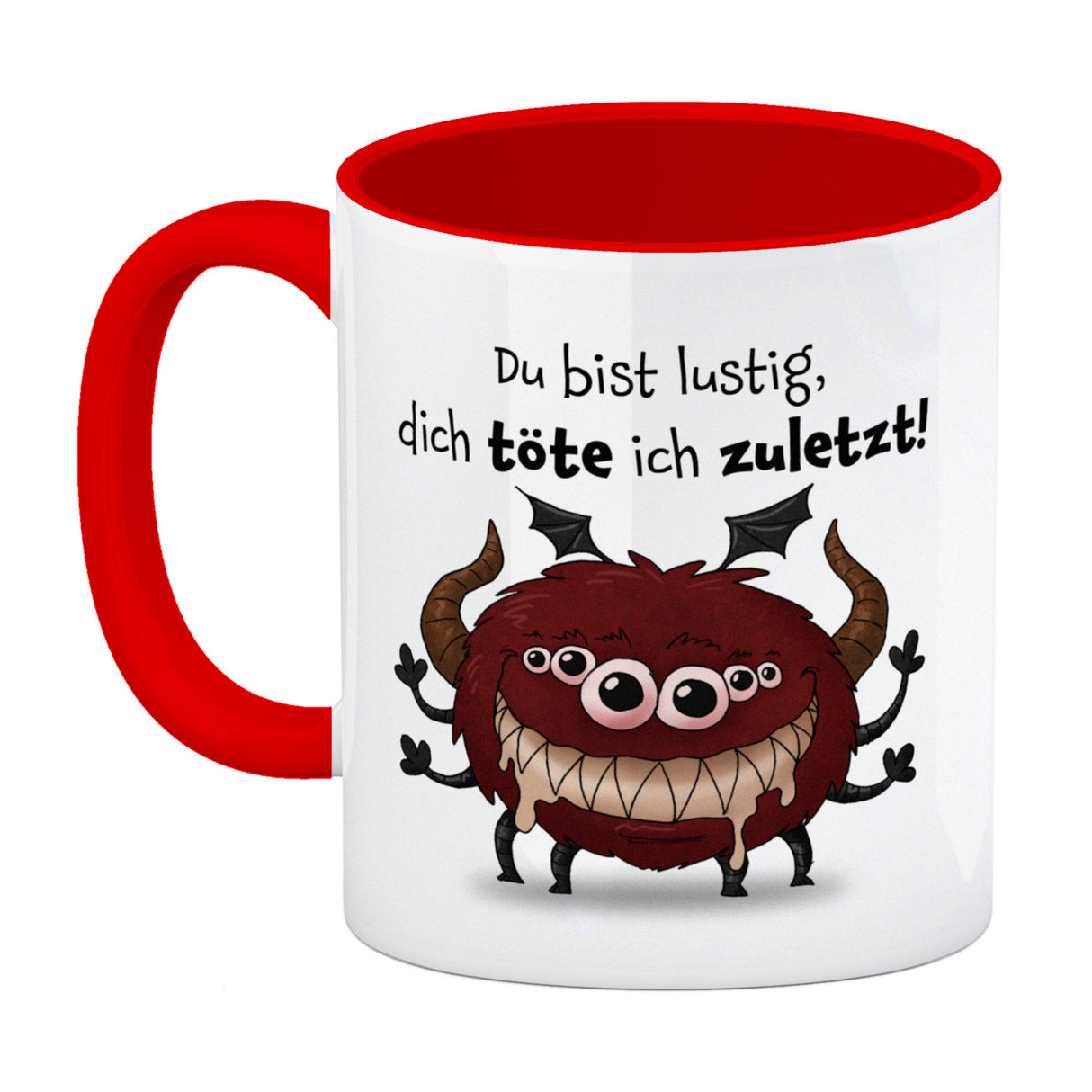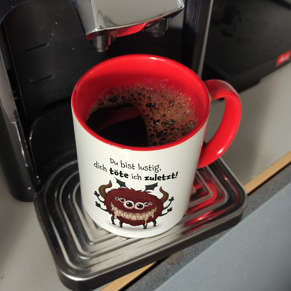 Freches Monster in hellrot Kaffeebecher mit lustigem Spruch