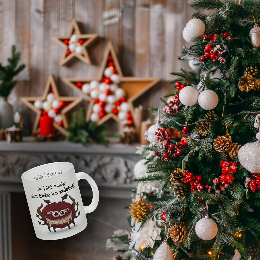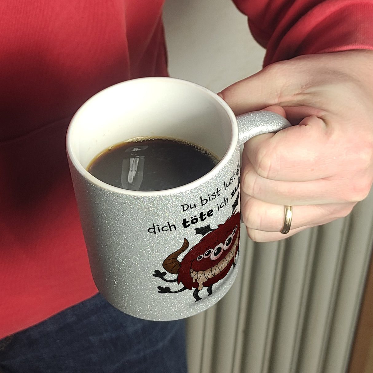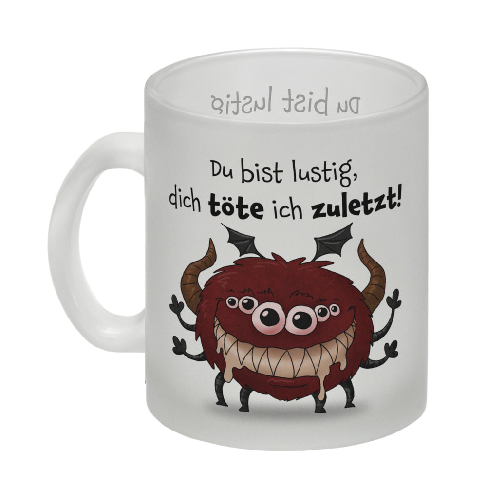 Freches Monster in hellrot Kaffeebecher mit lustigem Spruch