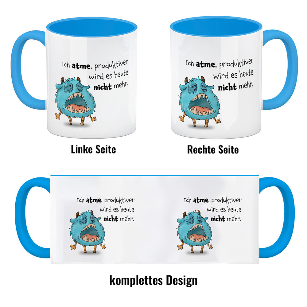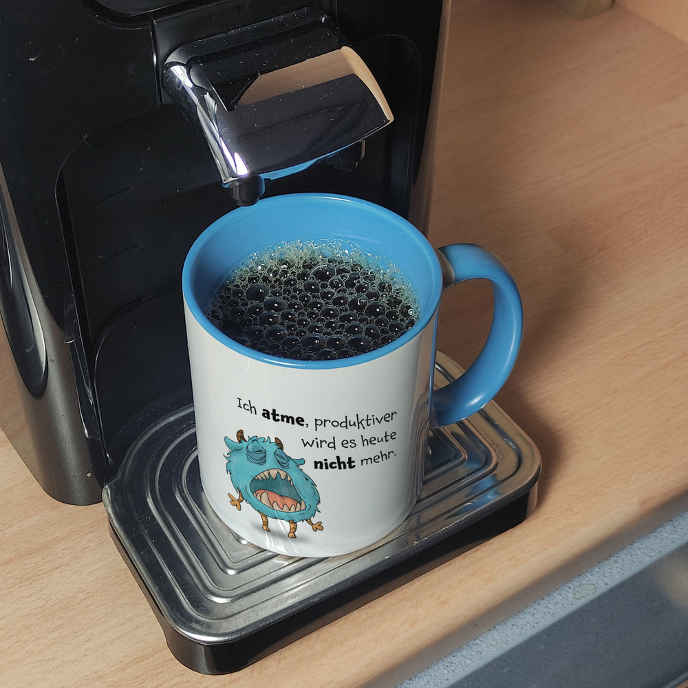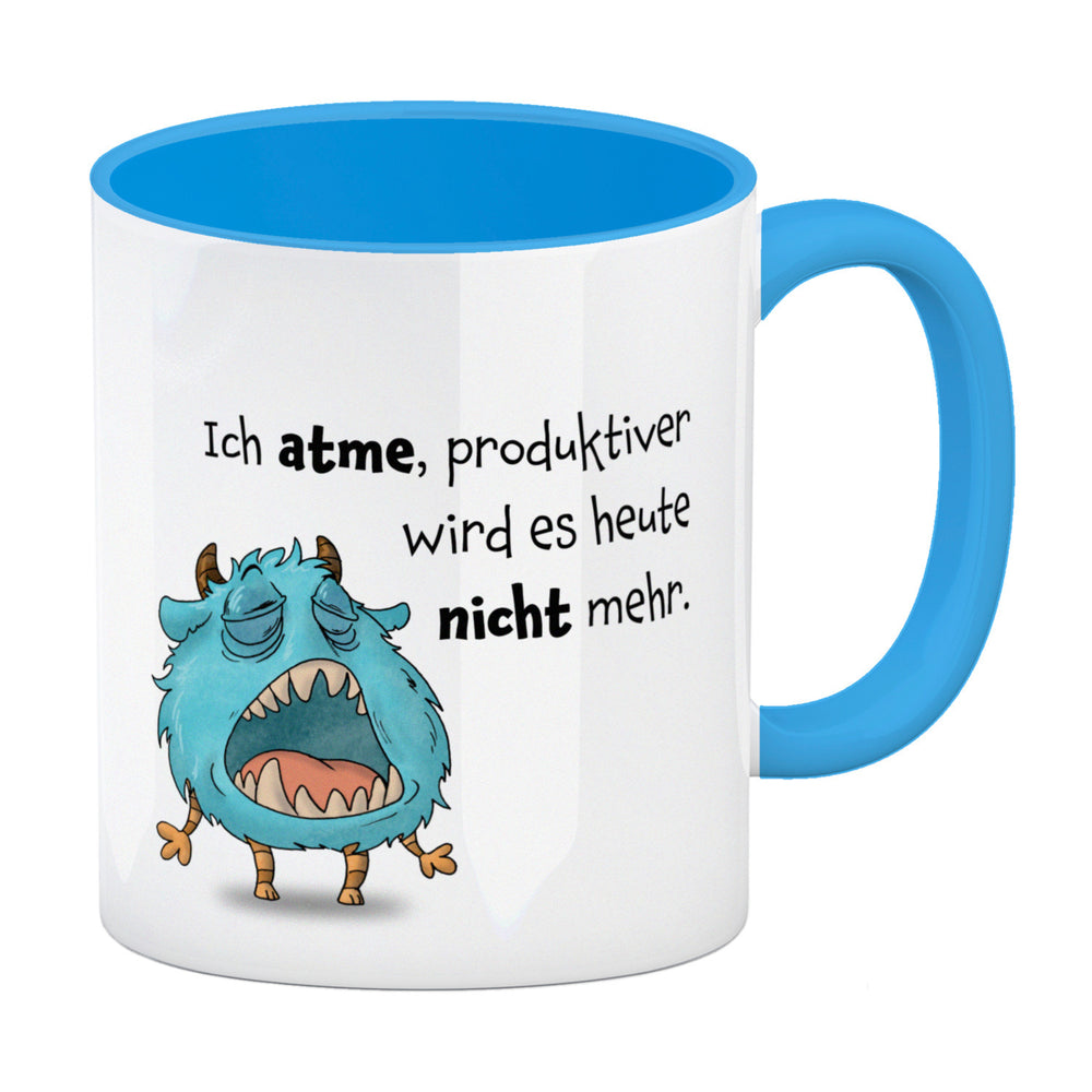 Freches Monster in hellblau Kaffeebecher mit lustigem Spruch