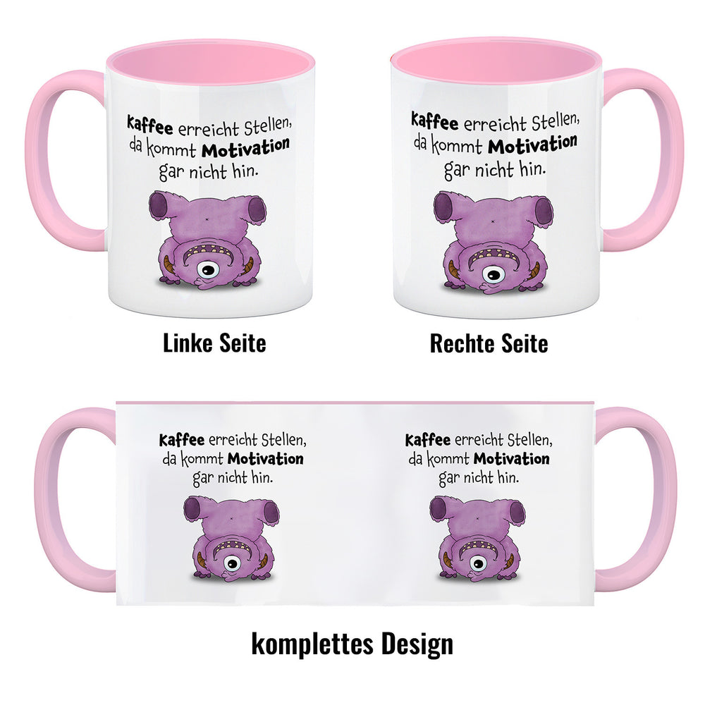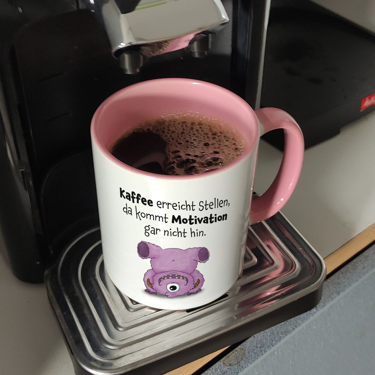 Freches Monster in rosa Kaffeebecher mit lustigem Spruch