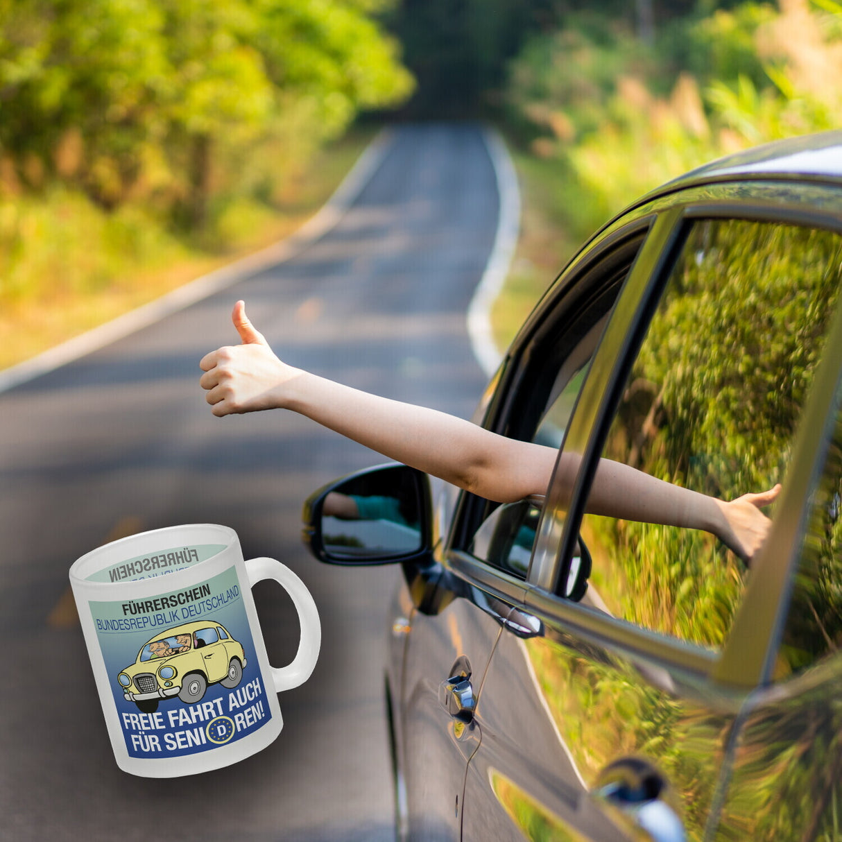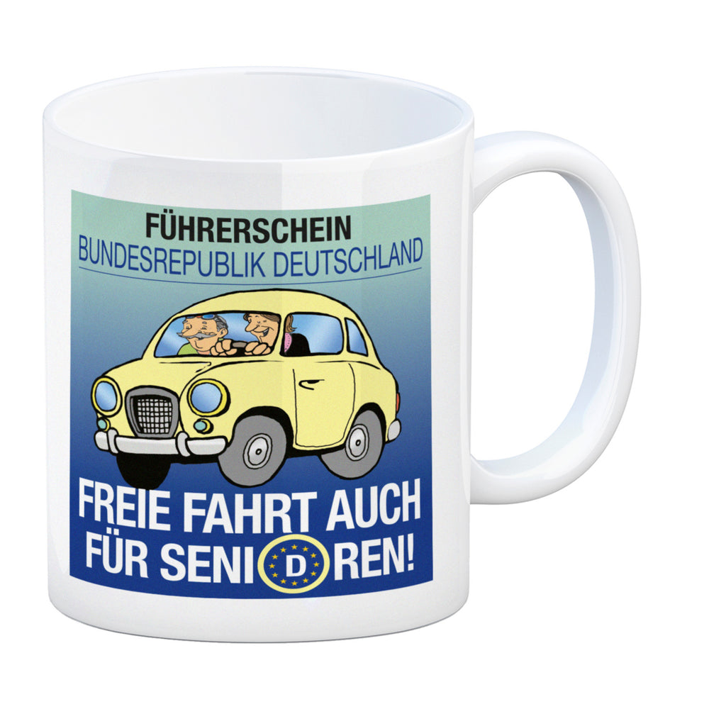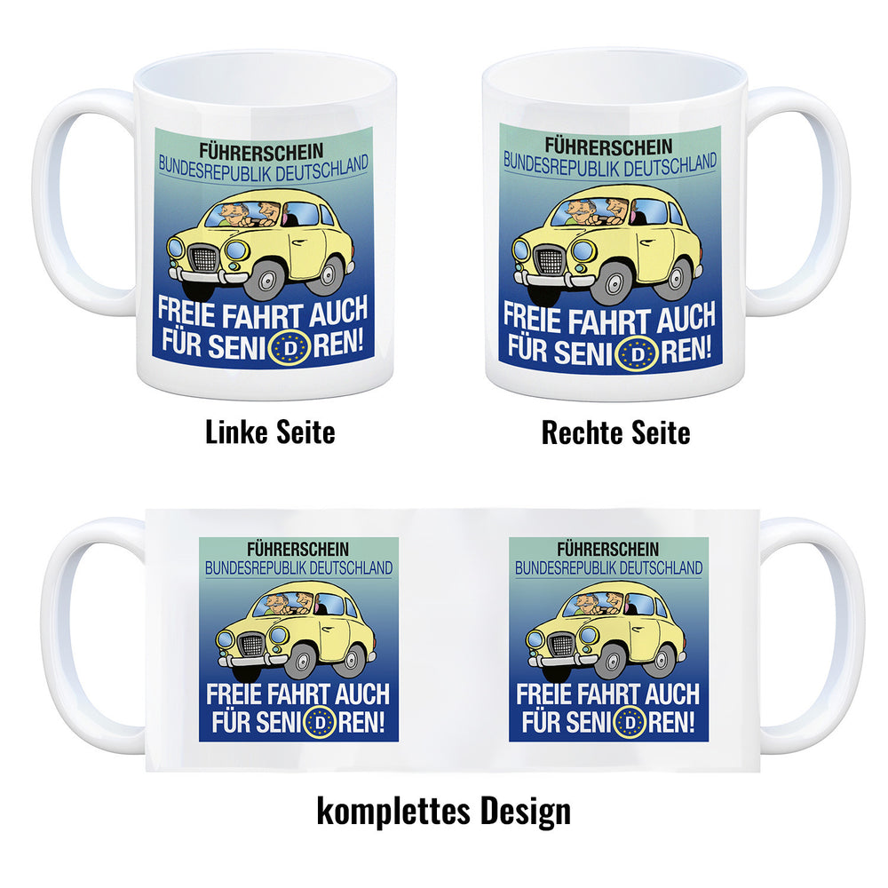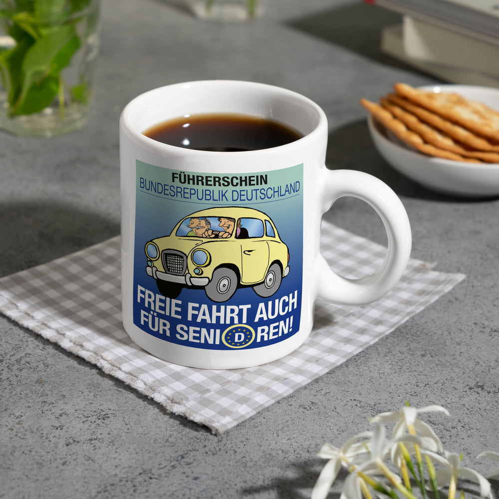 - 1x Freie Fahrt auch für Senioren Kaffeebecher mit Oldtimer Motiv in der gewählten Ausführung