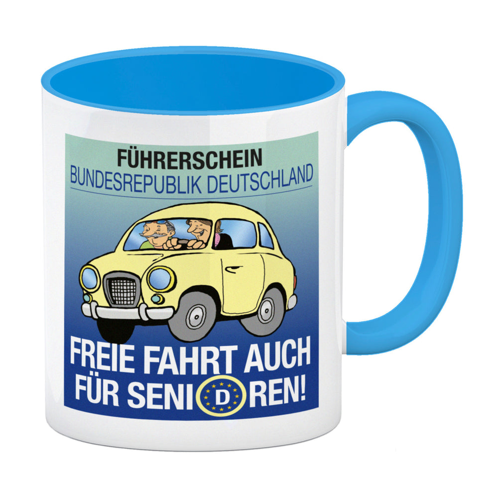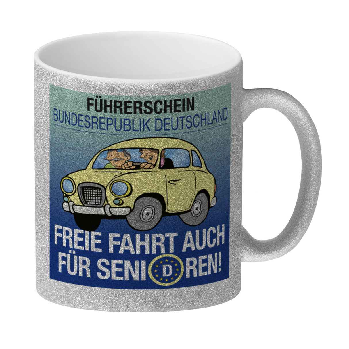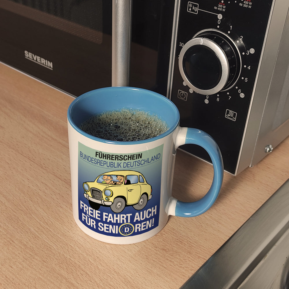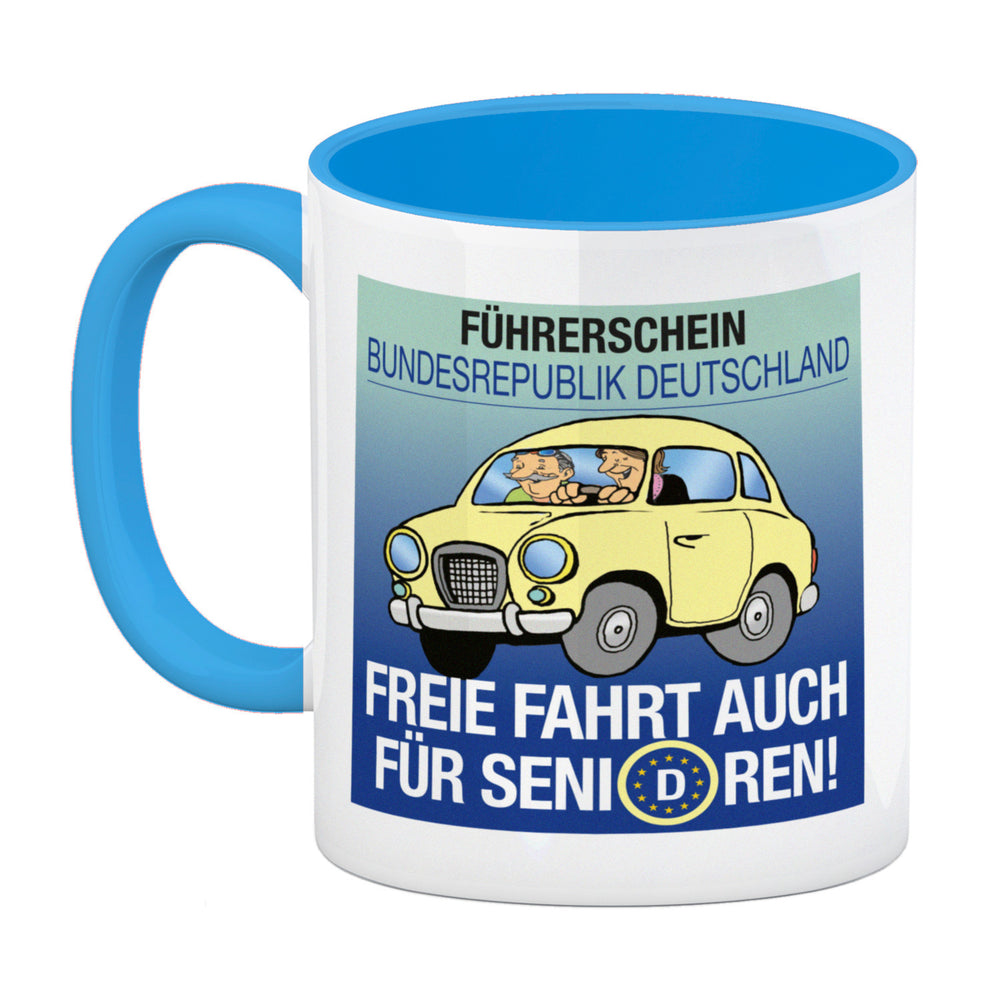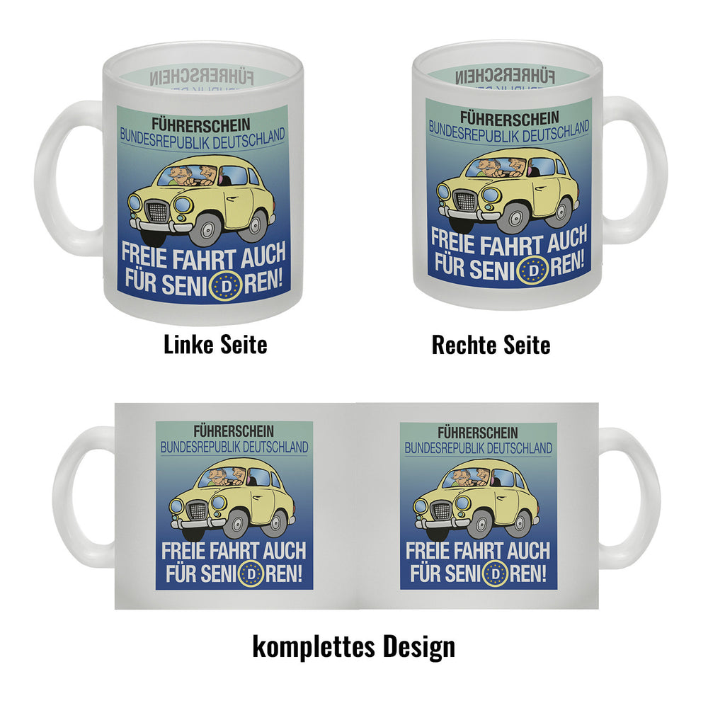 - 1x Freie Fahrt auch für Senioren Kaffeebecher mit Oldtimer Motiv in der gewählten Ausführung