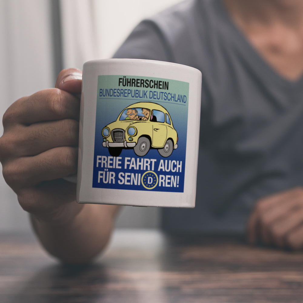 Freie Fahrt auch für Senioren Kaffeebecher mit Oldtimer Motiv