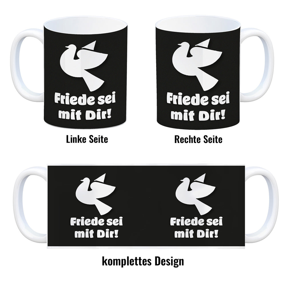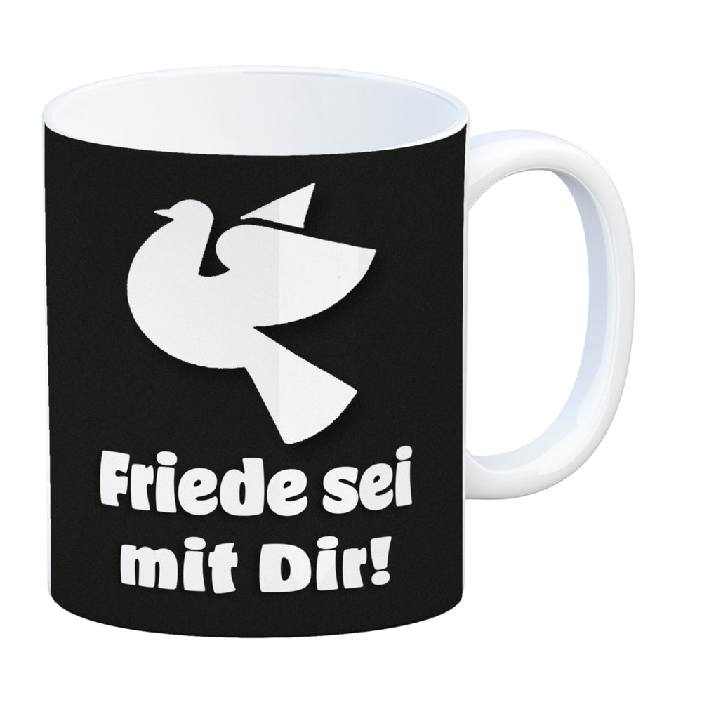- 1x Friedenstaube Kaffeebecher mit Spruch Friede sei mit Dir -weiß in der gewählten Ausführung