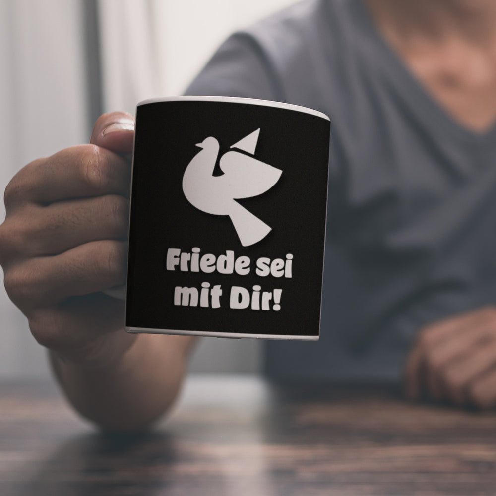 Friedenstaube Kaffeebecher mit Spruch Friede sei mit Dir -weiß
