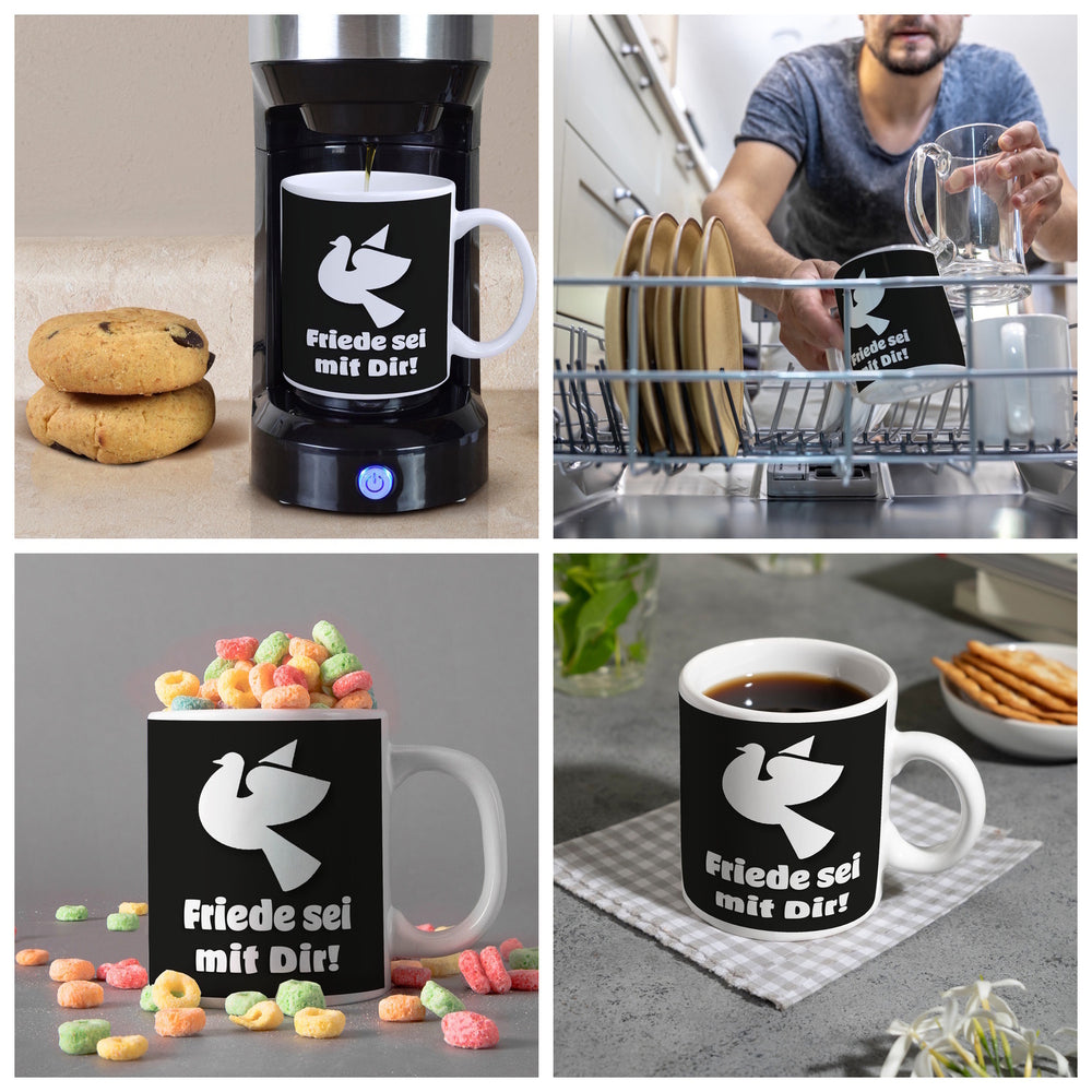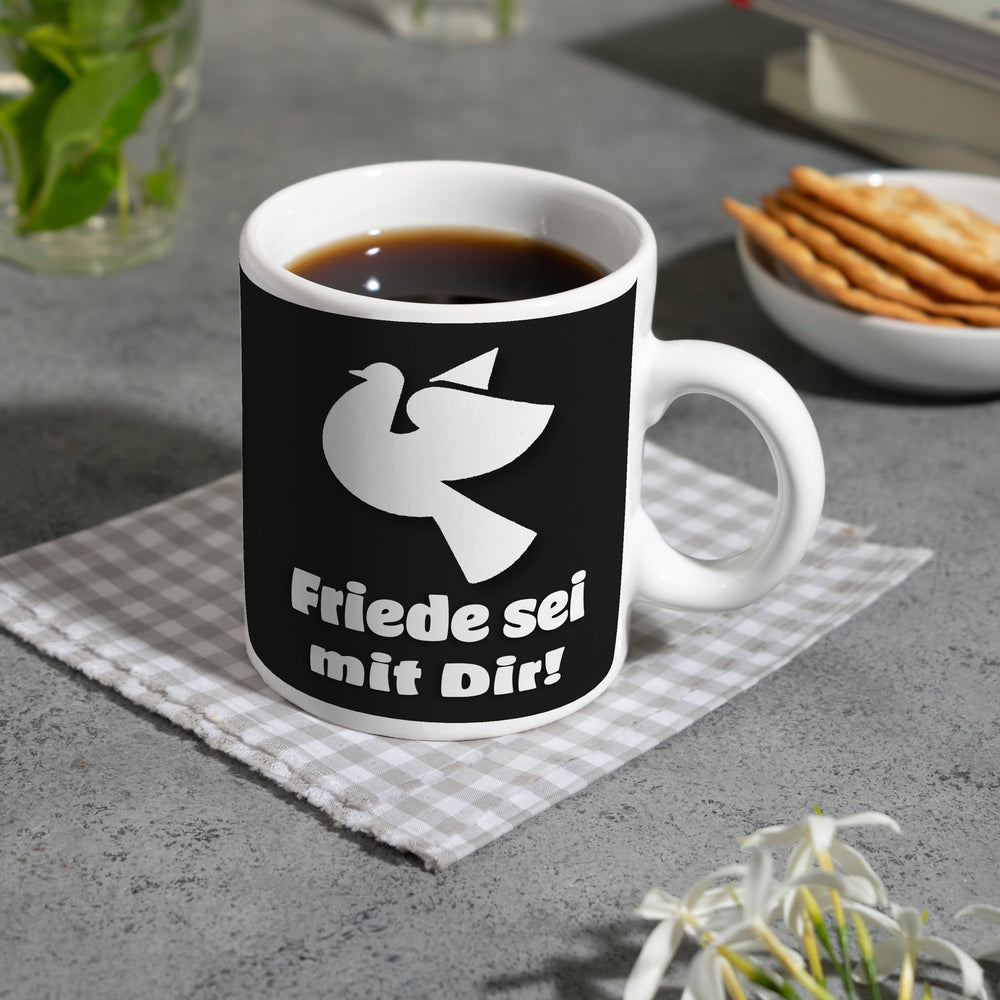 Friedenstaube Kaffeebecher mit Spruch Friede sei mit Dir -weiß - Weiß / Schwarz ist auf Lager und wird versandt, sobald es wieder verfügbar ist