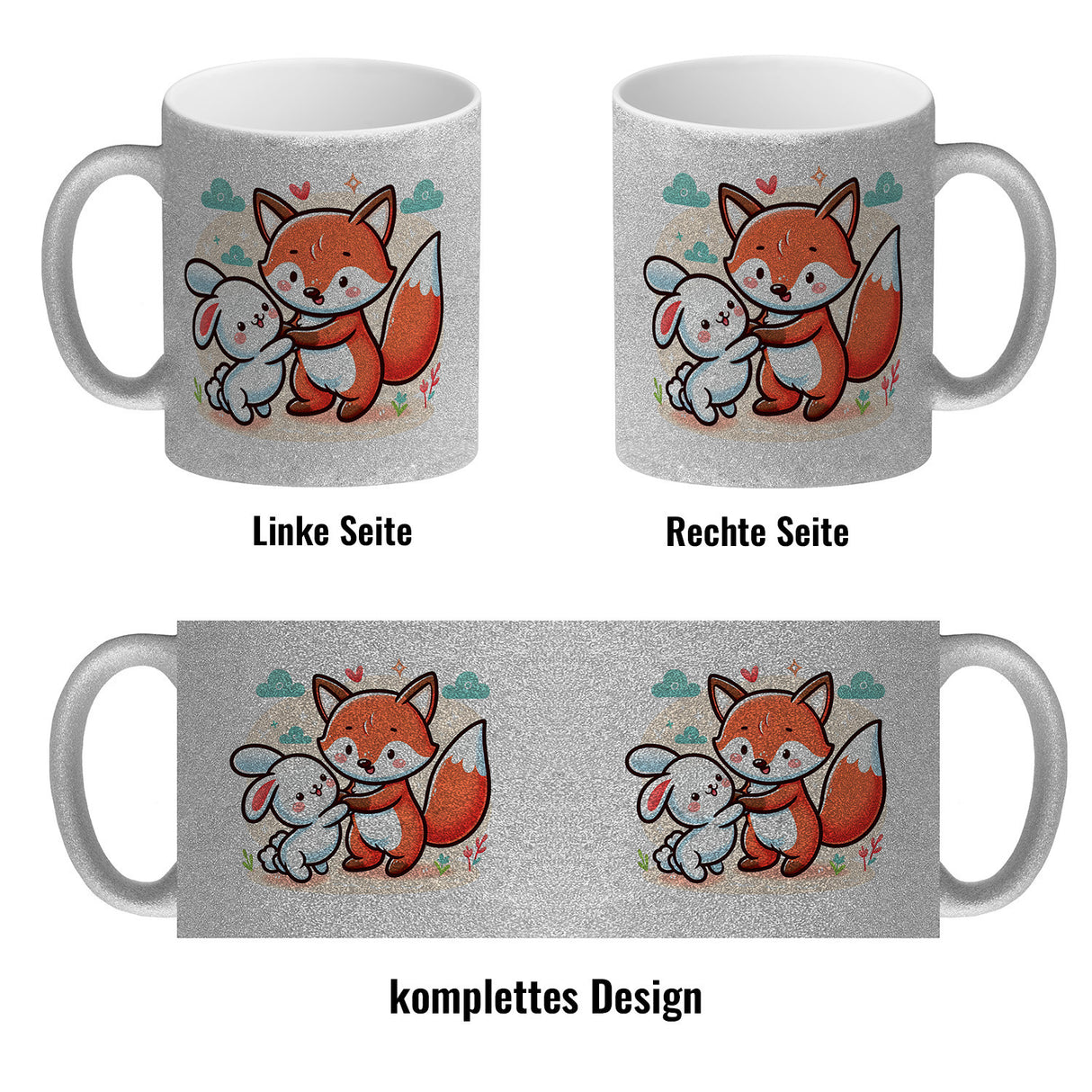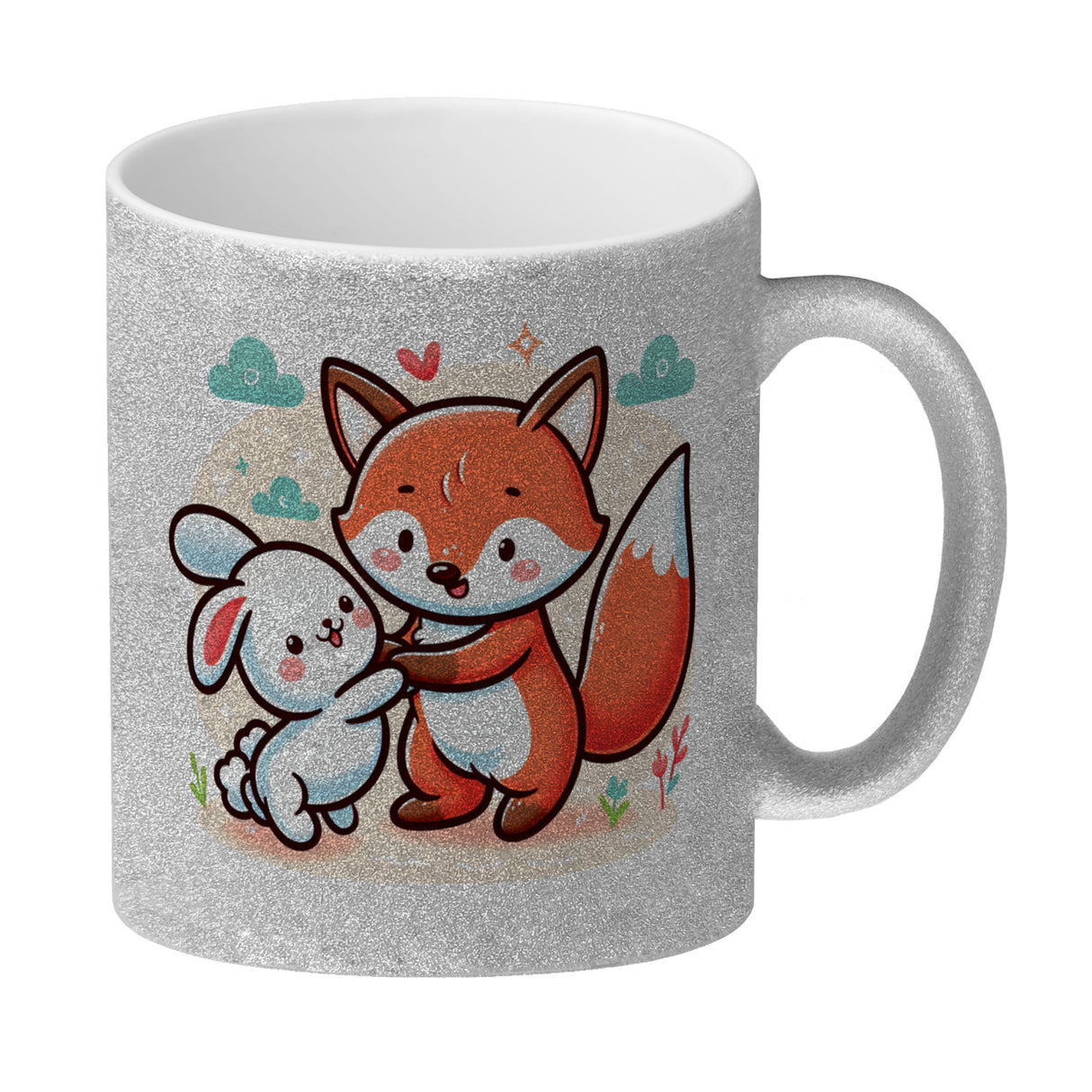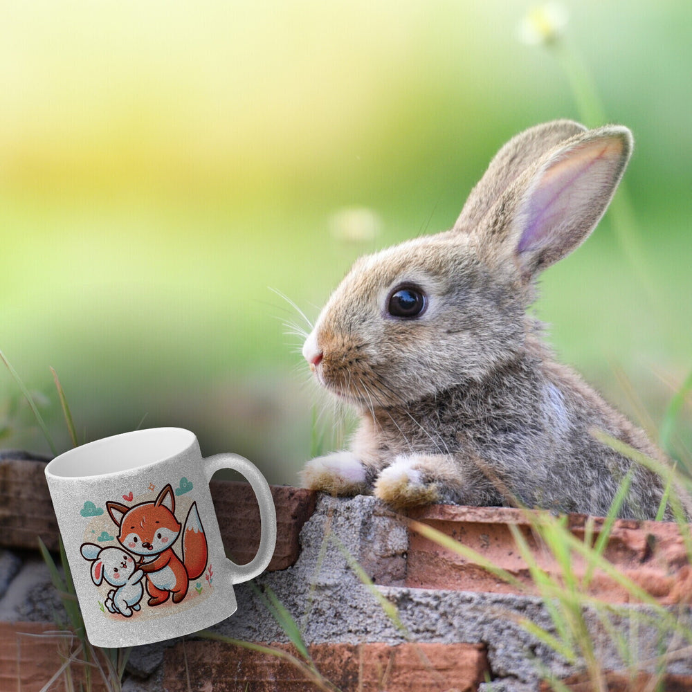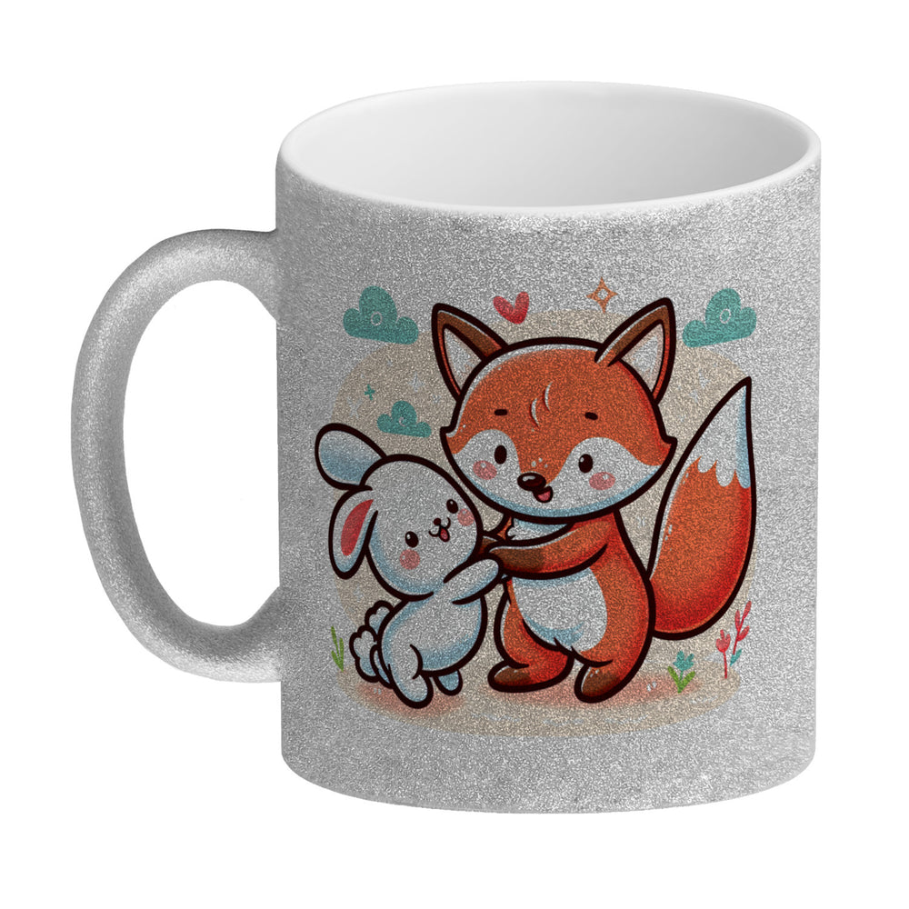 Stell dir vor, du sitzt an einem frischen Morgen in deiner gemütlichen Küche und aus deinem neuen Fuchs und Kaninchen Kaffeebecher lächeln dir zwei der süßesten Waldbewohner zu. Erwache mit dem Charme des Waldes und lasse dich von unserem putzigen Duo aus Fuchs und Hase begleiten. Tierliebhaber aufgepasst: Dieser Mehr-als-nur-ein-Kaffeebecher wird deine Morgenroutine revolutionieren! Mit seiner zauberhaften Komposition aus Spiel und Freundschaft verleiht er jedem Schluck eine extra Portion Liebe.Vergiss den Becher mit dem langweiligen Firmenlogo; unser Fuchs und Kaninchen-Gefährte wird dir mit seinem entzückenden Motiv und der liebevollen Ausführung ein morgendliches Grinsen ins Gesicht zaubern. Ein Hoch auf Individualität und feine Qualität, denn unser Becher ist sorgfältig bedruckt in den besten Manufakturen Deutschlands!Egal, ob du dich für die klassische weiße Tasse entscheidest, die farbenfrohe Version mit farbigem Henkel und Innenseite wählst, die edle Glastasse bevorzugst oder die exklusive Silberedition mit Glitzereffekt – dieser Becher ist dein treuer Begleiter durch alle Jahreszeiten. Er ist das perfekte Geschenk für die Tierfreunde in deinem Leben und eine wunderbare Erinnerung an die Natur – reiche den Becher weiter und teile das Gefühl von Freundschaft und Glück!