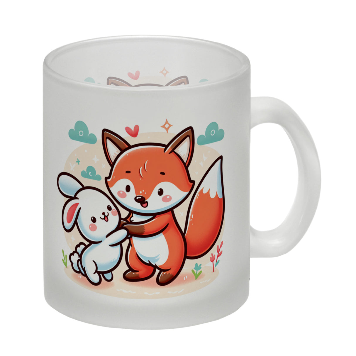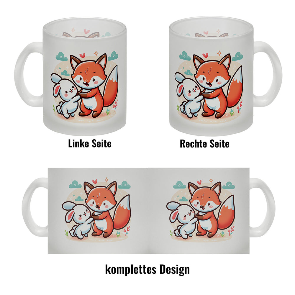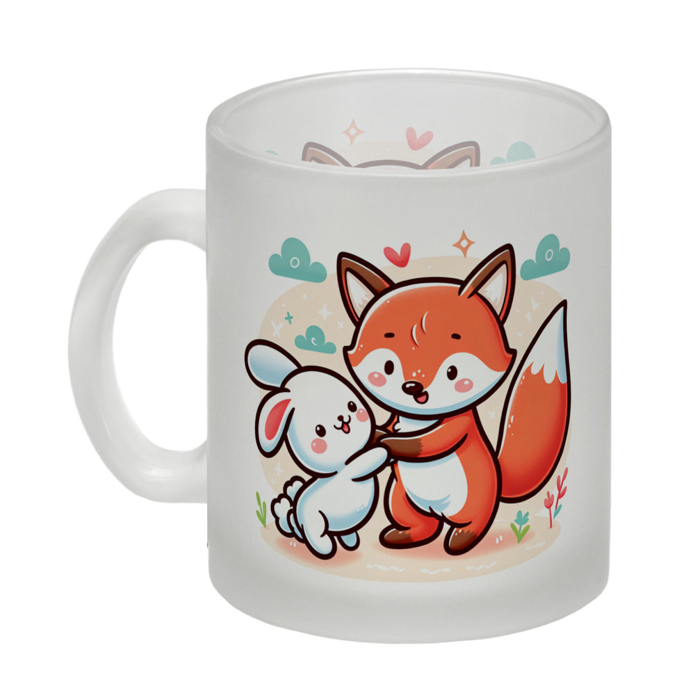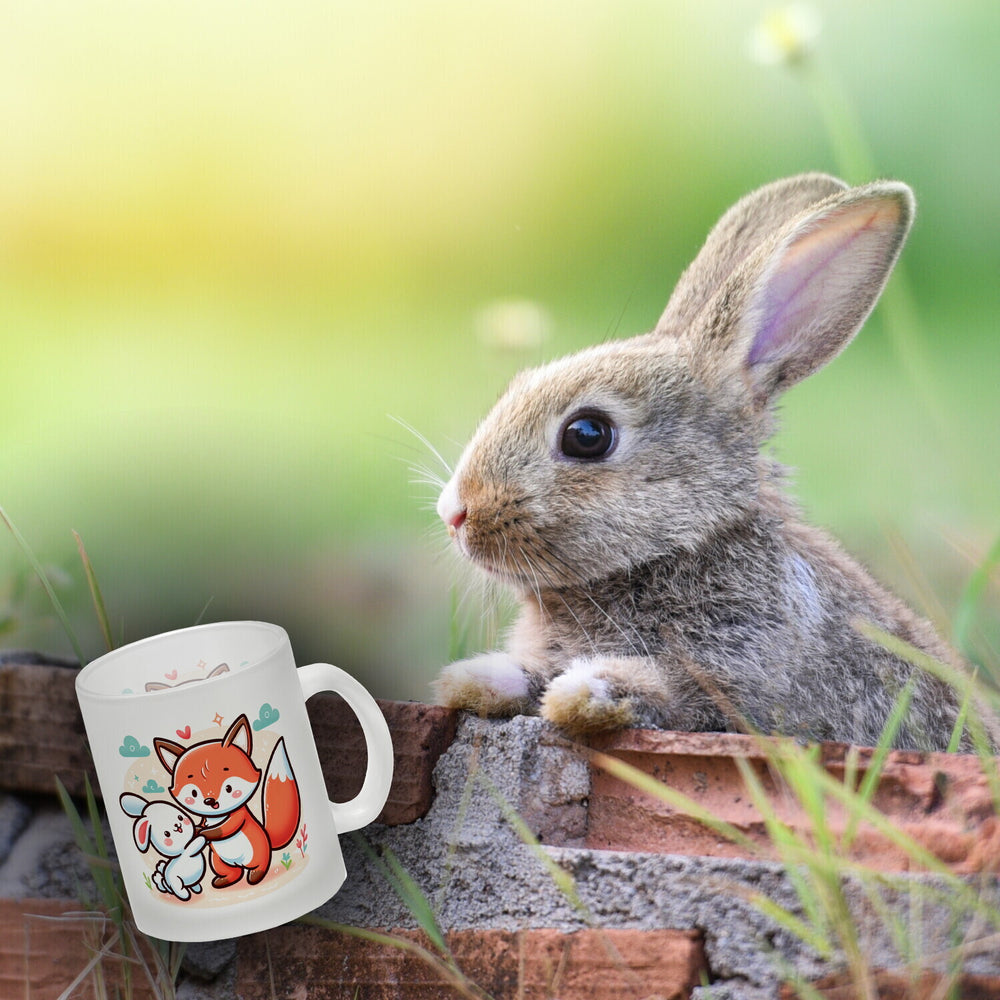 Stell dir vor, du sitzt an einem frischen Morgen in deiner gemütlichen Küche und aus deinem neuen Fuchs und Kaninchen Kaffeebecher lächeln dir zwei der süßesten Waldbewohner zu. Erwache mit dem Charme des Waldes und lasse dich von unserem putzigen Duo aus Fuchs und Hase begleiten. Tierliebhaber aufgepasst: Dieser Mehr-als-nur-ein-Kaffeebecher wird deine Morgenroutine revolutionieren! Mit seiner zauberhaften Komposition aus Spiel und Freundschaft verleiht er jedem Schluck eine extra Portion Liebe.Vergiss den Becher mit dem langweiligen Firmenlogo; unser Fuchs und Kaninchen-Gefährte wird dir mit seinem entzückenden Motiv und der liebevollen Ausführung ein morgendliches Grinsen ins Gesicht zaubern. Ein Hoch auf Individualität und feine Qualität, denn unser Becher ist sorgfältig bedruckt in den besten Manufakturen Deutschlands!Egal, ob du dich für die klassische weiße Tasse entscheidest, die farbenfrohe Version mit farbigem Henkel und Innenseite wählst, die edle Glastasse bevorzugst oder die exklusive Silberedition mit Glitzereffekt – dieser Becher ist dein treuer Begleiter durch alle Jahreszeiten. Er ist das perfekte Geschenk für die Tierfreunde in deinem Leben und eine wunderbare Erinnerung an die Natur – reiche den Becher weiter und teile das Gefühl von Freundschaft und Glück!