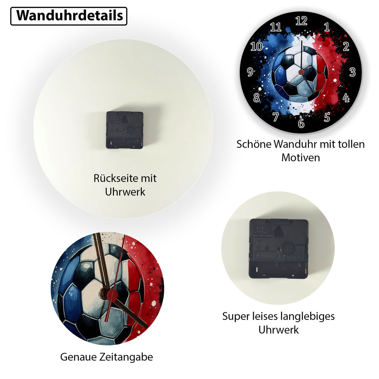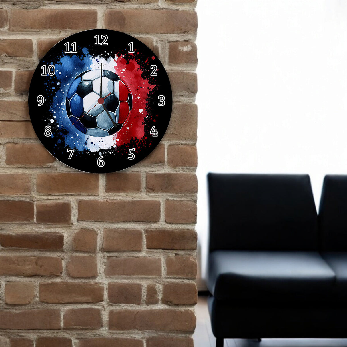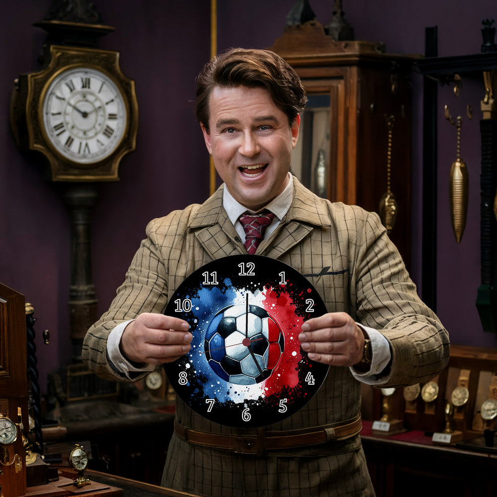 - Tick-tock, Fußball-Fans! Diese sportliche Wanduhr bringt die EM 2024 direkt in dein Wohnzimmer. Die Frankreich Flagge in Blau, Weiß und Rot hüllt einen Ball ein und lässt jedes Fan-Herz höherschlagen. Perfekt für alle, die den Fußball lieben und stolz auf Les Bleus sind!