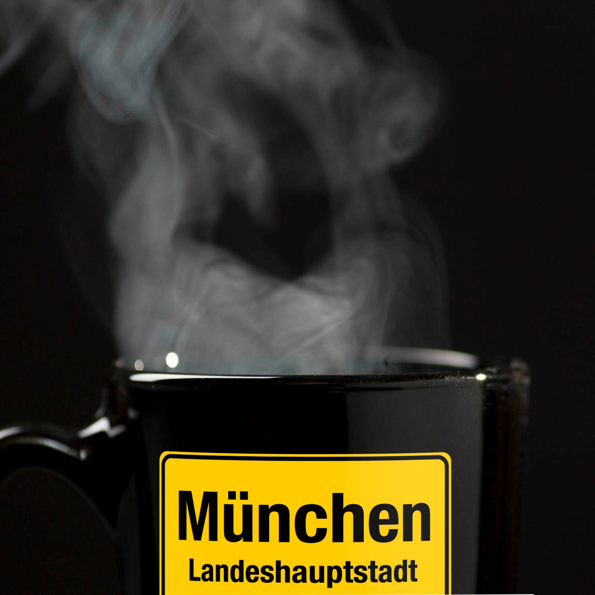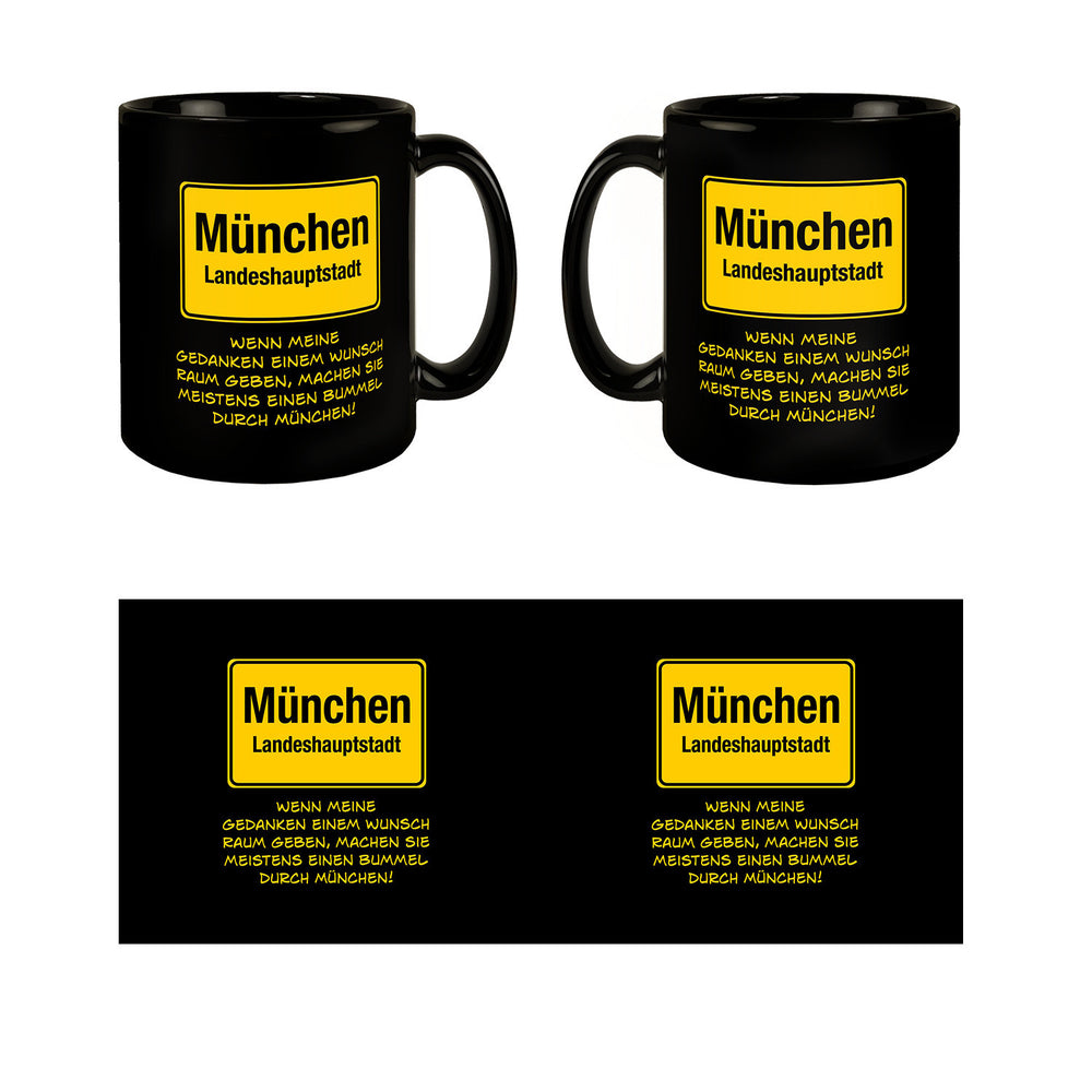 - Die schwarze Tasse zeigt ein gelbes Ortsschild mit dem Schriftzug "München, Landeshauptstadt". Darüber schwebt der lustige Spruch: "Wenn meine Gedanken einem Wunsch Raum geben, machen sie meistens einen Bummel durch München!". Ein originelles und ausgefallenes Motiv, das sofort ins Auge springt und für Schmunzeln sorgt.