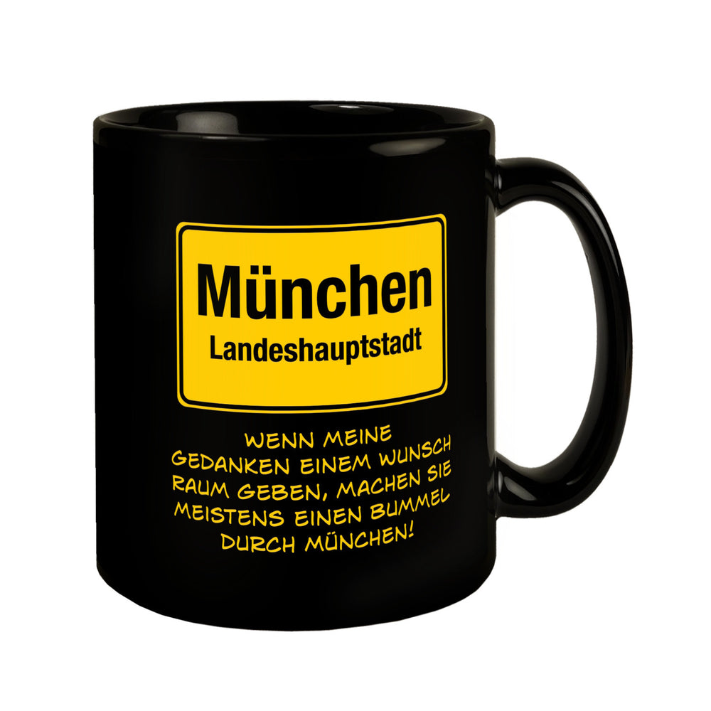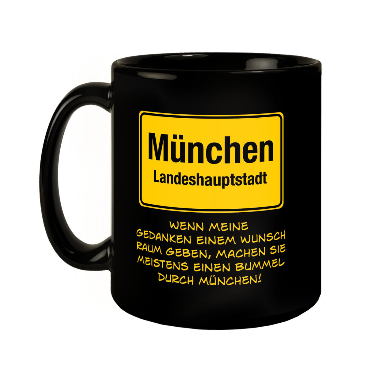 Die schwarze Tasse zeigt ein gelbes Ortsschild mit dem Schriftzug "München, Landeshauptstadt". Darüber schwebt der lustige Spruch: "Wenn meine Gedanken einem Wunsch Raum geben, machen sie meistens einen Bummel durch München!". Ein originel Hinweise: Fassungsvermögen: ca. 300ml