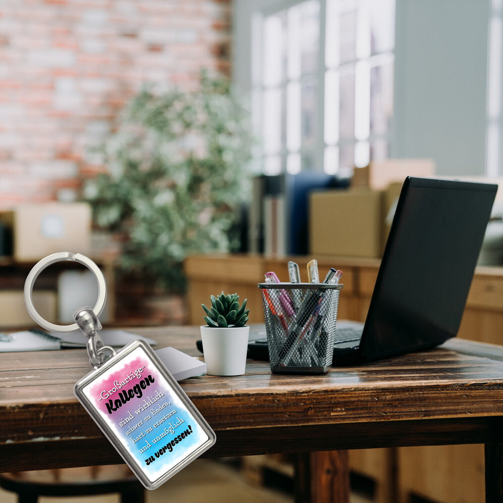Der Anhänger ist leicht an den Schlüsselbund anzubringen. Er ist auch eine besondere Geschenkidee für Kollegen und Mitarbeiter zum Abschied. Hinweise: inkl. Schlüsselring aus Metall / Motivgröße ca. 4x2,5 cm