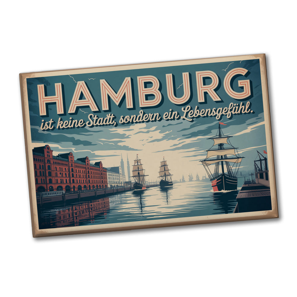 - Der Hamburg ist Lebensgefühl Souvenir Magnet ist ein rechteckiger Magnet im Vintage-Stil. Er zeigt eine detailreiche Illustration des Hamburger Hafens, mit Großseglern, der ikonischen Speicherstadt und einem wunderschönen Sonnenaufgang. Der stilvolle Spruch "Hamburg ist keine Stadt, sondern ein Lebensgefühl" rundet das nostalgische Design ab.