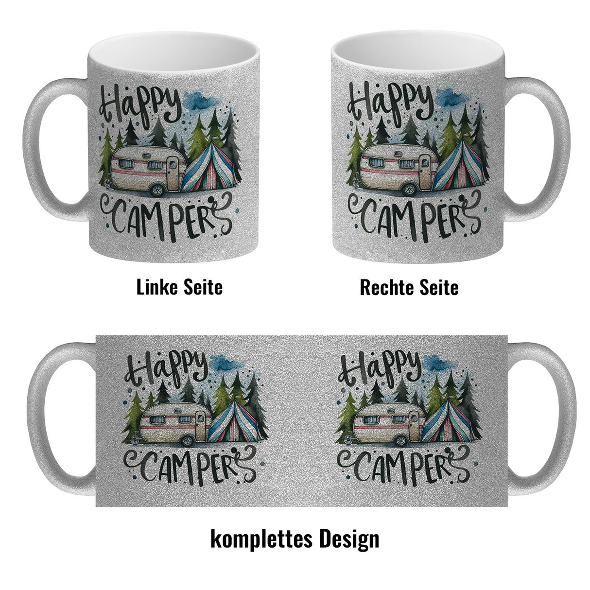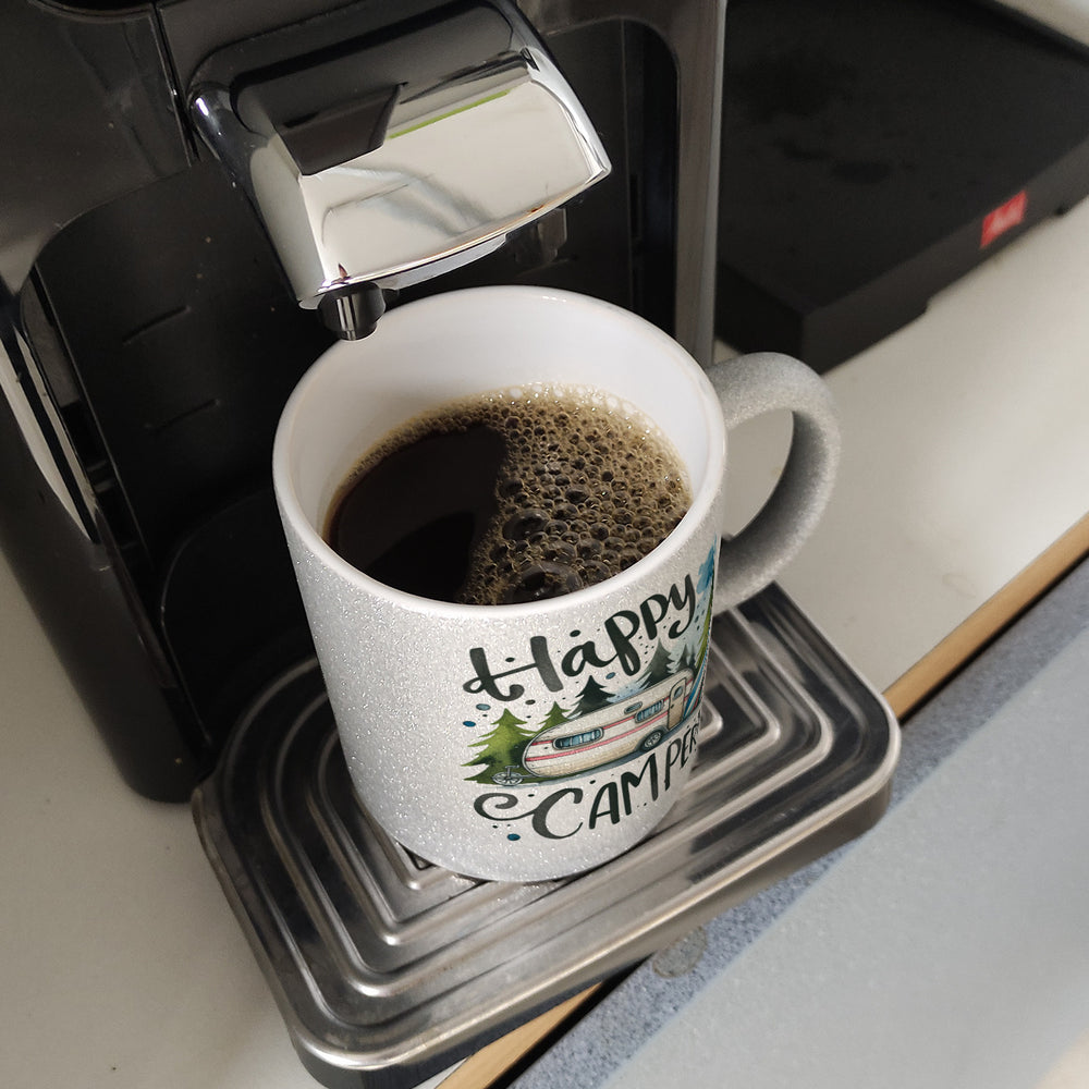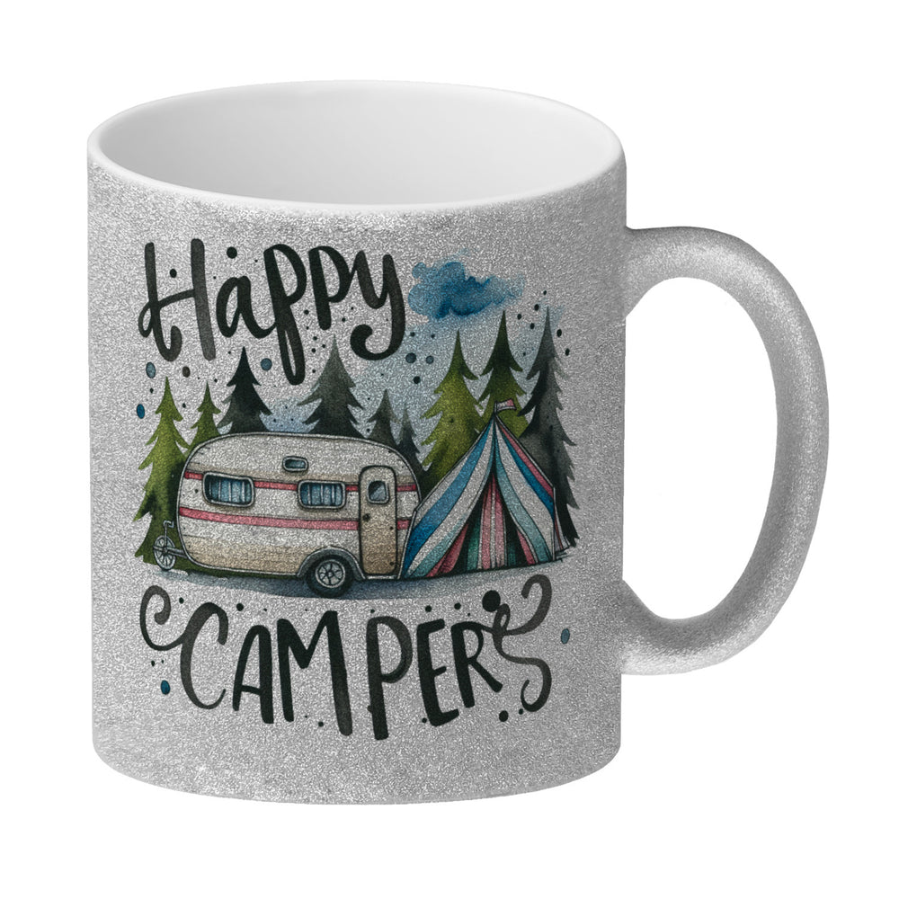 Entfache Dein Campingfieber mit dem „Happy Campers Wohnwagen Kaffeebecher“! Dieser Becher ist ein Traum für alle Outdoor-Liebhaber. Erhältlich in unterschiedlichen Varianten – ob als weiße Standardtasse, mit farbigem Henkel und Innenseite, als edle Glastasse oder in der exklusiven Silberedition mit Glitzereffekt. Egal, welche Variante Du wählst, der farbenfrohe Wohnwagen im Wald und der fröhliche Spruch „Happy Campers“ bringen augenblicklich gute Laune in jeden Tag.Diese Tasse, sorgfältig bedruckt in unserer Tassen-Manufaktur in Deutschland, bietet die perfekte Möglichkeit, sich an die wunderbaren Momente im Freien zu erinnern, während man den ersten Schluck Kaffee genießt. Funktionalität trifft Design: Der robust verarbeitete Kaffeebecher ist ideal für den täglichen Gebrauch, sowohl zuhause, im Büro oder bei deinem nächsten Campingabenteuer.Der Happy Campers Kaffeebecher ist das perfekte Geschenk für jeden Camping-Enthusiasten – ob zum Geburtstag, zu Weihnachten oder einfach als kleine Freude zwischendurch. Zeige deinem Umfeld, dass Du das Leben draußen liebst und die Natur Deinen zweiten Wohnsitz nennst. Dieser Becher zaubert garantiert ein Lächeln auf die Lippen und motiviert dazu, den nächsten Campingtrip zu planen. Mach Deinem Lieblingscamper eine Freude und verschenke pure Wanderlust in Form eines Kaffeebechers!