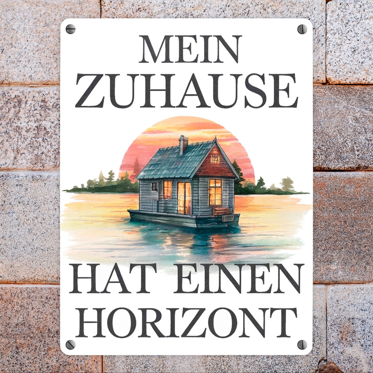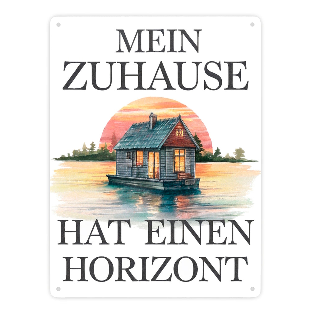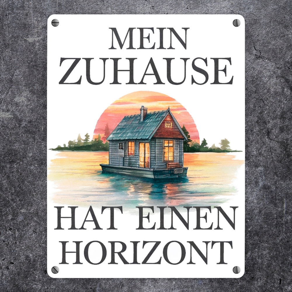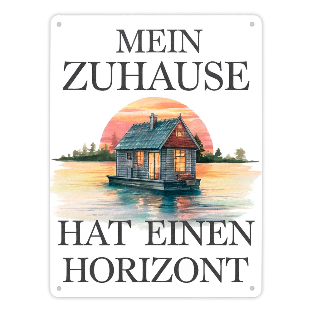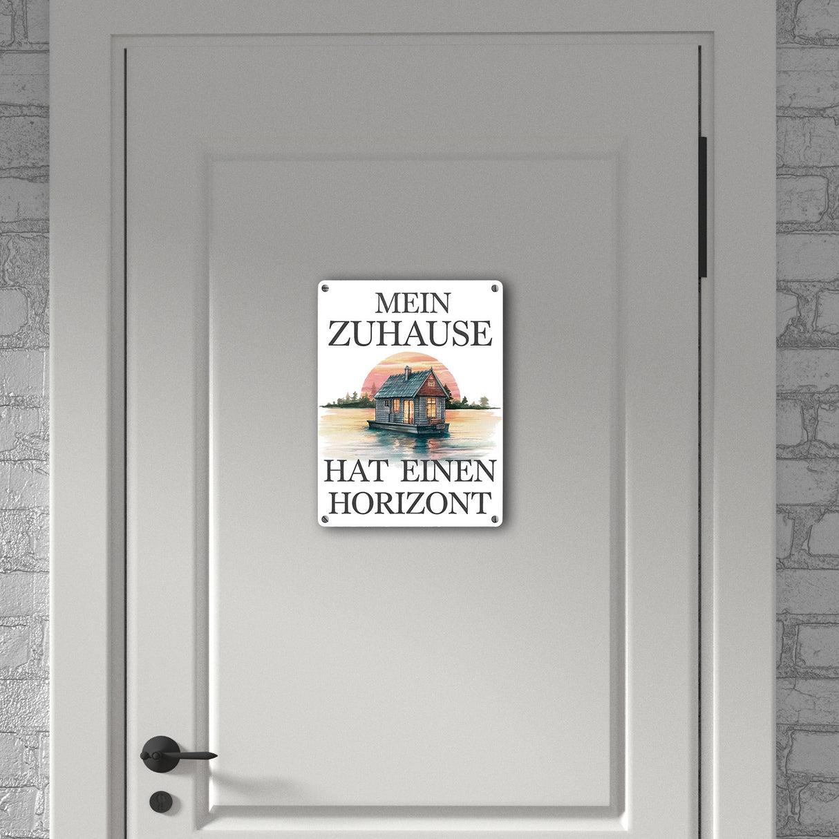 Hausboot auf Wasser Metallschild in 15x20 cm - Zuhause mit Horizont