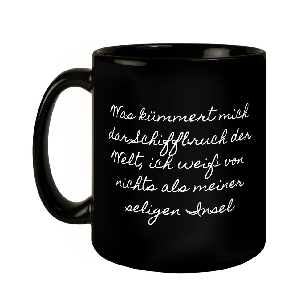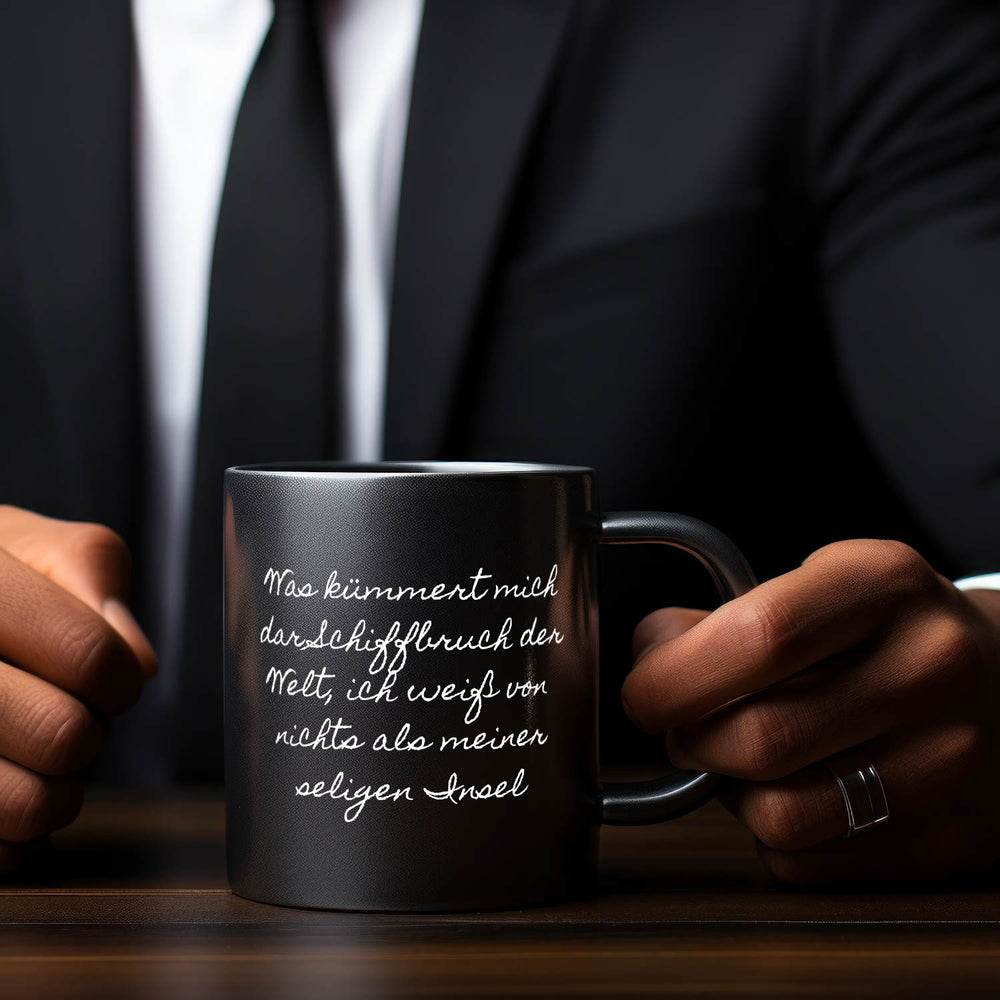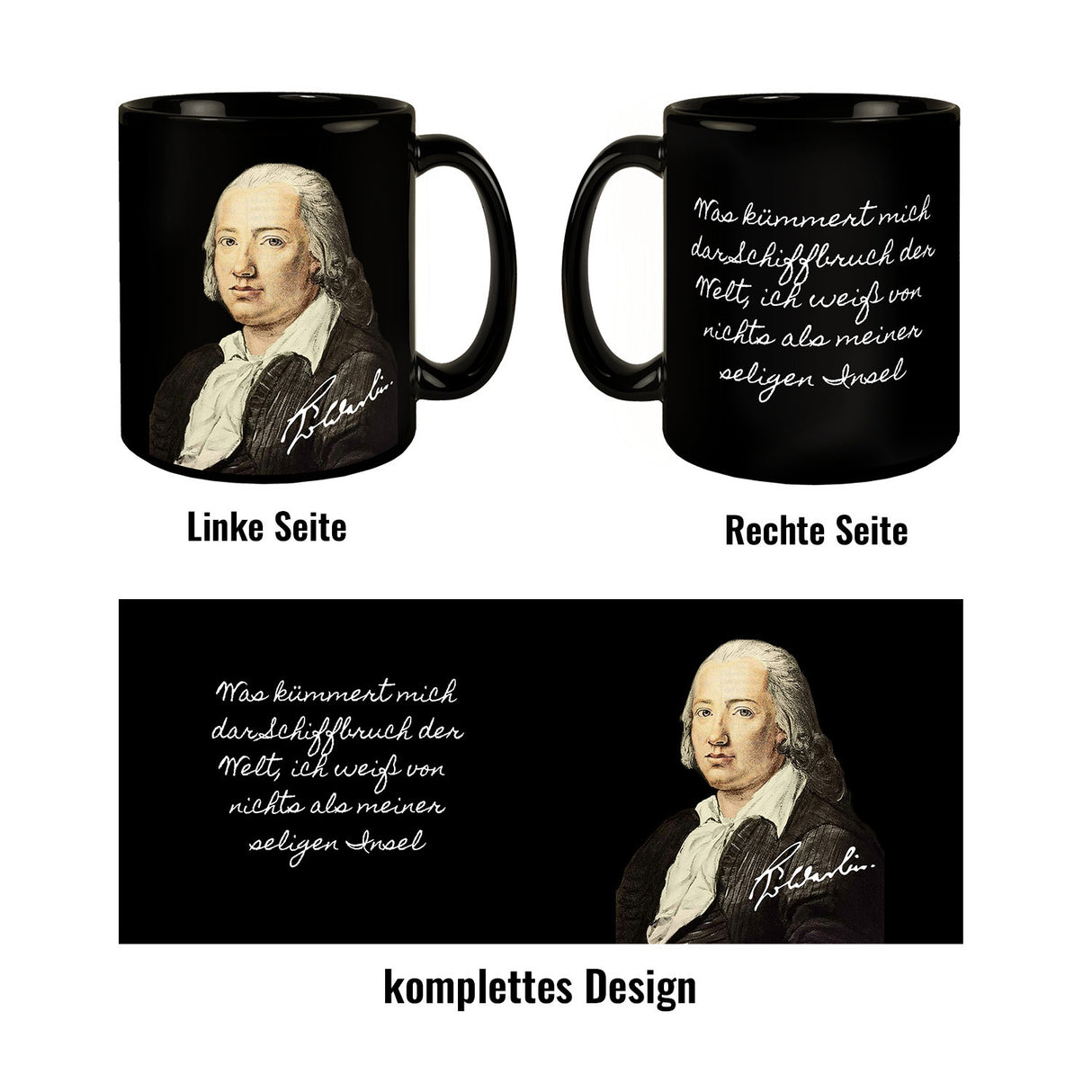 - Entdecken Sie die elegante Hölderlin Portrait Tübingen Tasse, perfekt für Literaturenthusiasten. Der Becher in stilvollem Schwarz zeigt ein eindrucksvolles Portrait von Hölderlin, seine Unterschrift und den inspirierenden Spruch: "Was kümmert mich der Schiffbruch der Welt, ich weiß von nichts als meiner seligen Insel." Perfekt für einen stilvollen Kaffeegenuss.