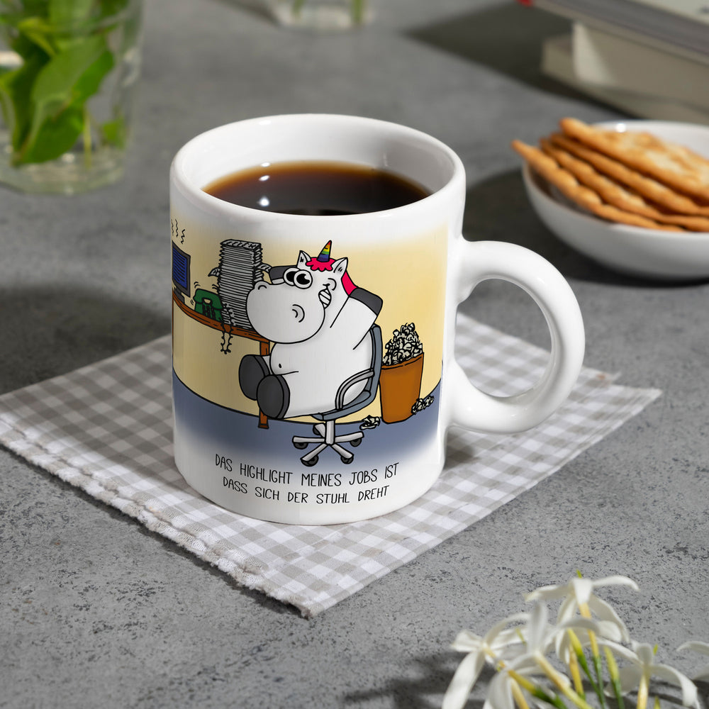 Honeycorns Kaffeebecher mit Einhorn Motiv und Spruch: Highlight meines Jobs...