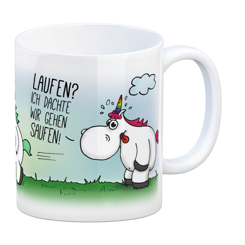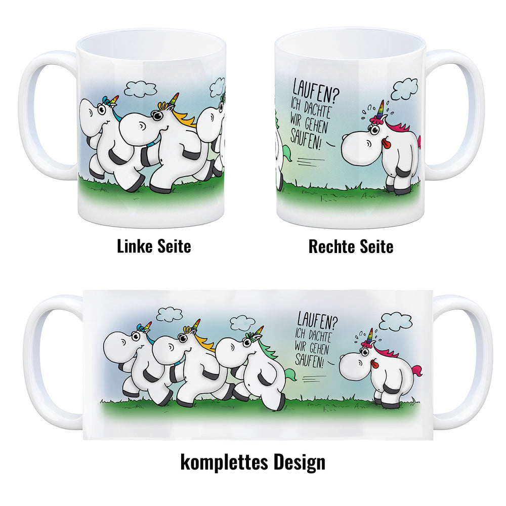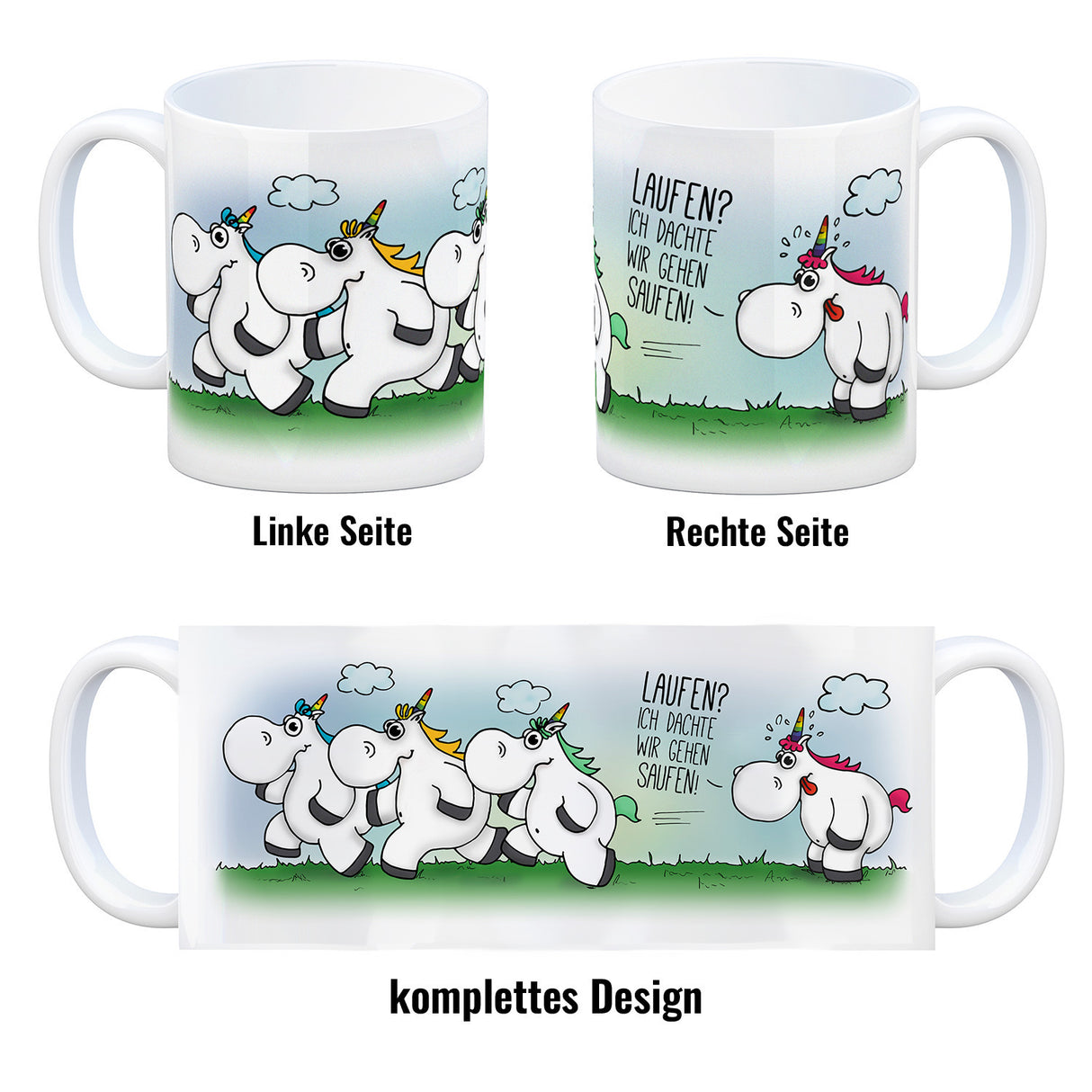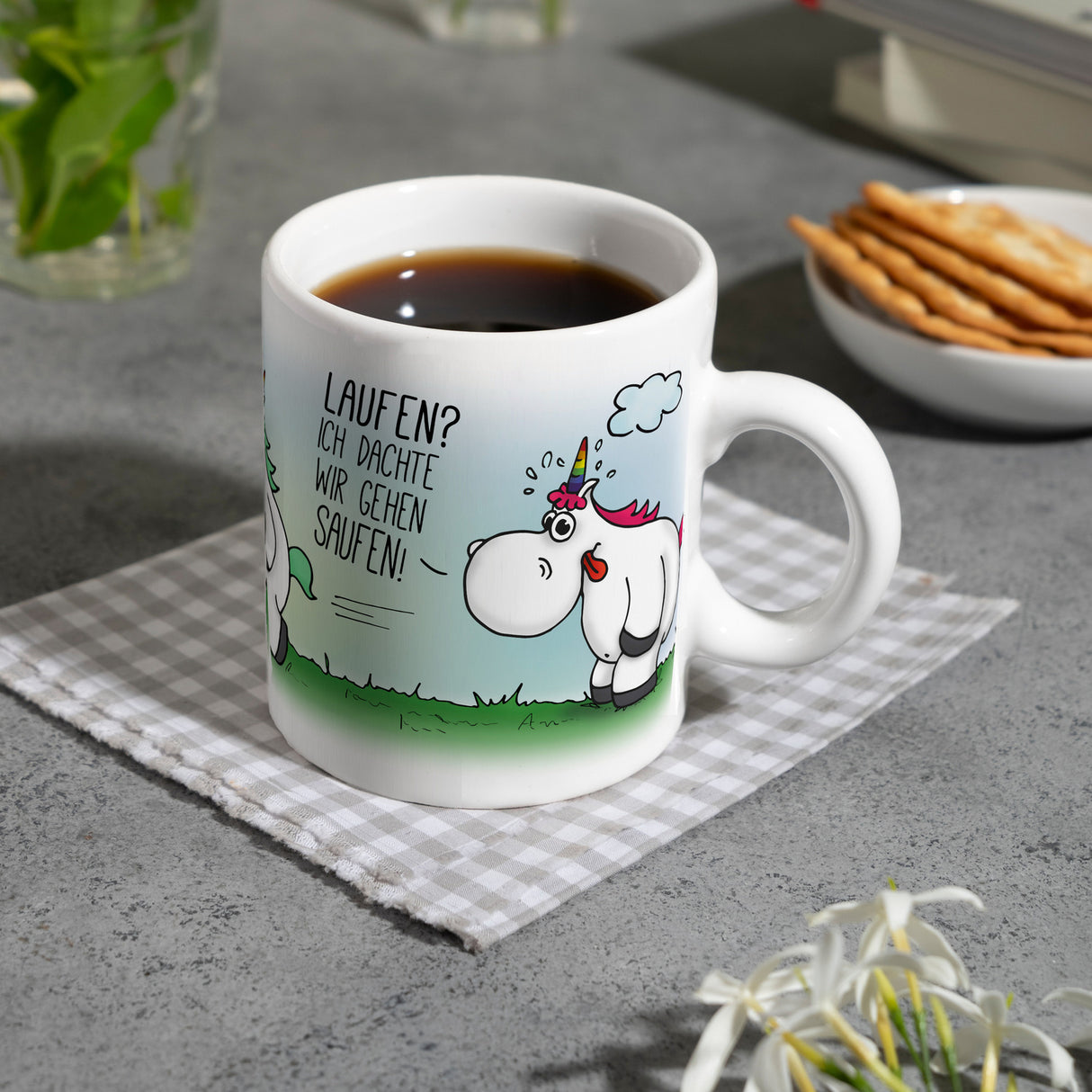- Lieferumfang: Honeycorns Kaffeebecher mit Einhorn Motiv und Spruch: Laufen? Ich dachte wir gehen saufen