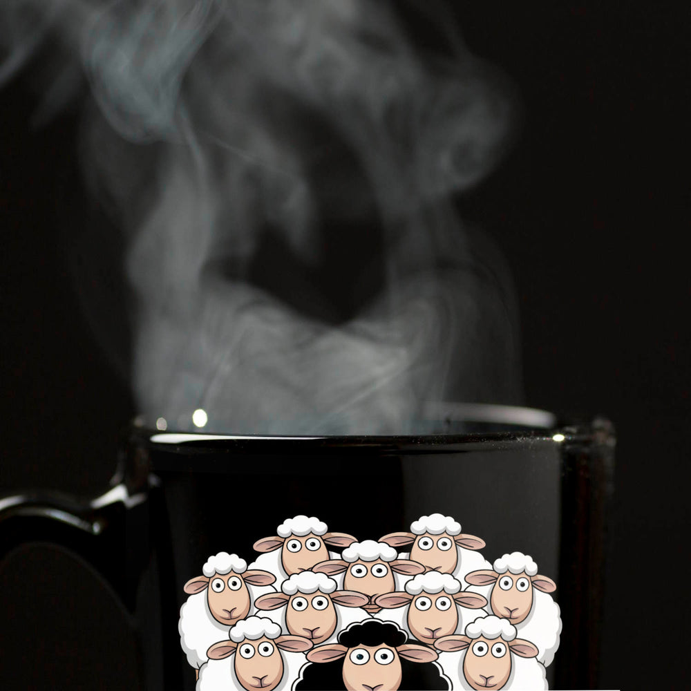 Diese Tasse präsentiert ein humorvolles Cartoon-Motiv mit einem schwarzen Schaf, das selbstbewusst inmitten verwirrter weißer Schafe steht. Der tiefschwarze Hintergrund hebt die komische Szene hervor. Der Spruch "Ich bin gern das schwarze Schaf!" Hinweise: Fassungsvermögen: ca. 300ml