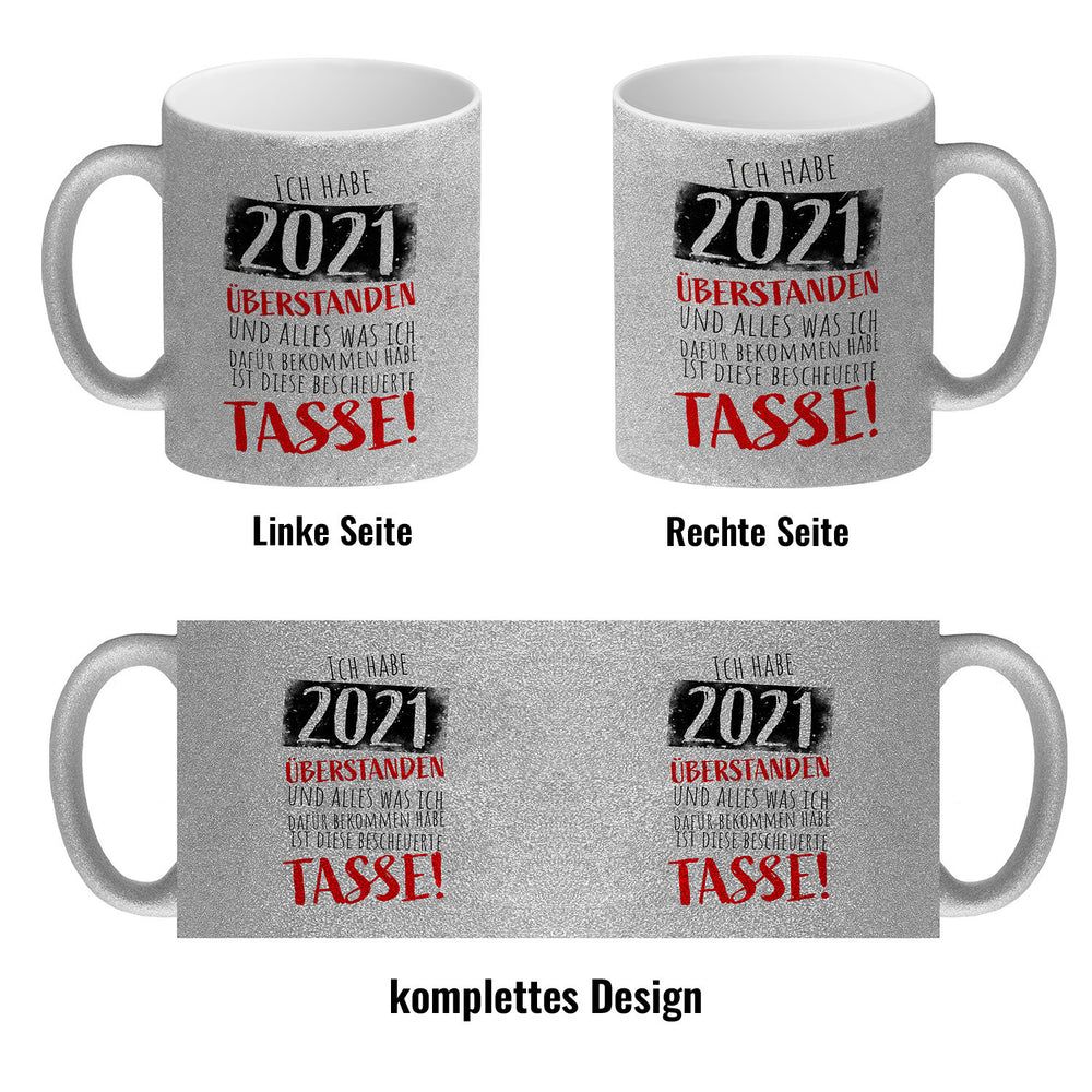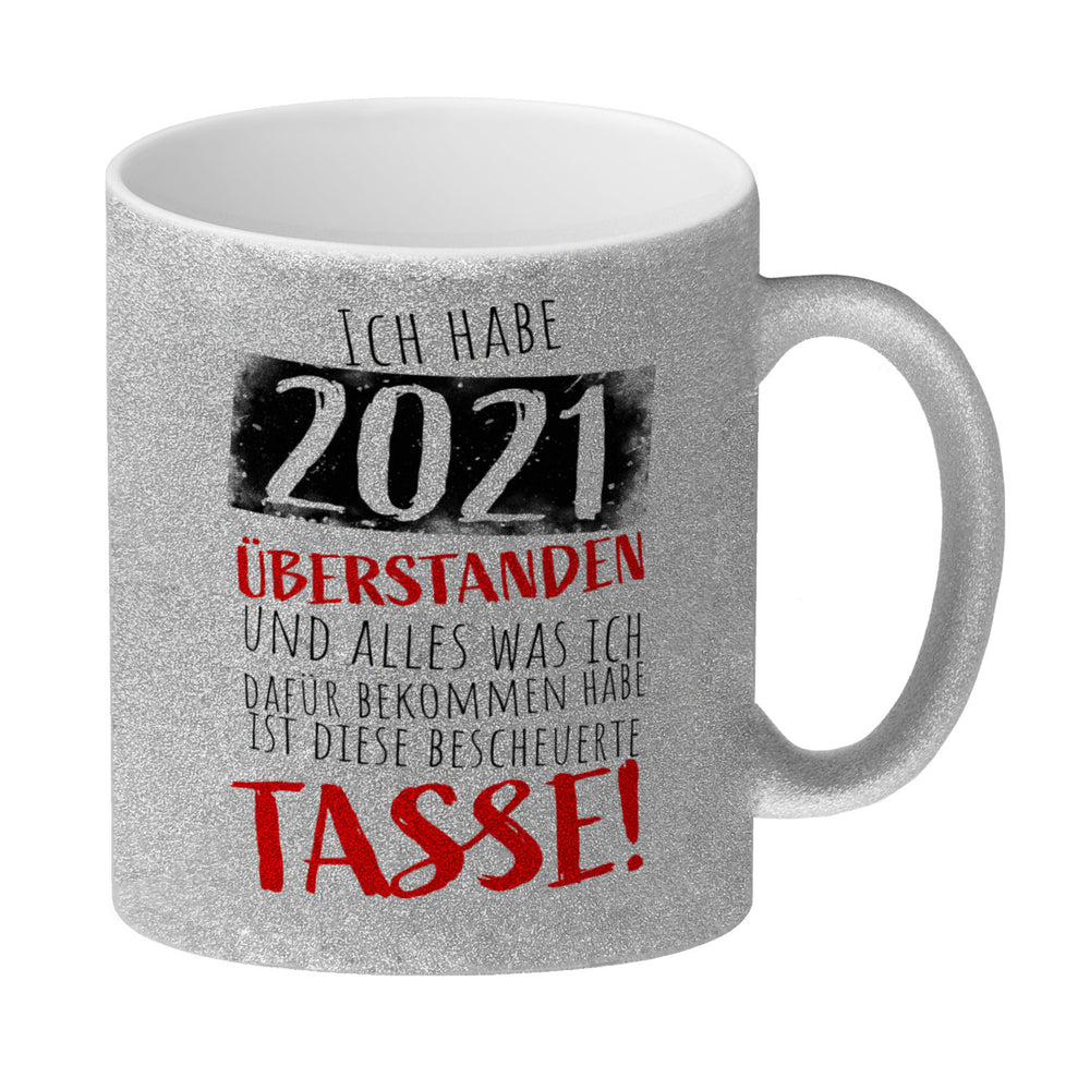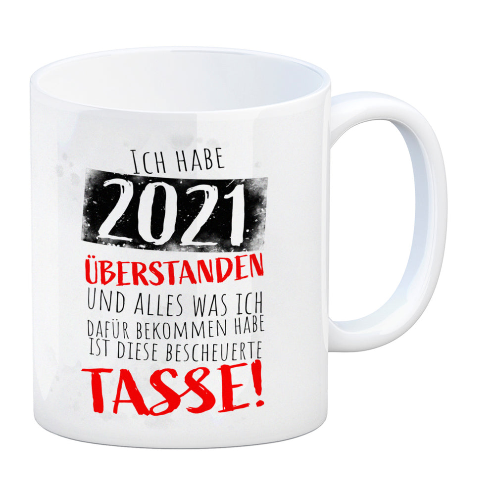 - 1x Ich habe 2021 überstanden Kaffeebecher mit lustigem Spruch in der gewählten Ausführung