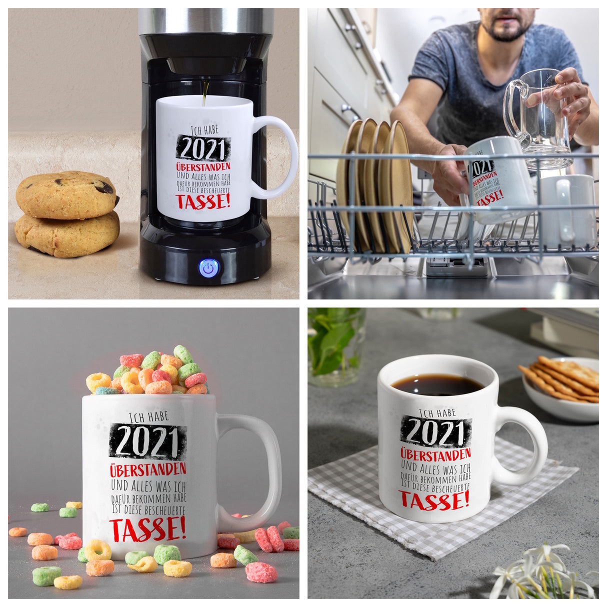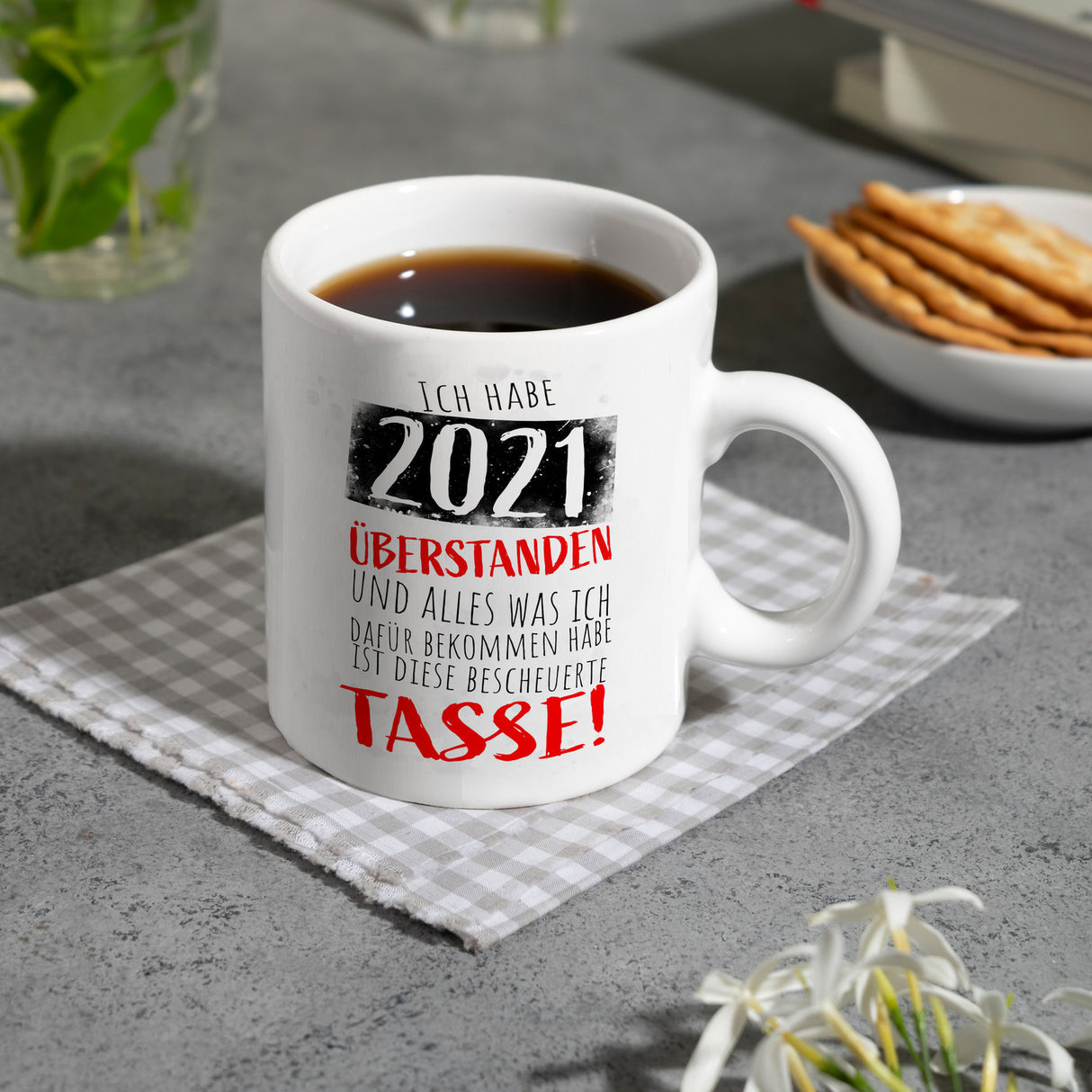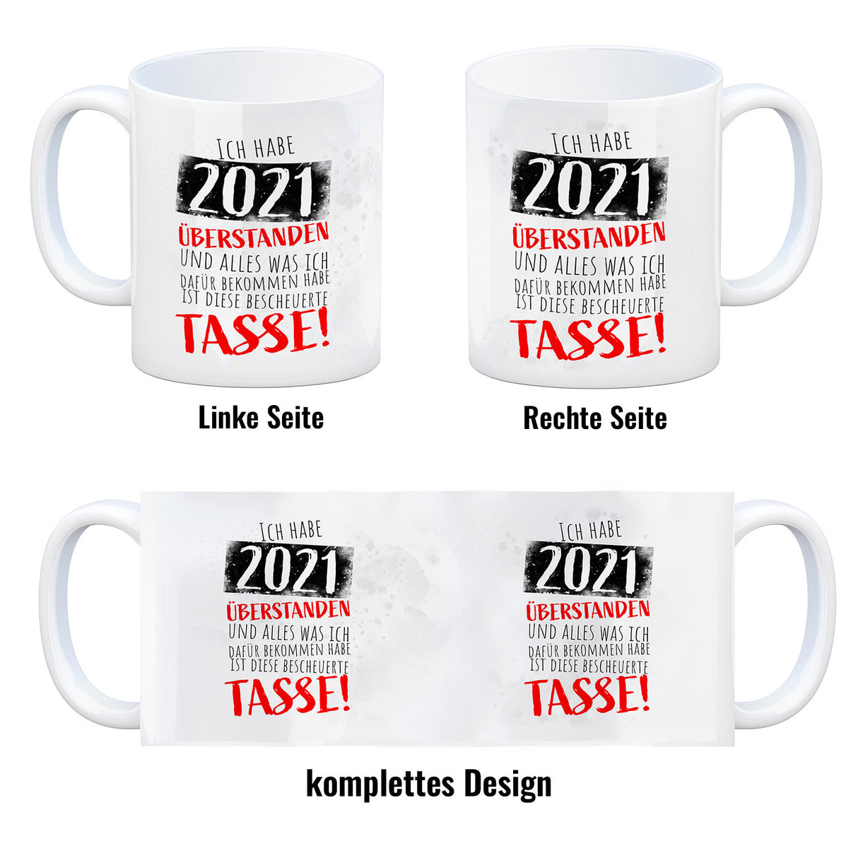 - 1x Ich habe 2021 überstanden Kaffeebecher mit lustigem Spruch in der gewählten Ausführung