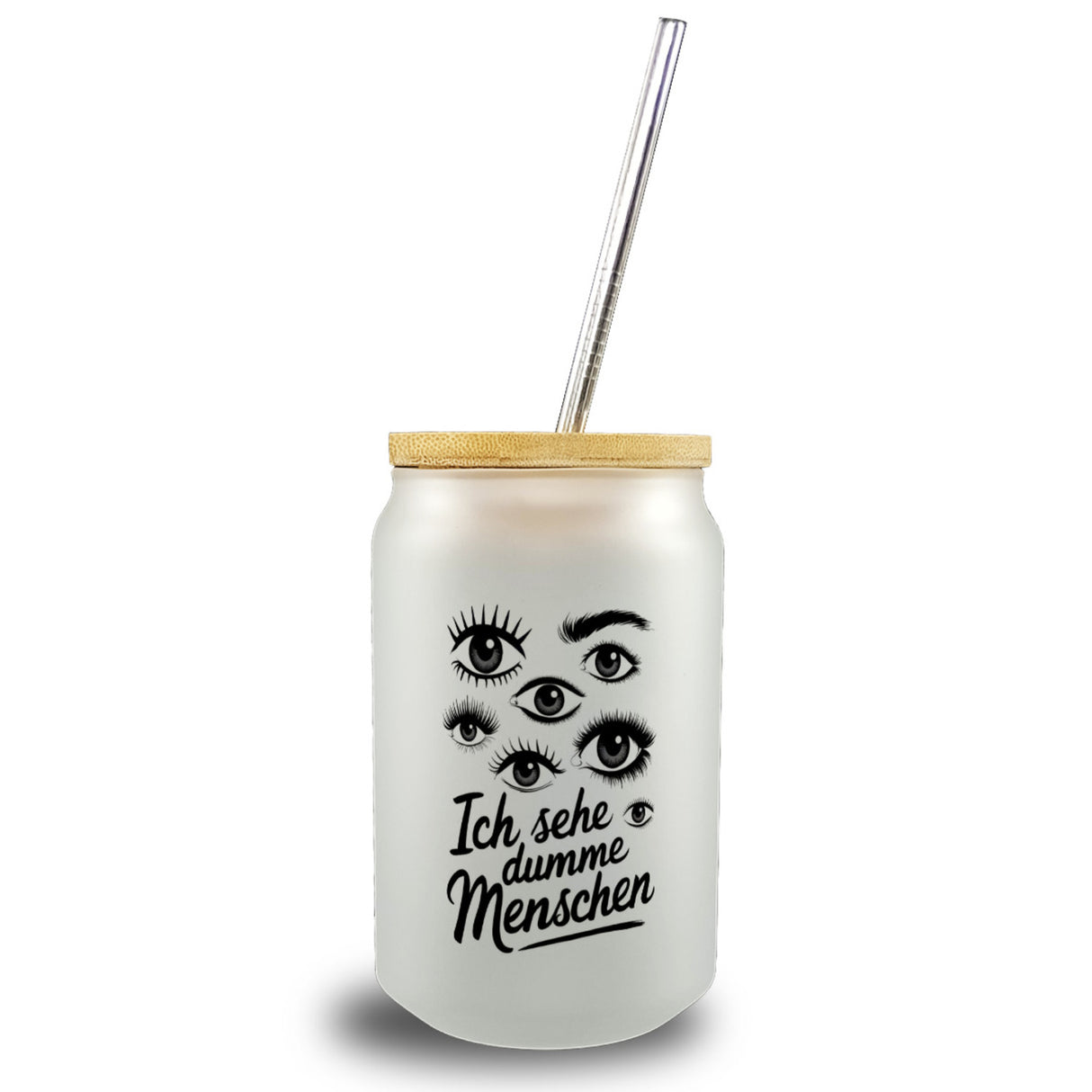 Ich sehe dumme Menschen Trinkglas mit Bambusdeckel Augen Design