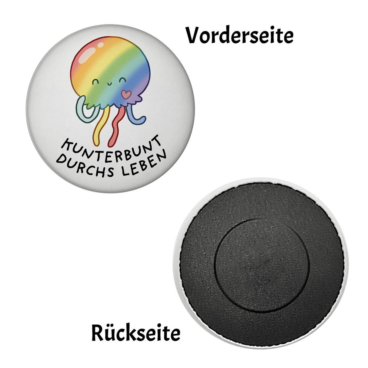 - 1x Jelly & Friends Regenbogen-Qualle Magnet rund mit Spruch Kunterbunt durchs Leben in der gewählten Ausführung