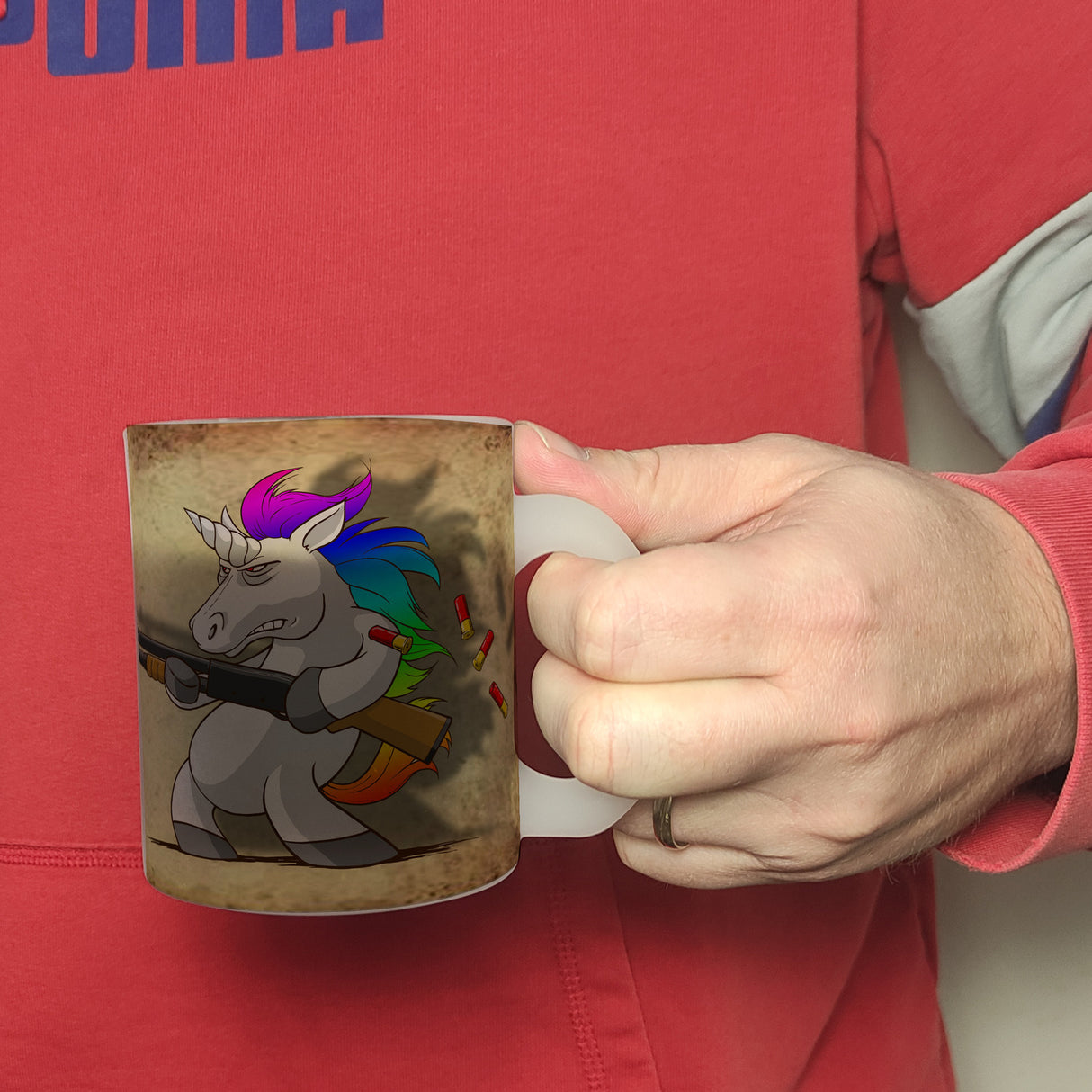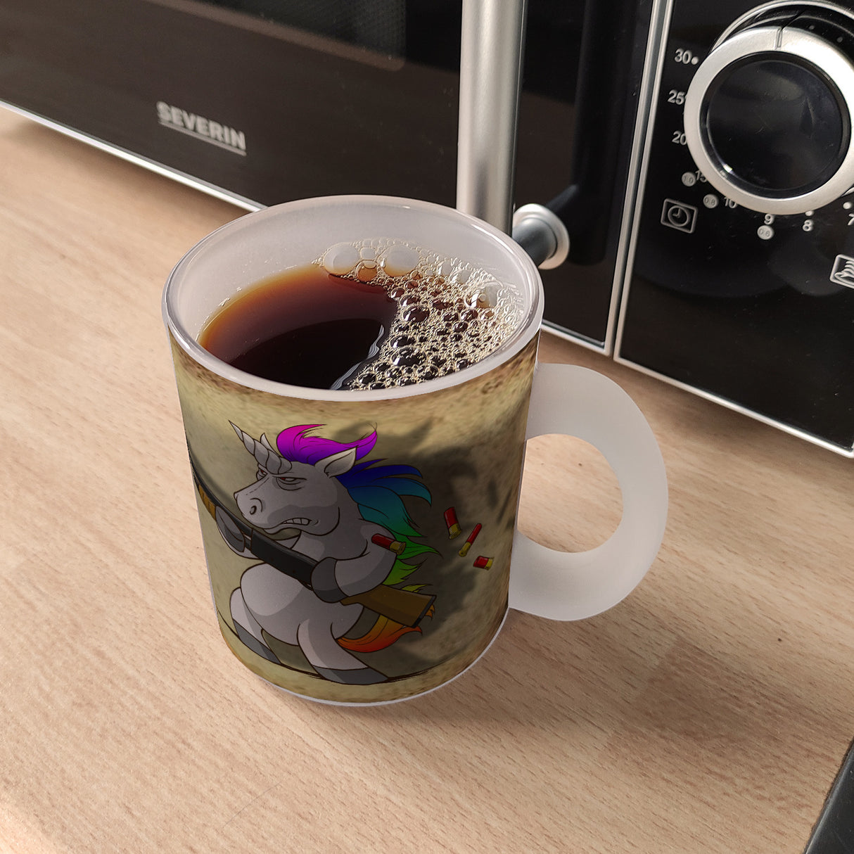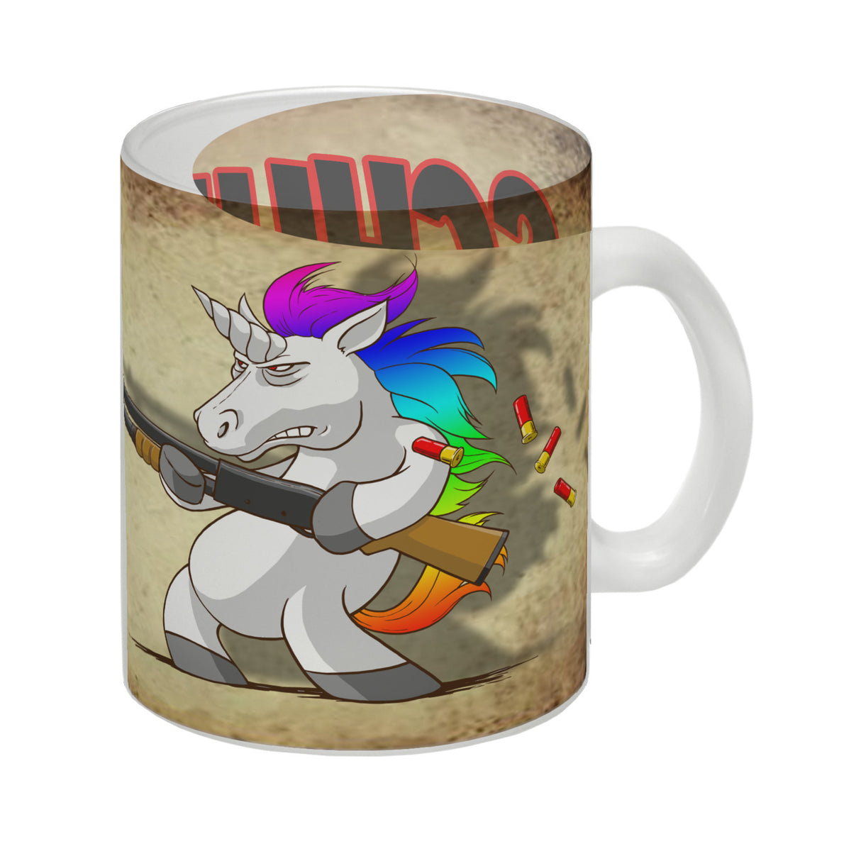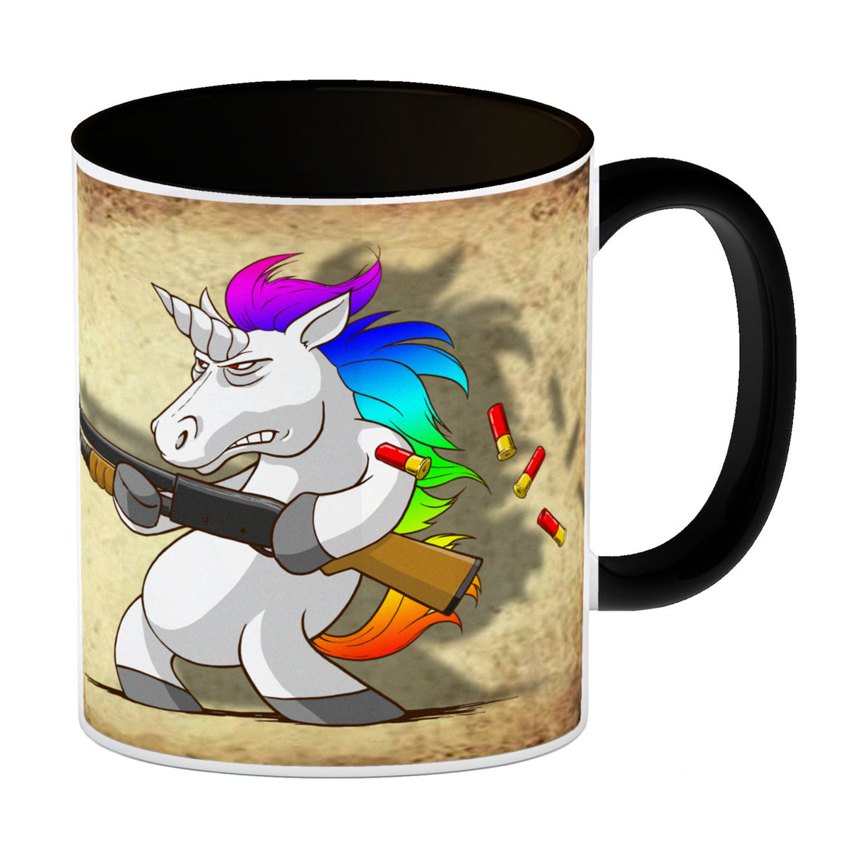 - 1x Kaffeebecher mit lustigem Einhorn mit Gewehr Motiv - SCHLUSS MIT LUSTIG! in der gewählten Ausführung