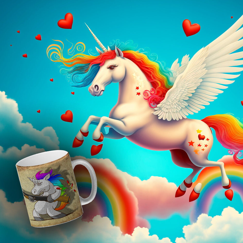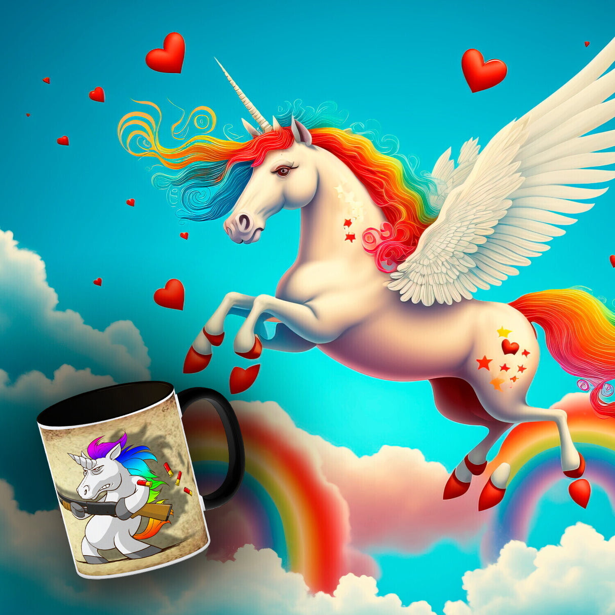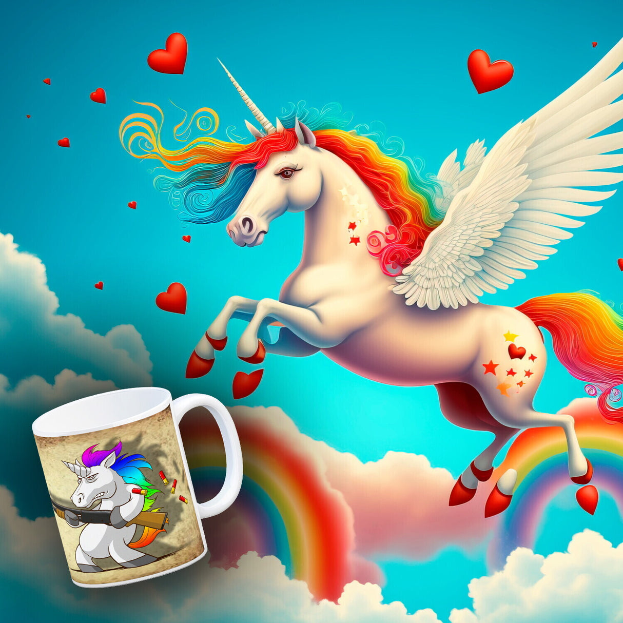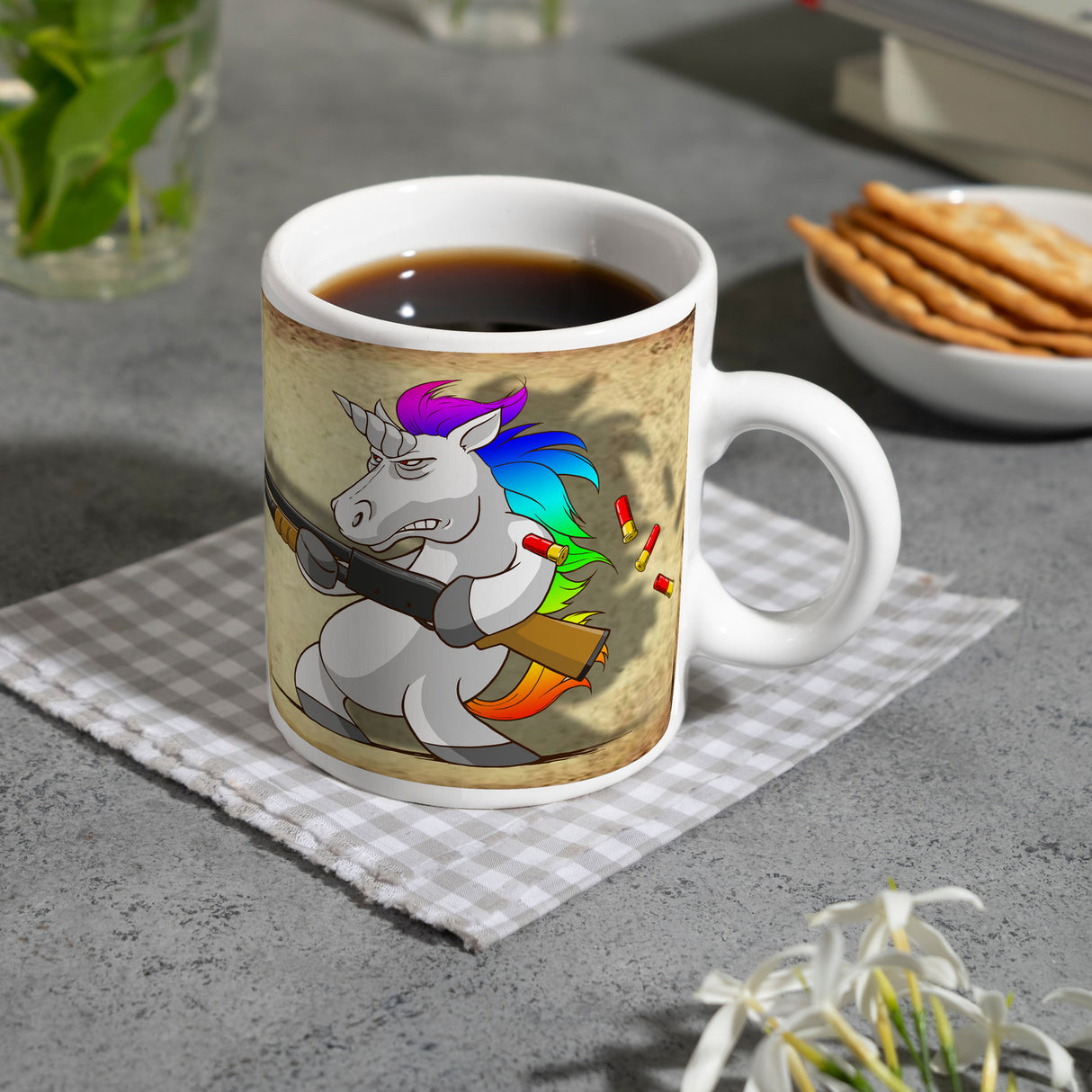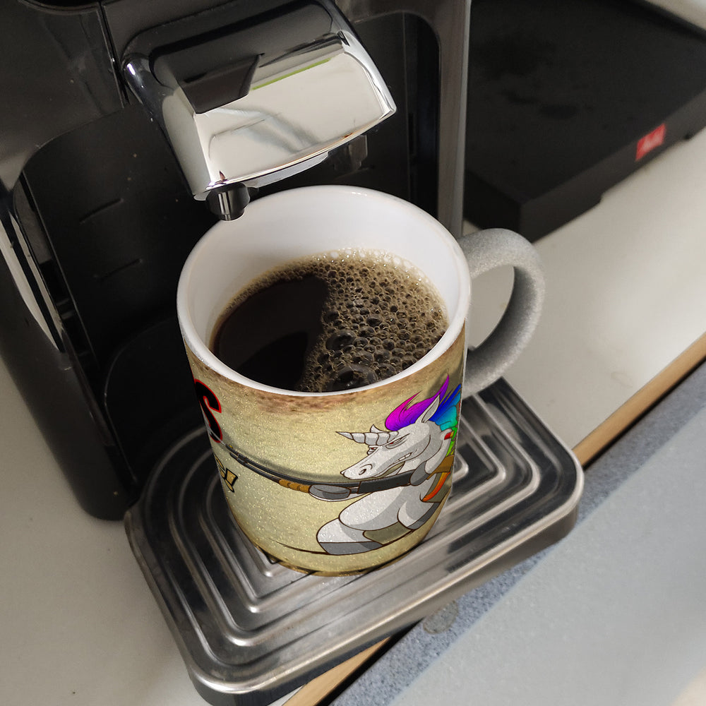 - 1x Kaffeebecher mit lustigem Einhorn mit Gewehr Motiv - SCHLUSS MIT LUSTIG! in der gewählten Ausführung