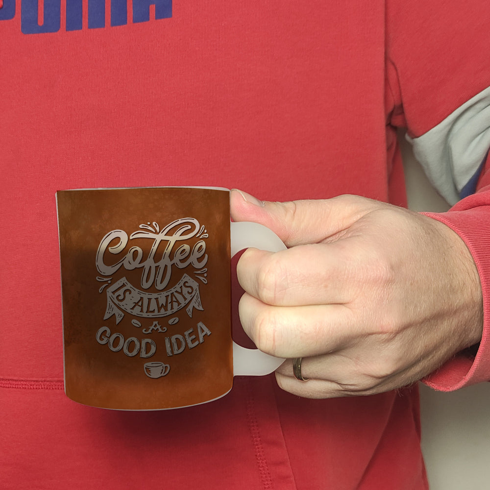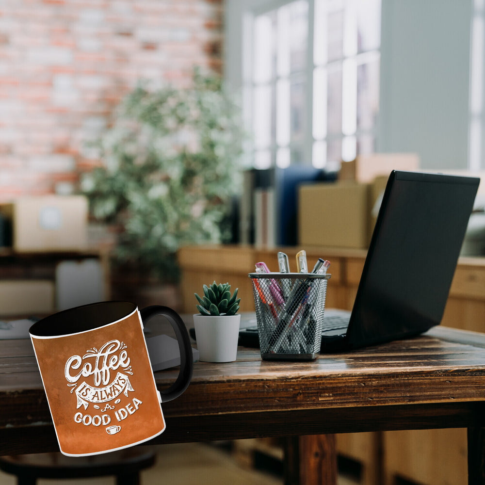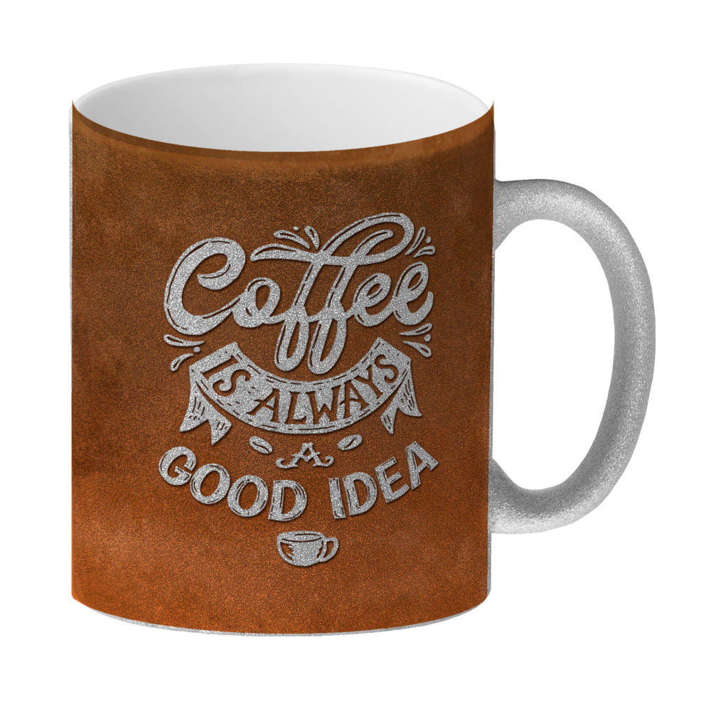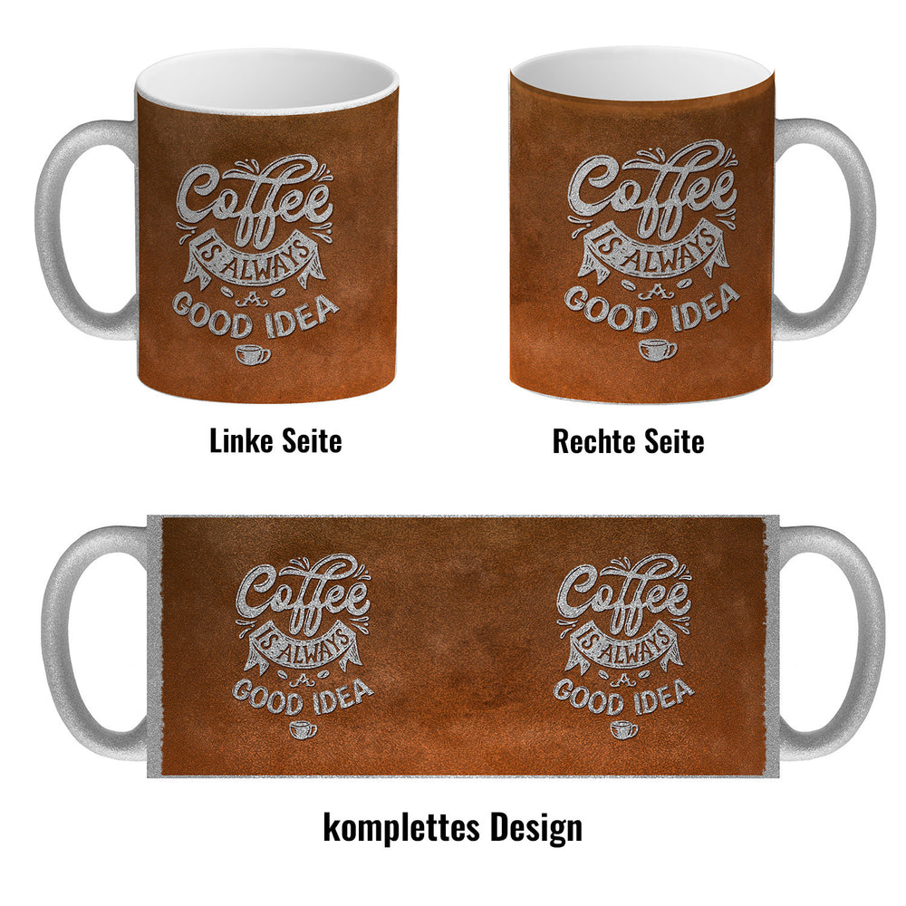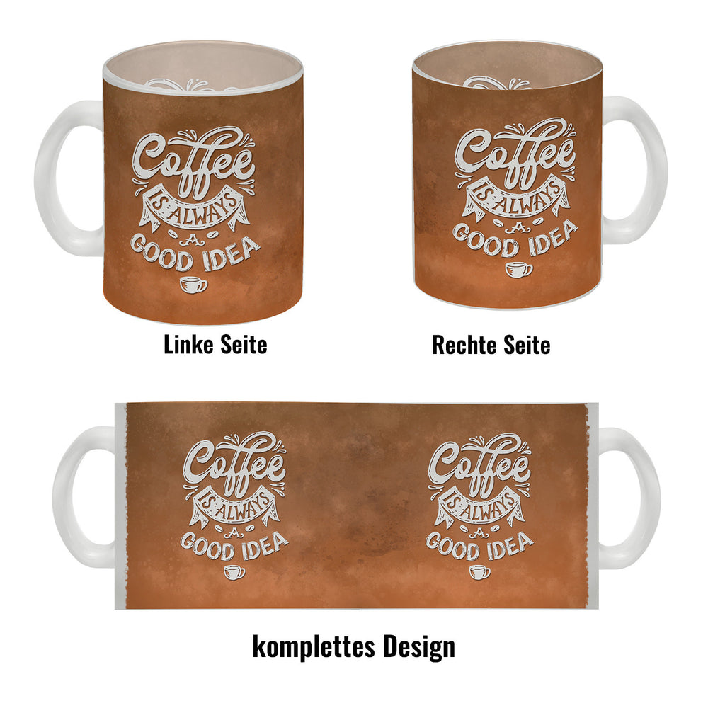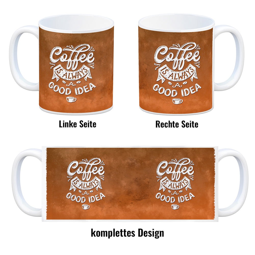 - 1x Kaffeebecher mit Spruch: Coffee is always a good idea in der gewählten Ausführung