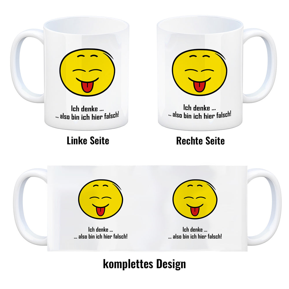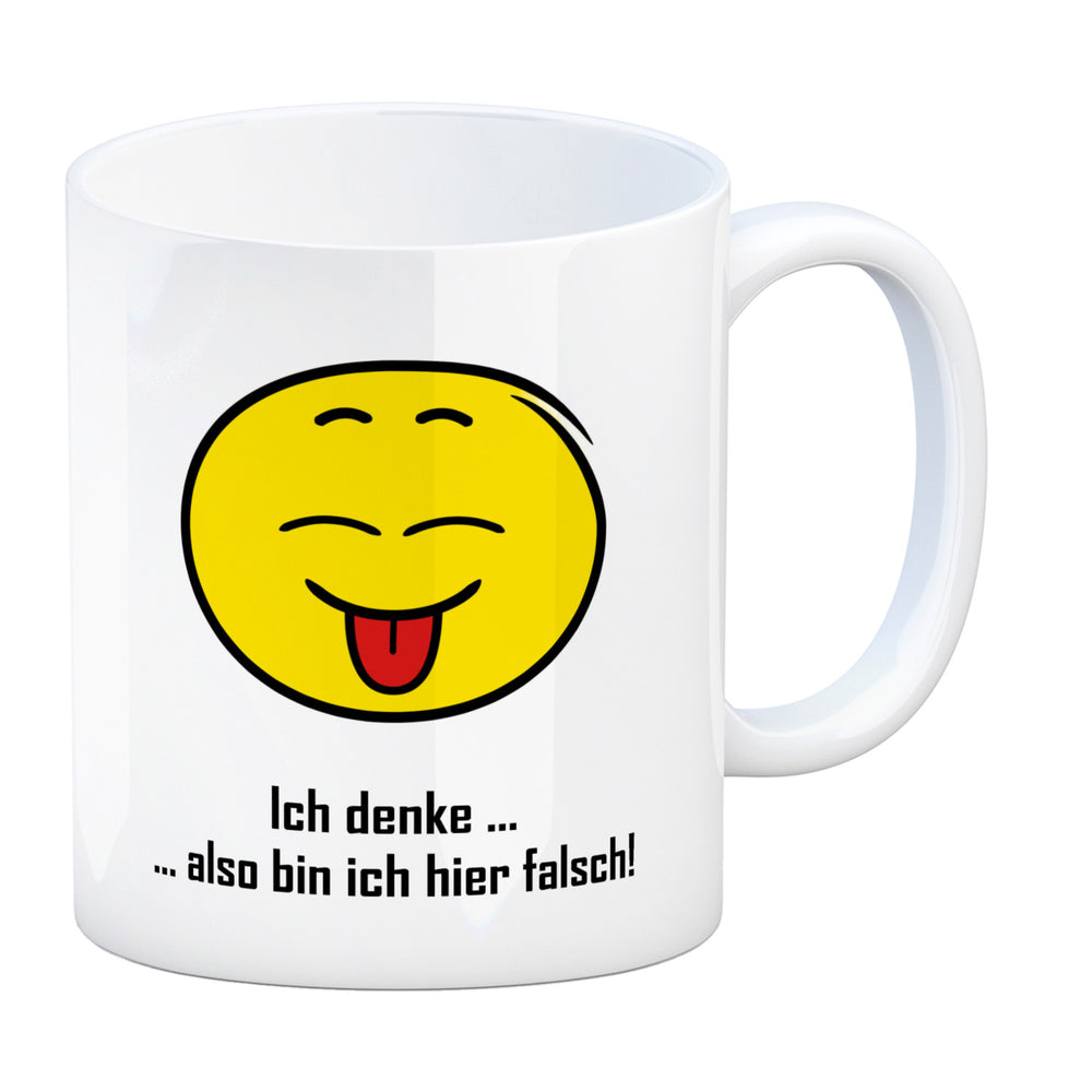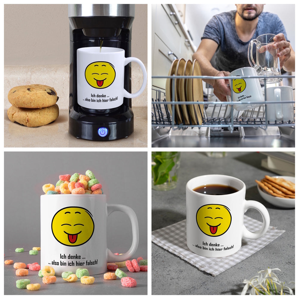 - Lieferumfang: 1x Kaffeebecher mit Spruch: Ich denke also bin ich hier falsch! ...