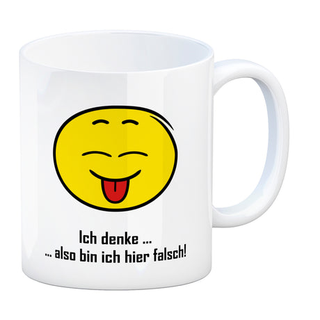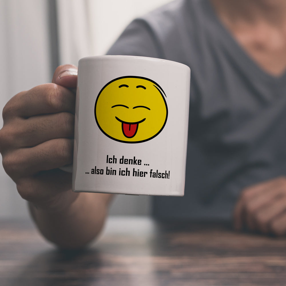 Kaffeebecher mit Spruch: Ich denke also bin ich hier falsch! ...