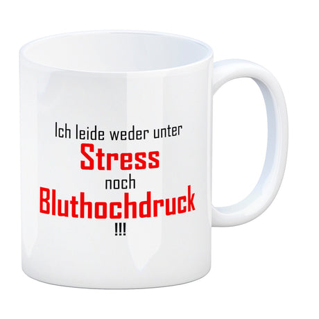 Kaffeebecher und Spruch: Ich leide weder unter Stress noch Bluthochdruck