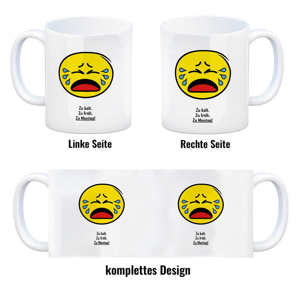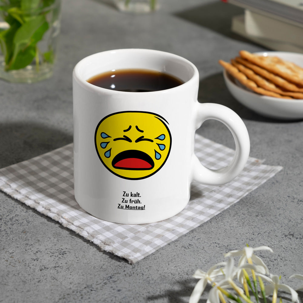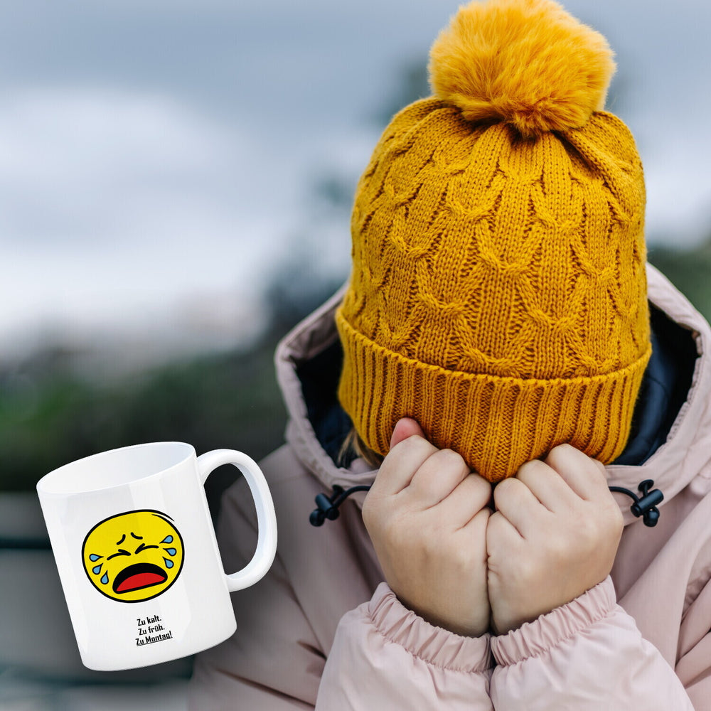 Kaffeebecher mit Spruch: Zu kalt. Zu früh. Zu Montag!