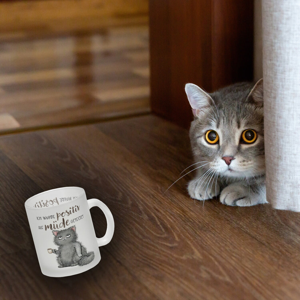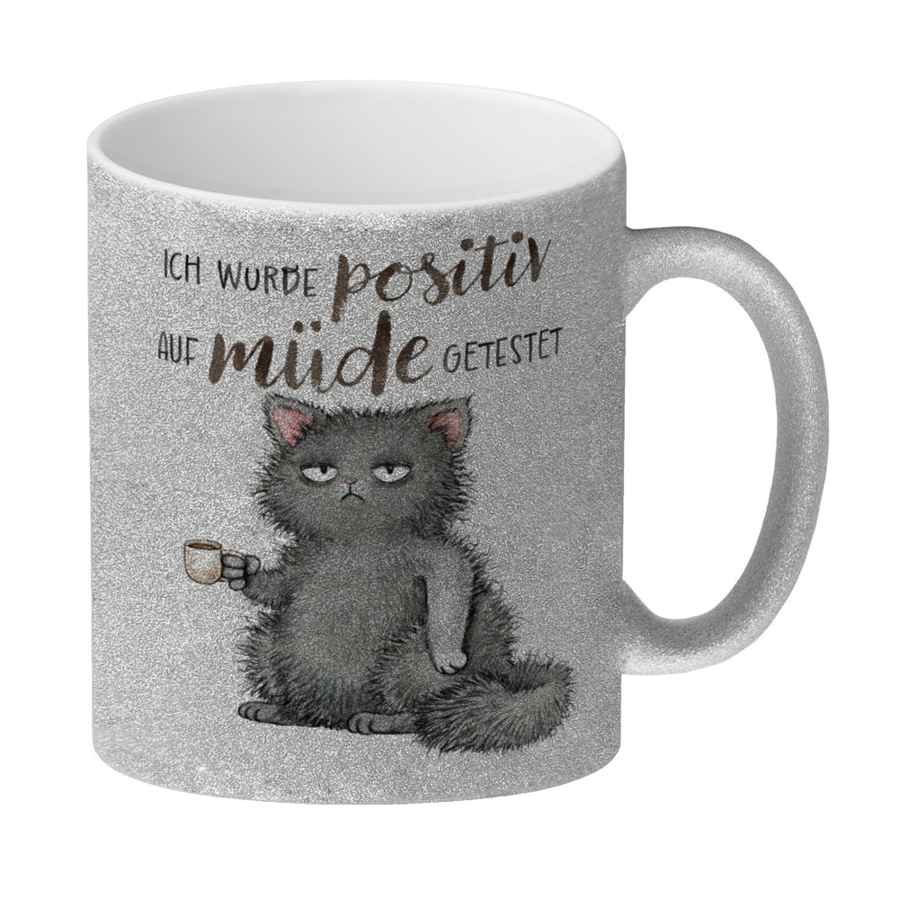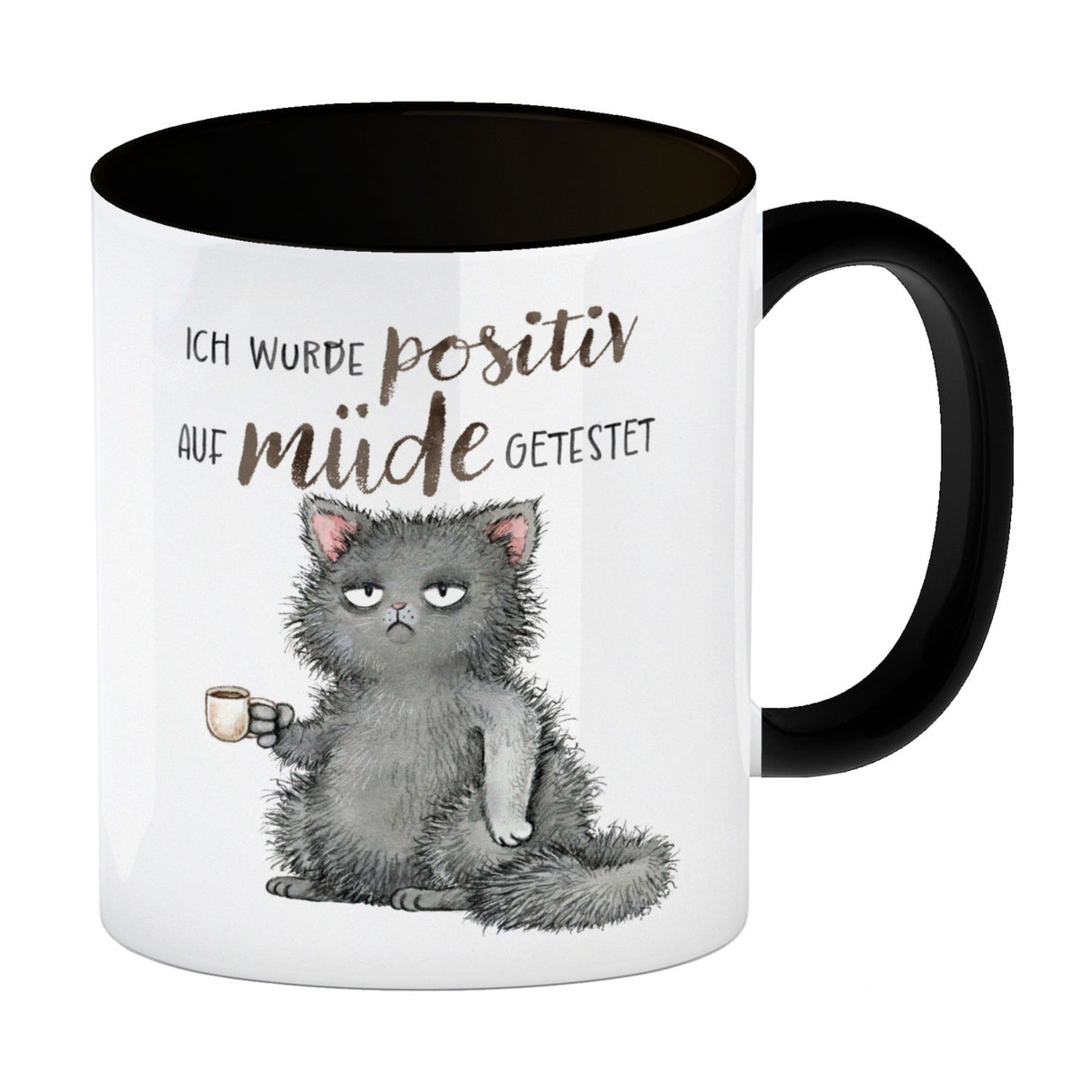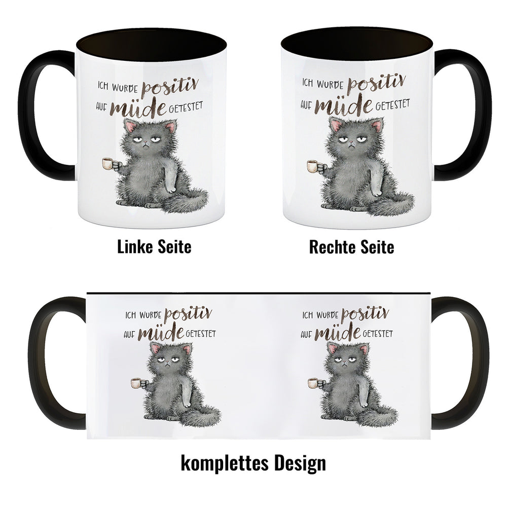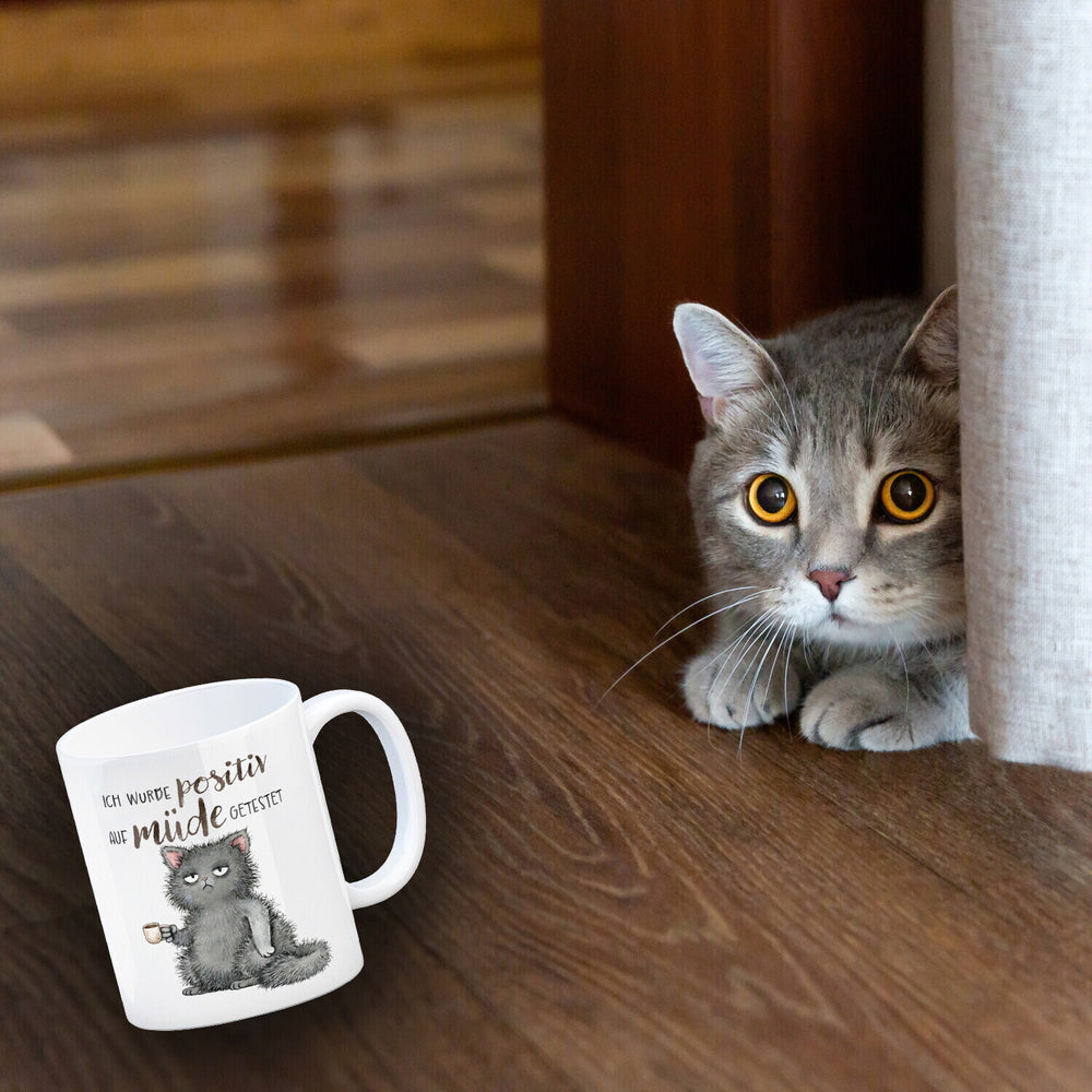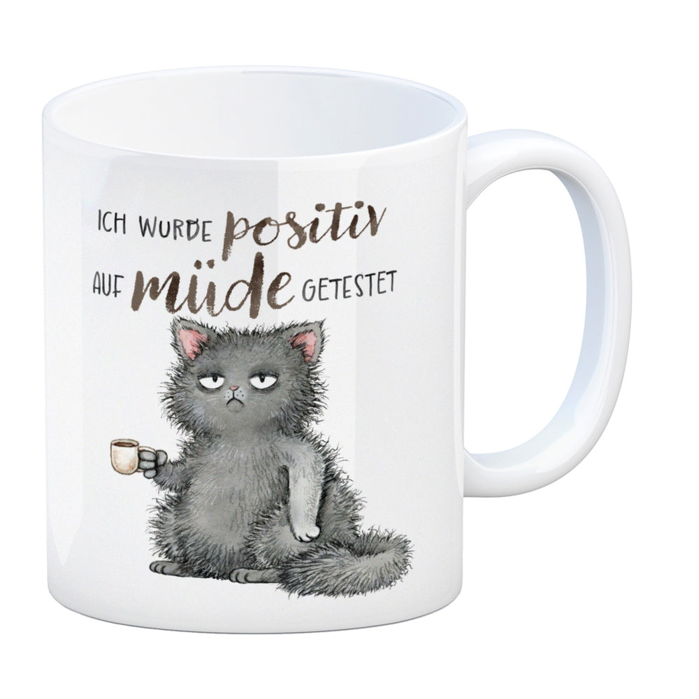 - 1x Katze mit Tasse Kaffeebecher mit Spruch positiv auf müde getestet in der gewählten Ausführung