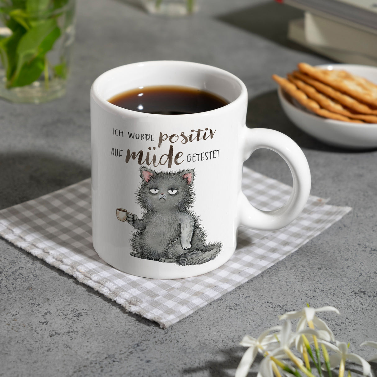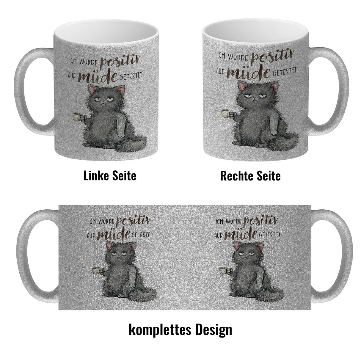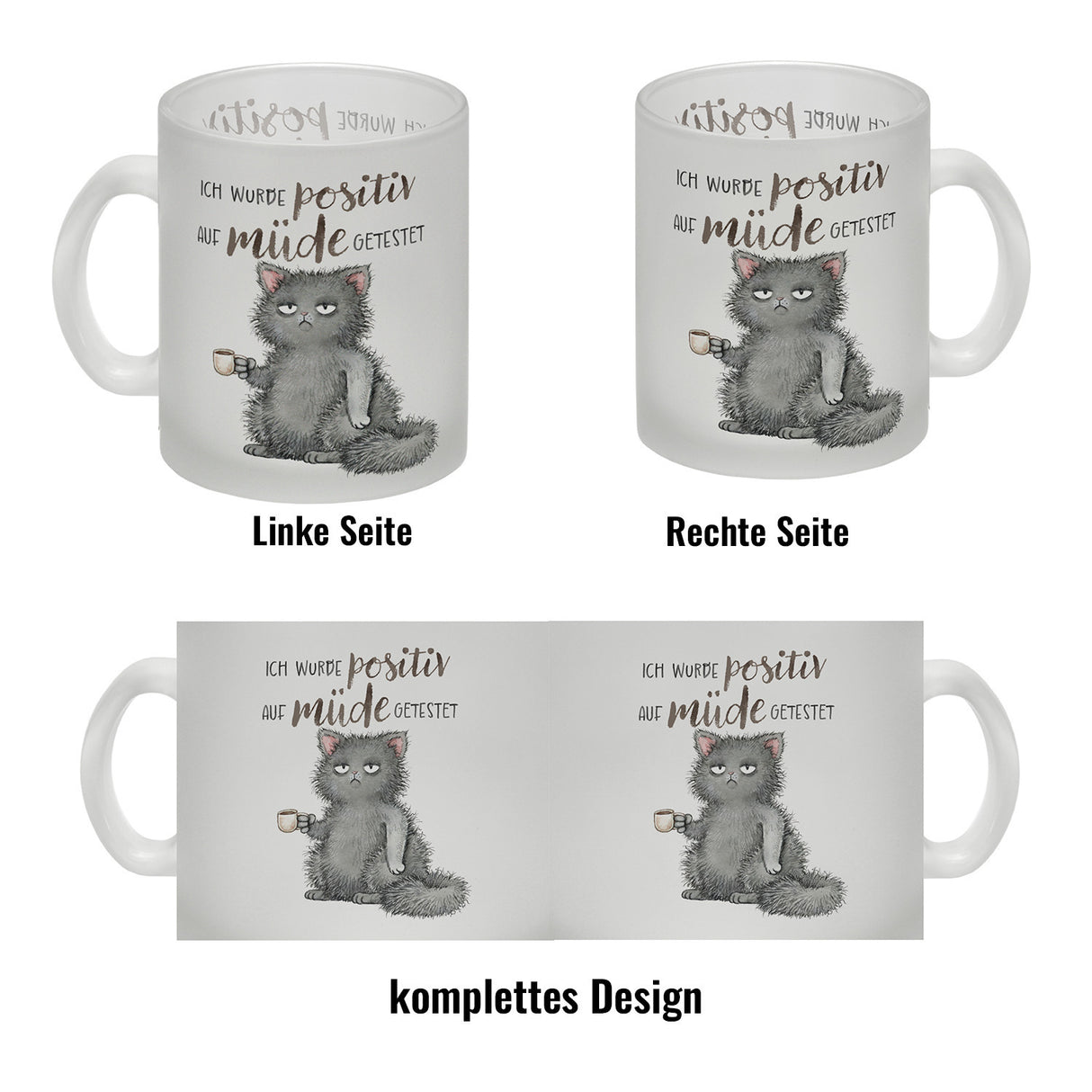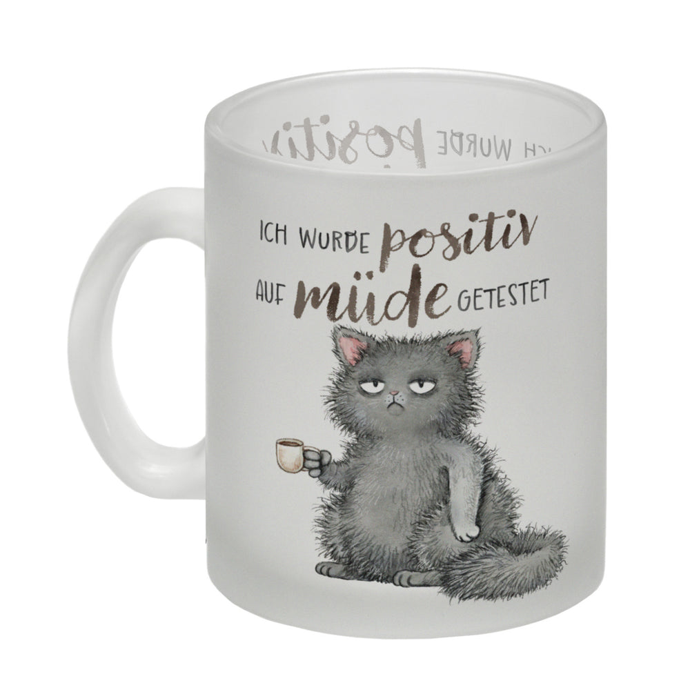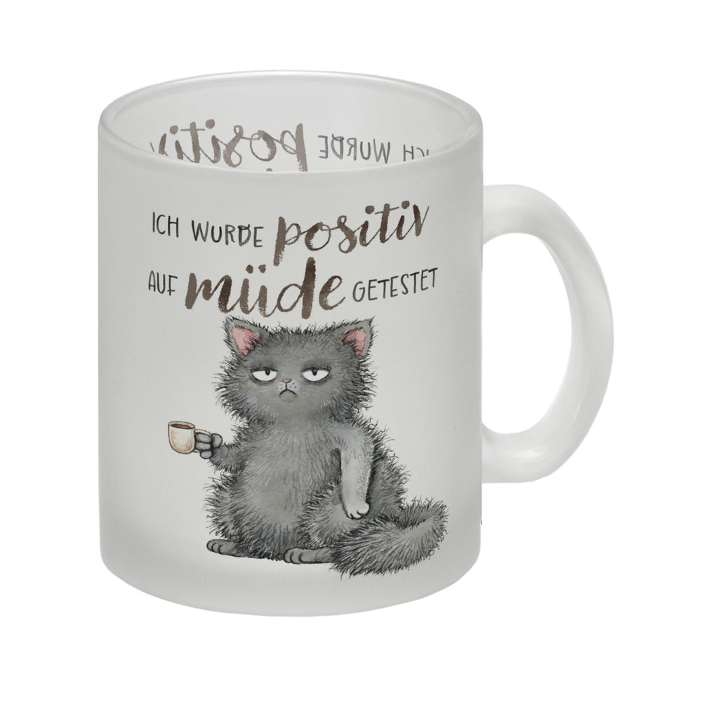 - 1x Katze mit Tasse Kaffeebecher mit Spruch positiv auf müde getestet in der gewählten Ausführung