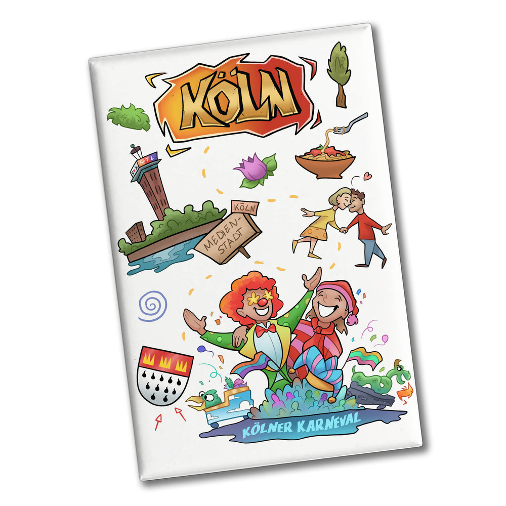 - Der eckige Magnet zeigt ein Köln-Wimmelbild im farbenfrohen Comicstil. Die Motive verbinden Kölner Highlights wie den berühmten Karneval, die Medienstadt und natürlich köstliche Nudelgerichte aus den lokalen Restaurants. Dieser Magnet ist ein kleines Stück Köln, das jeden Kühlschrank aufpeppt.