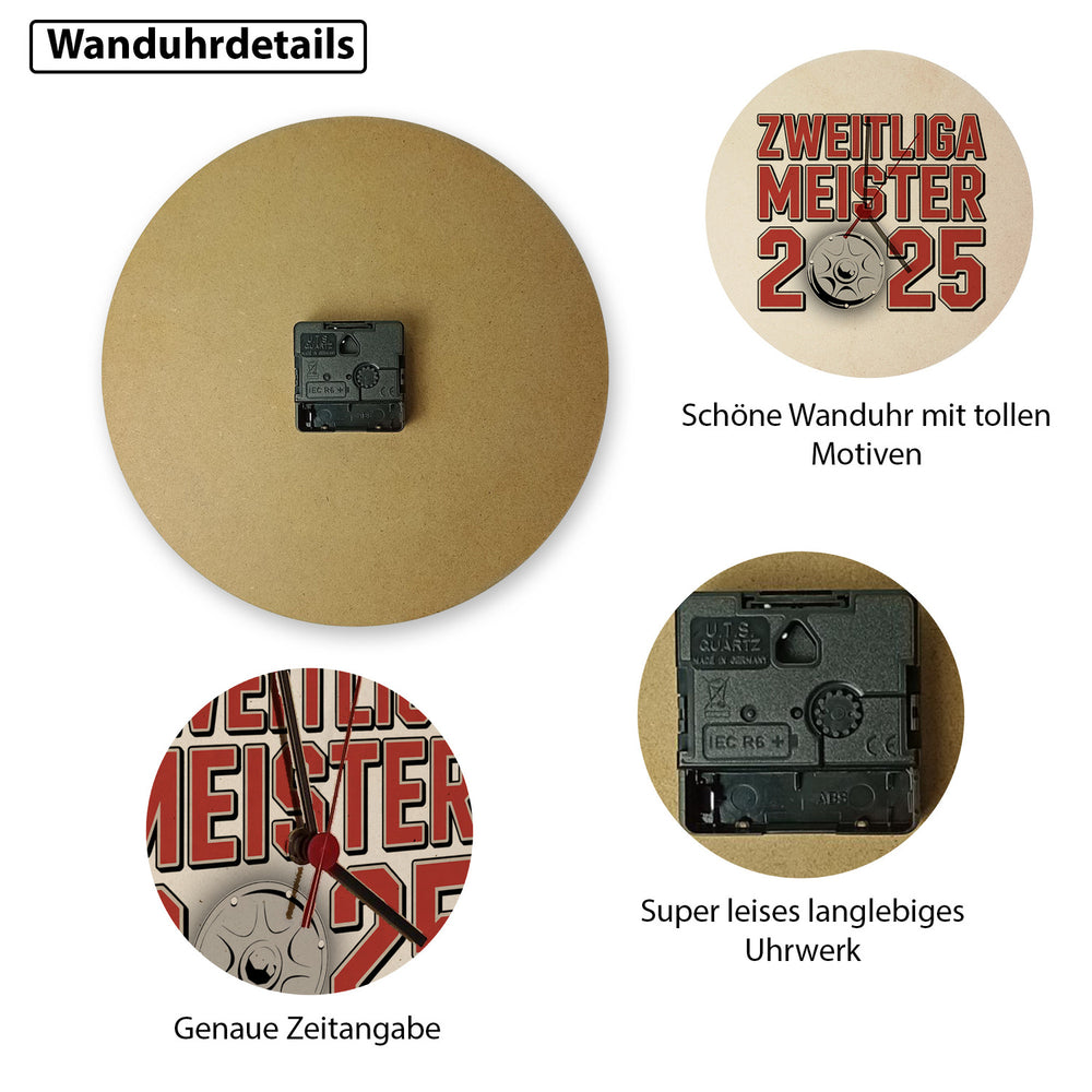 - 1x Köln Zweitliga Meister 2025 Wanduhr mit Meisterschale der 2. Liga Aufsteiger in der gewählten Variante