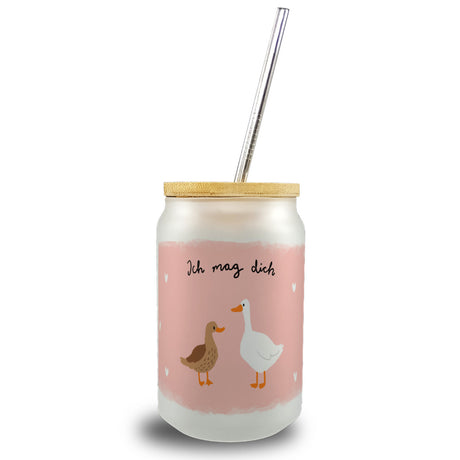 Ente und Gans Trinkglas mit Bambusdeckel mit Spruch Ich mag dich