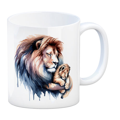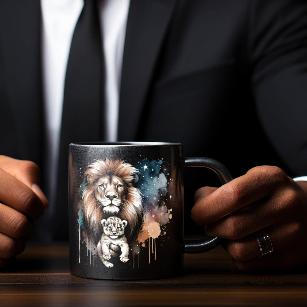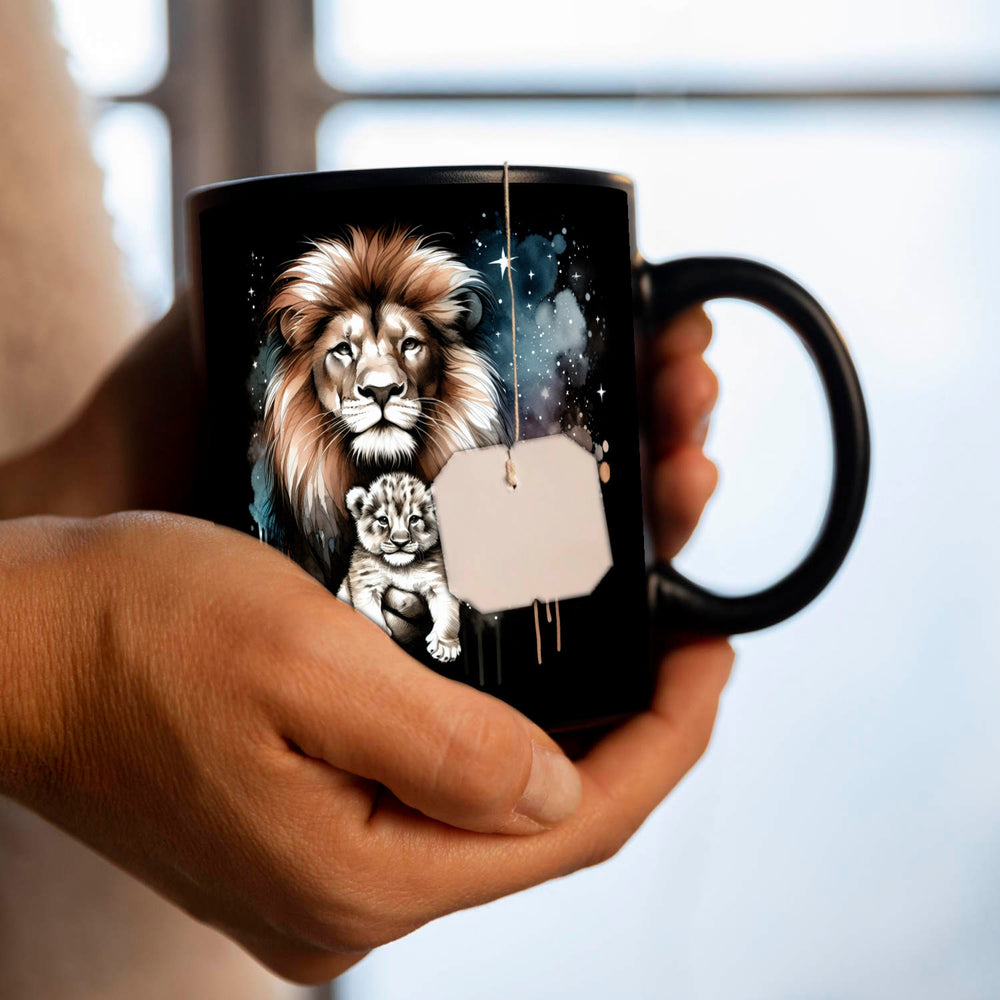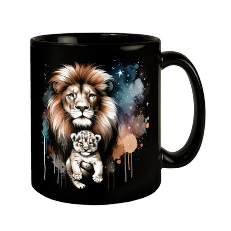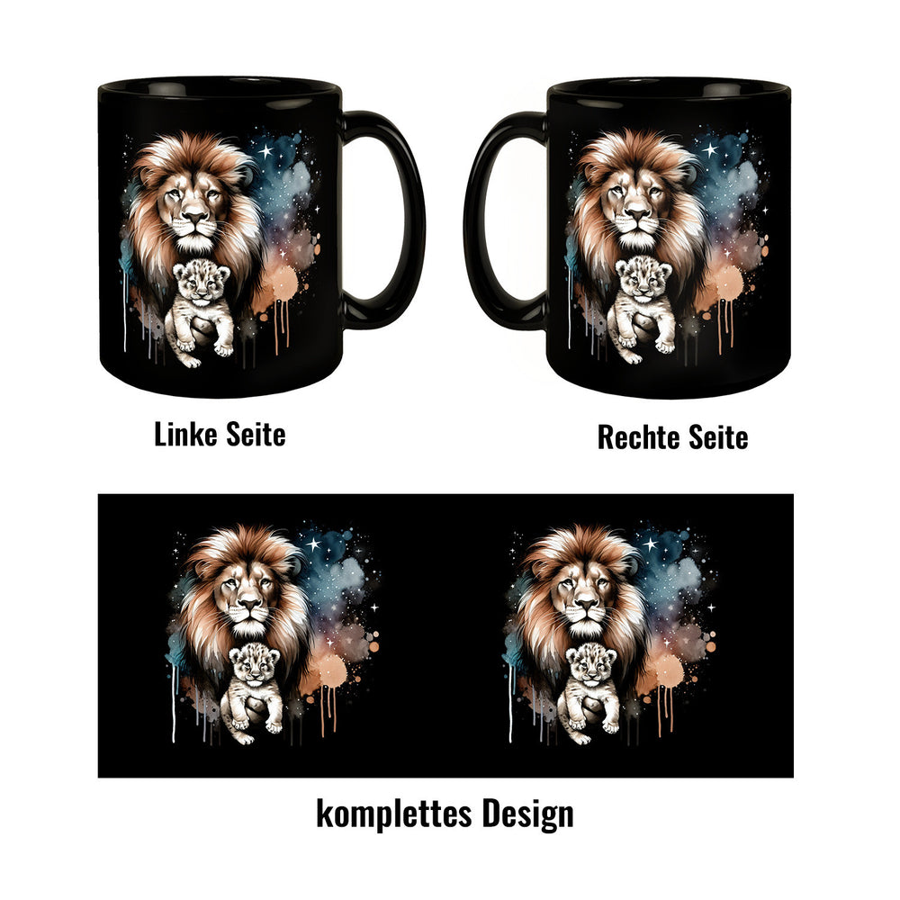 • Werde zum König des Kaffeedschungels mit unserer "Löwe mit Babylöwen Tasse in Schwarz"! Ein majestätisches Raubtier, dargestellt in seiner weichsten Rolle – als stolzer Papa mit seinem Jungtier im Arm. Diese Tasse zelebriert Vaterliebe mit Style.