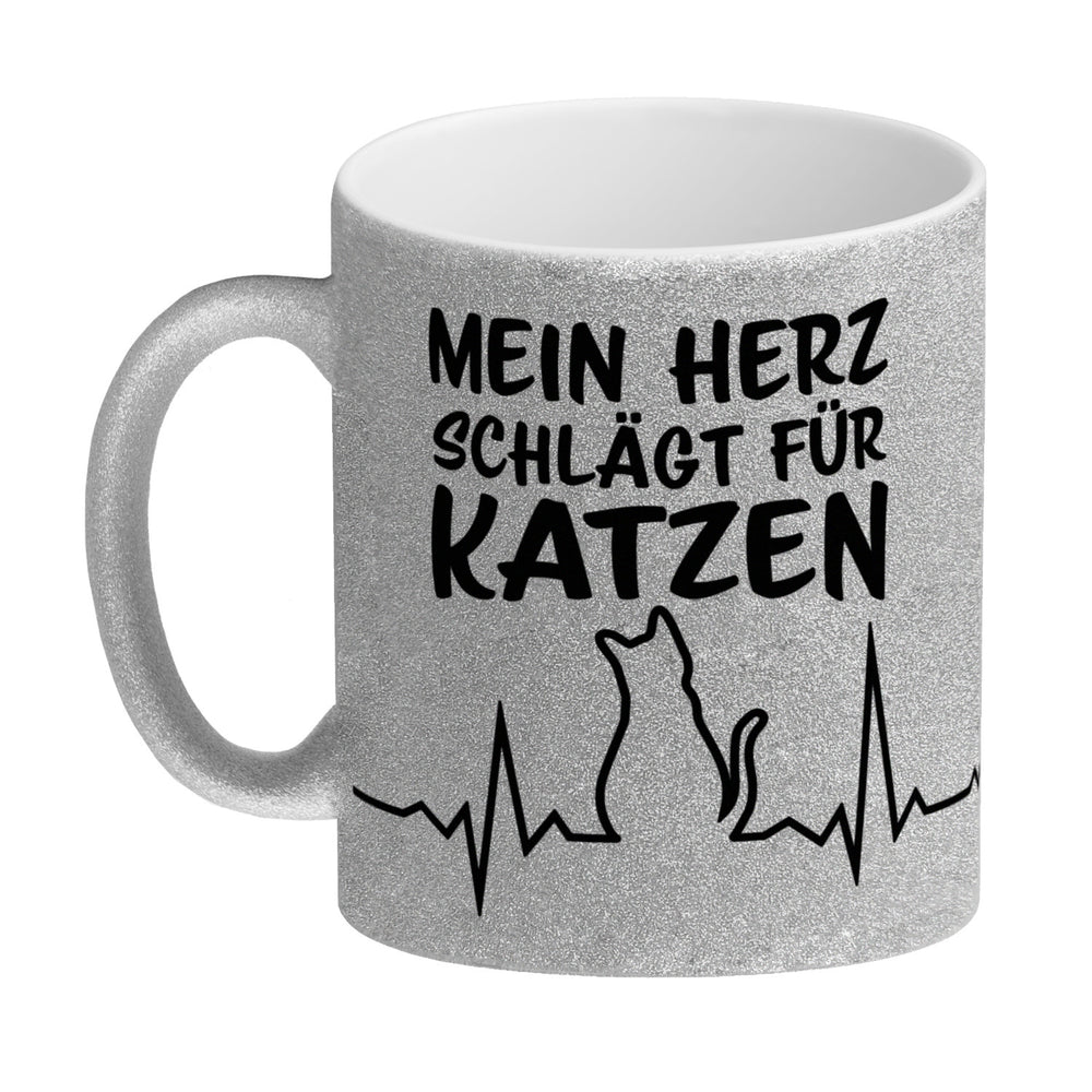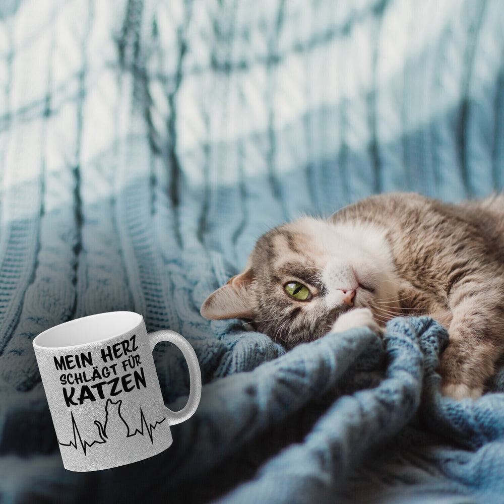 Gönn dir oder deinen Liebsten etwas ganz Besonderes: den Mein Herz schlägt für Katzen Kaffeebecher mit süßem EKG Motiv! Dieser Becher ist ein ideales Geschenk für alle Katzenliebhaber und bietet eine kreative Art, deine Liebe zu Katzen zu zeigen. Er hat ein niedliches EKG Design. Die Silhouette einer Katze wurde in das EKG Gerät des Bechers eingearbeitet und über dem Motiv steht „Mein Herz schlägt für Katzen“. Der Kaffeebecher ist in verschiedenen Varianten erhältlich, wie z.B. als weiße Standardtasse, mit farbigem Henkel und Innenseite, als edle Glastasse oder in der exklusiven Silberedition mit Glitzereffekt. Mit Sorgfalt in Handarbeit hergestellt in unserer Tassen-Manufaktur in Deutschland ist der Kaffeebecher Spülmaschinenfest und du kannst ihn im Büro oder Zuhause benutzen! Zeige allen, dass dein Herz für Katzen schlägt - Kaufe jetzt den Mein Herz schlägt für Katzen Kaffeebecher mit süßem EKG Motiv!