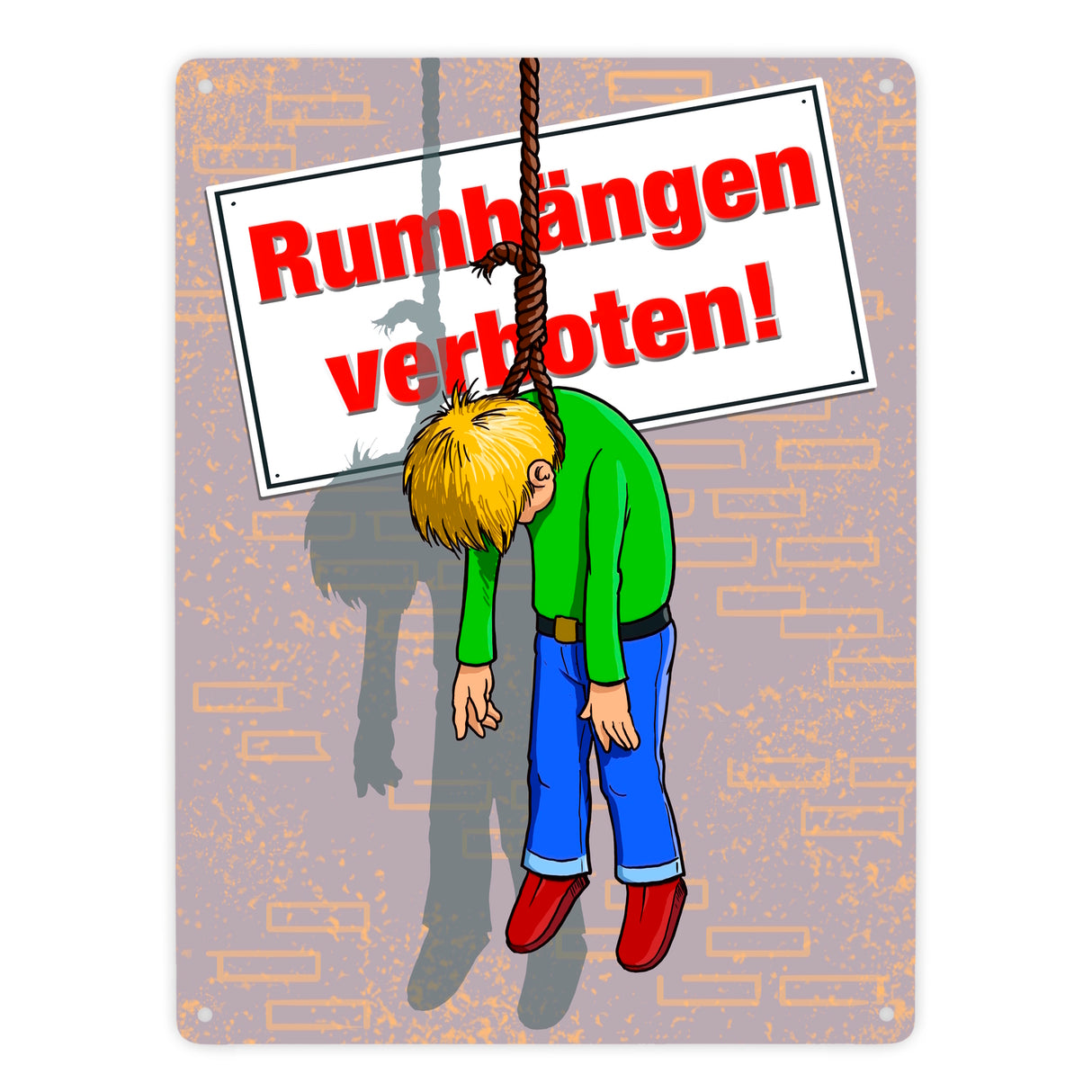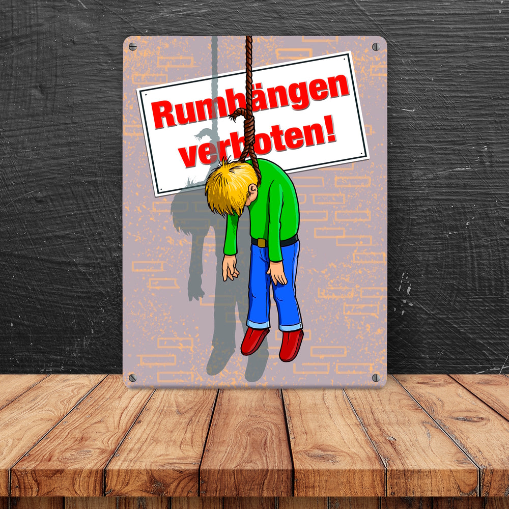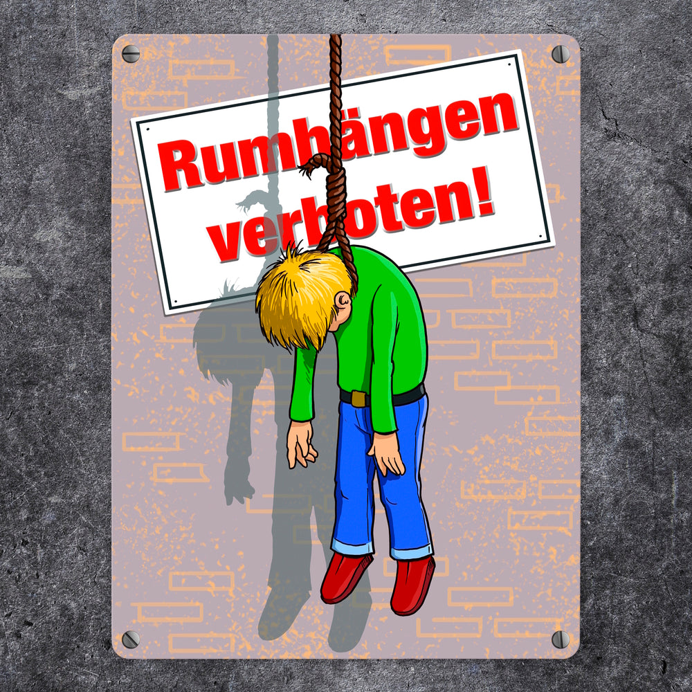 - 1x Metallschild Rumhängen verboten! Galgenhumor Henkersknoten erhängt Comic in der gewählten Größe